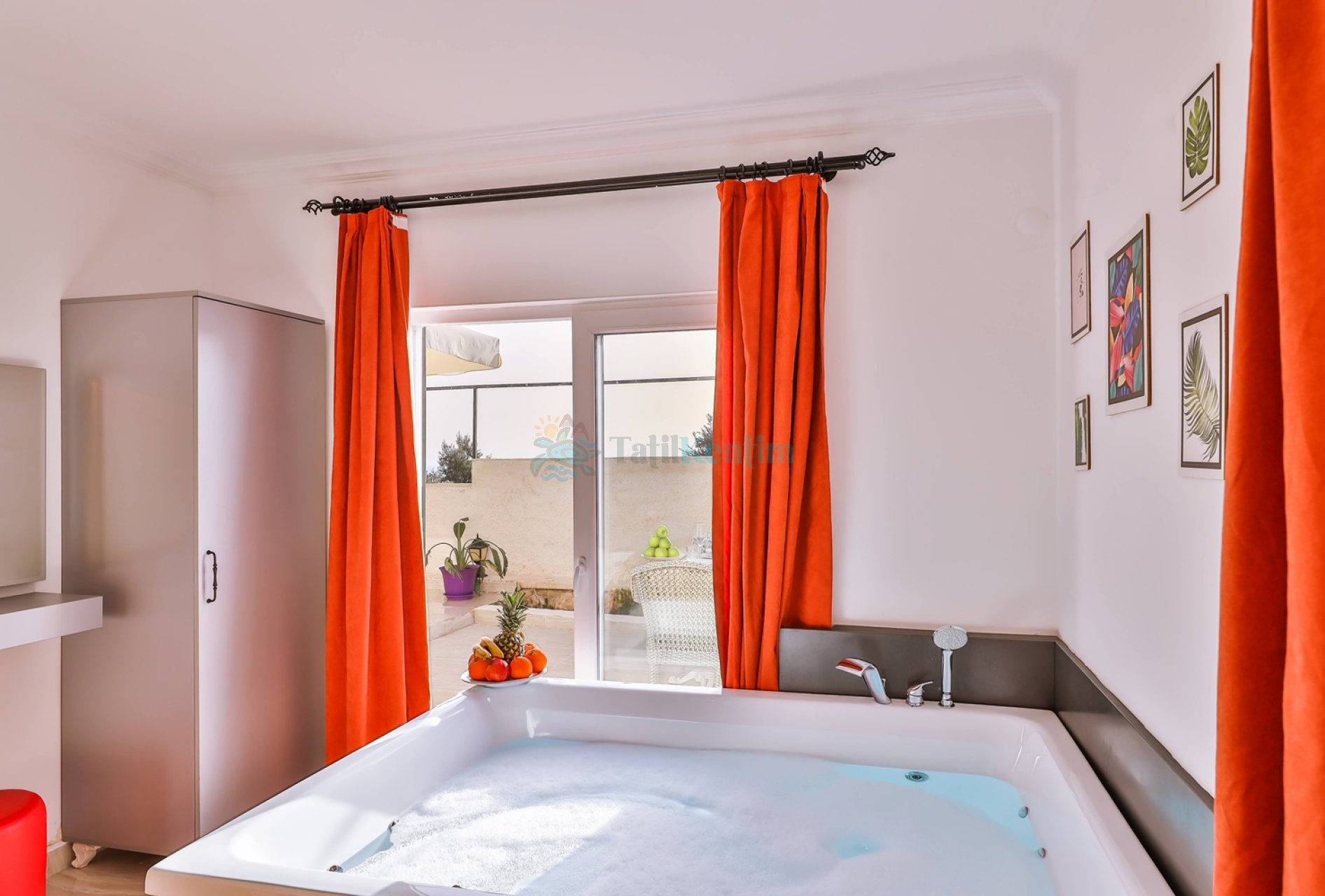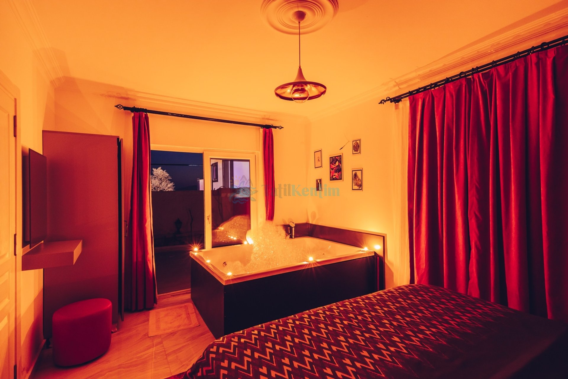 1.Yatak odası: Tatil villamıza ait bu yatak odası içerisinde; 1 adet çift kişilik yatak, klima, elbise dolabı, komodin, jakuzi, makyaj masası, banyo ve tuvalet yer almaktadır.