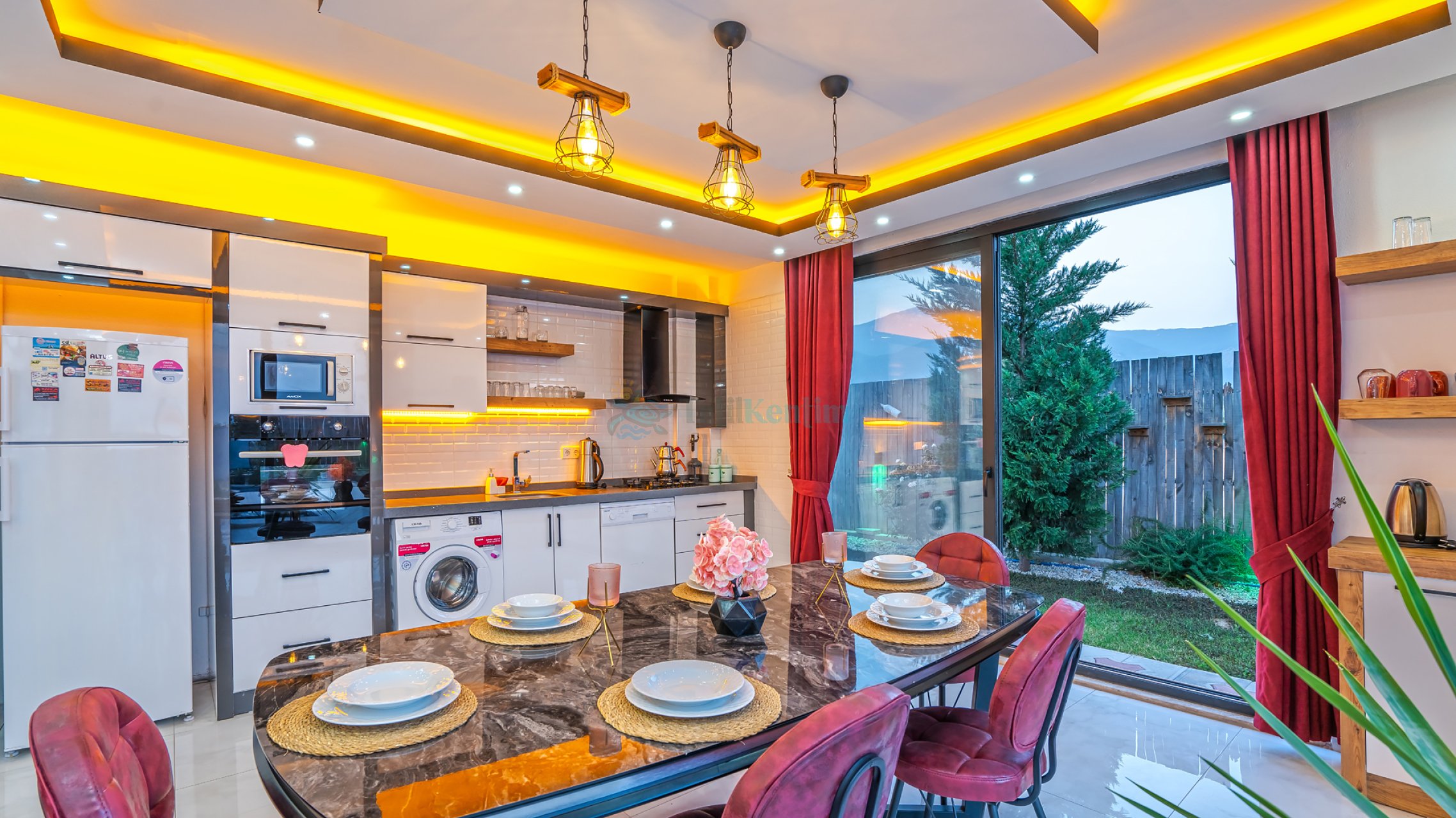 Yazlığımızın Amerikan mutfağı içerisinde, mama sandalyesi, buzdolabı, bulaşık makinası, çamaşır makinası, yemek masası, yemek takımı, ankastre fırın, ankastre ocak, çaydanlık, su ısıtıcısı, tava, tencere takımı ve gerekli olan tüm mutfak gereçleri yer almaktadır.