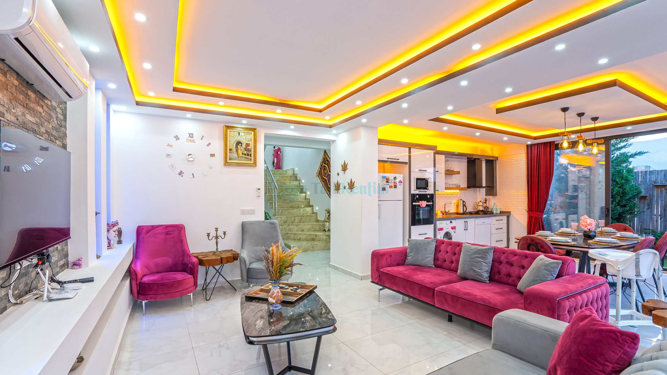 Villamızın salonu içerisinde, koltuk takımı, orta sehpa, TV, TV ünitesi, klima, uydu alıcısı yer almaktadır.