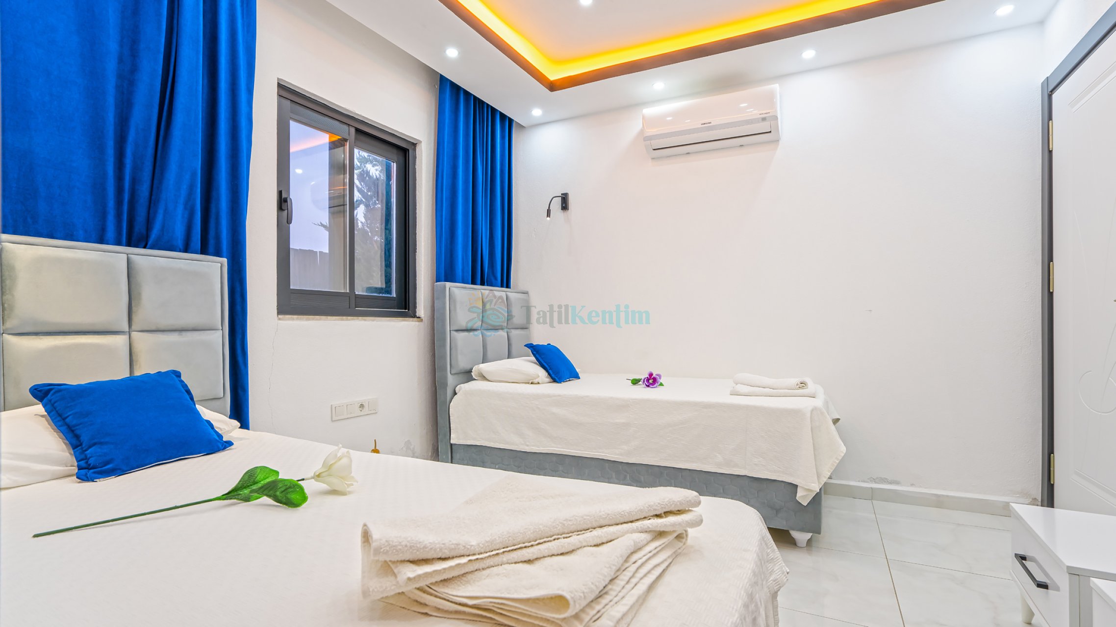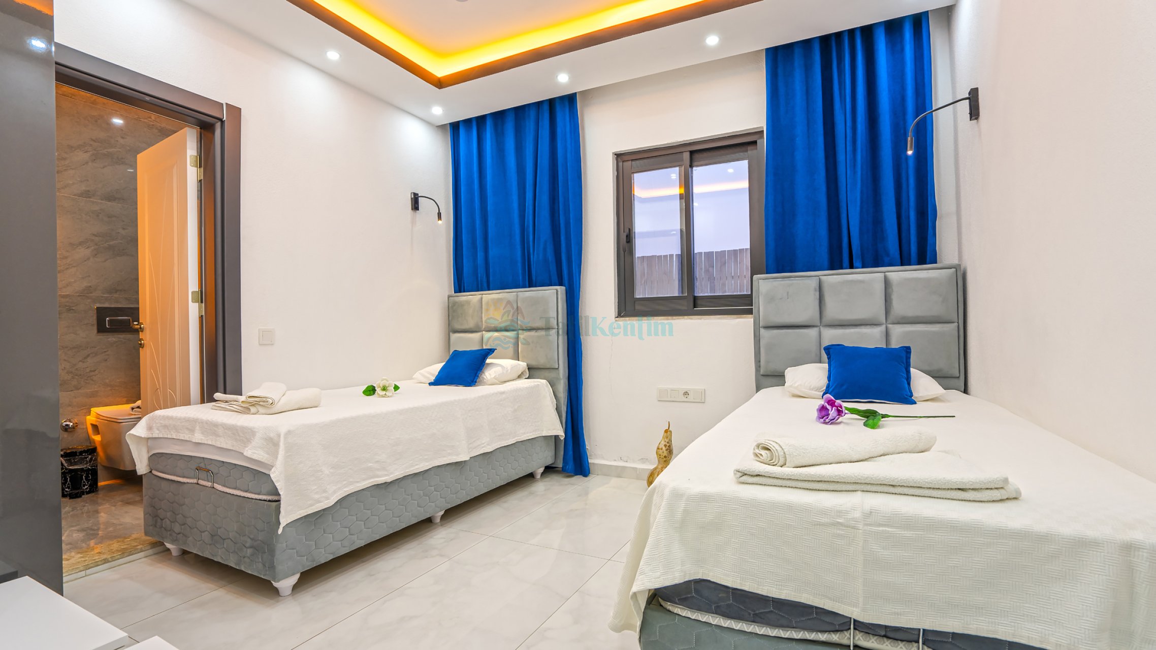Villamızın bu odasında 2 adet tek kişilik yatak , klima , elbise dolabı, makyaj masası, banyo ve tuvalet bulunmaktadır.