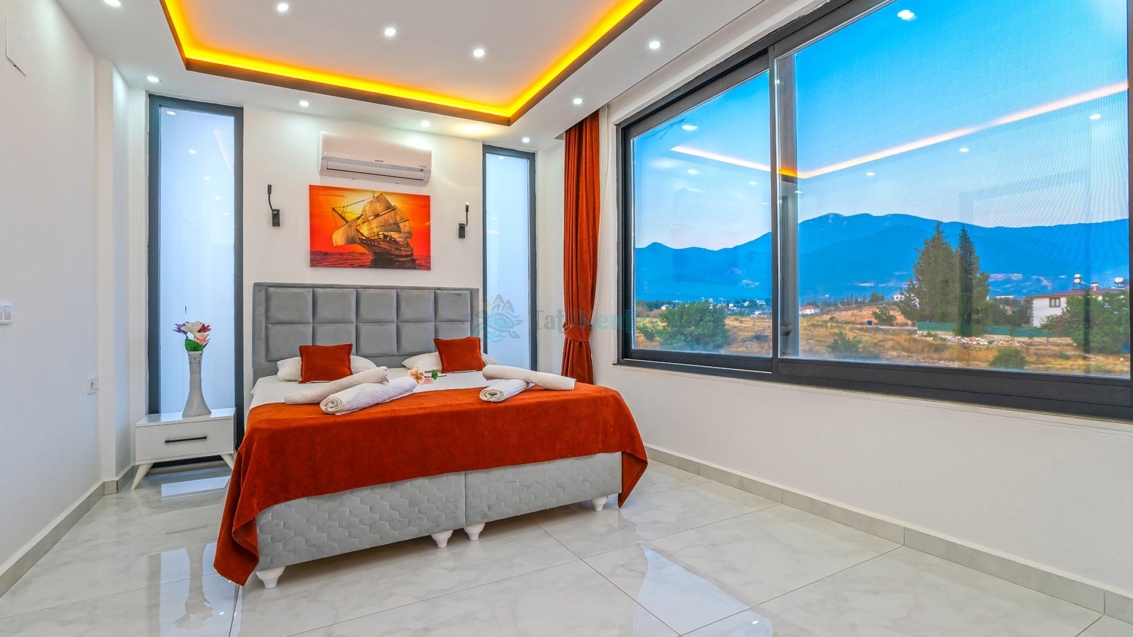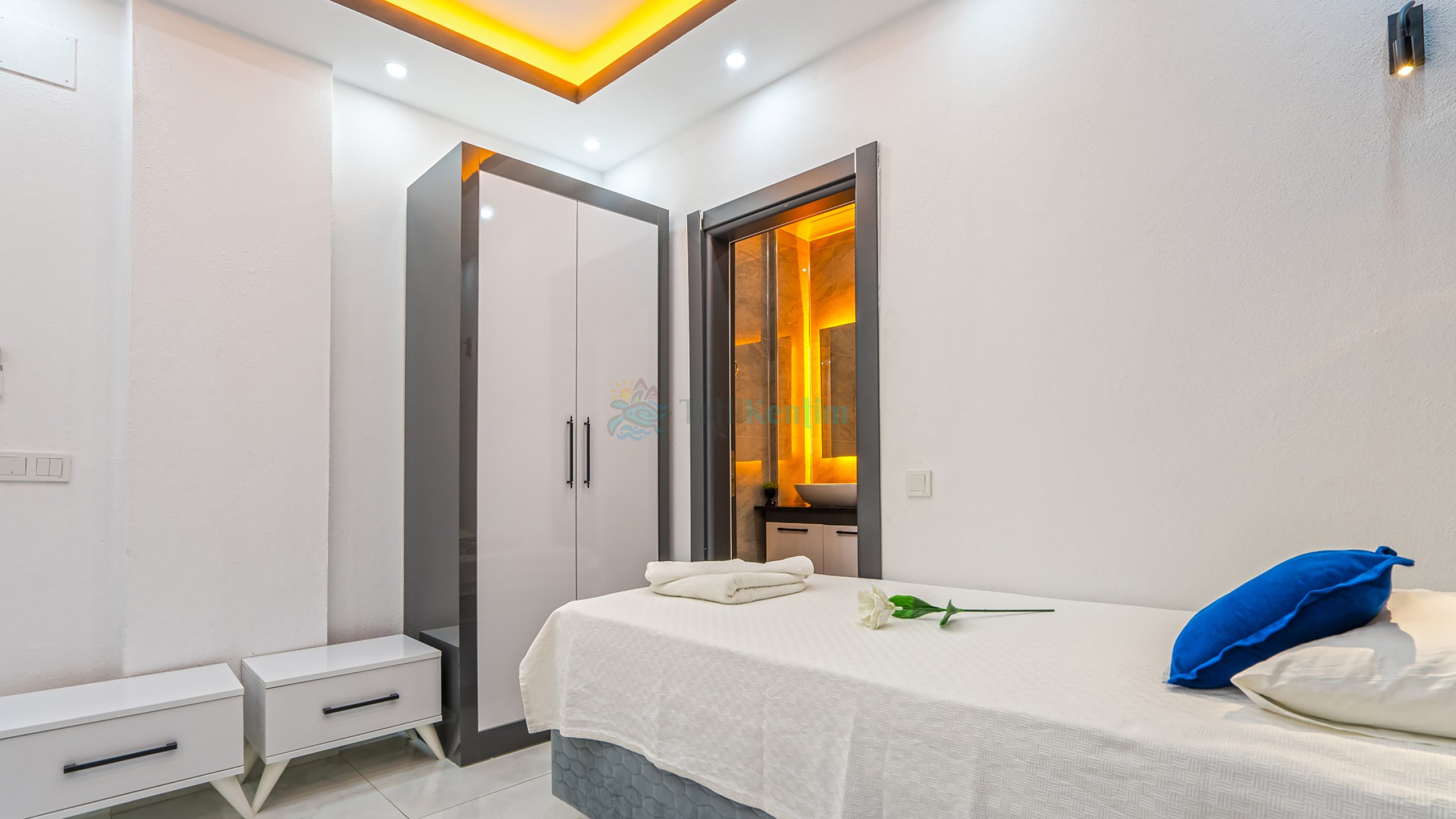 Kiralık villanın bu yatak odası içerisinde, 1 adet çift kişilik yatak, klima, elbise dolabı, komodin, makyaj masası, banyo ve tuvalet bulunmaktadır.