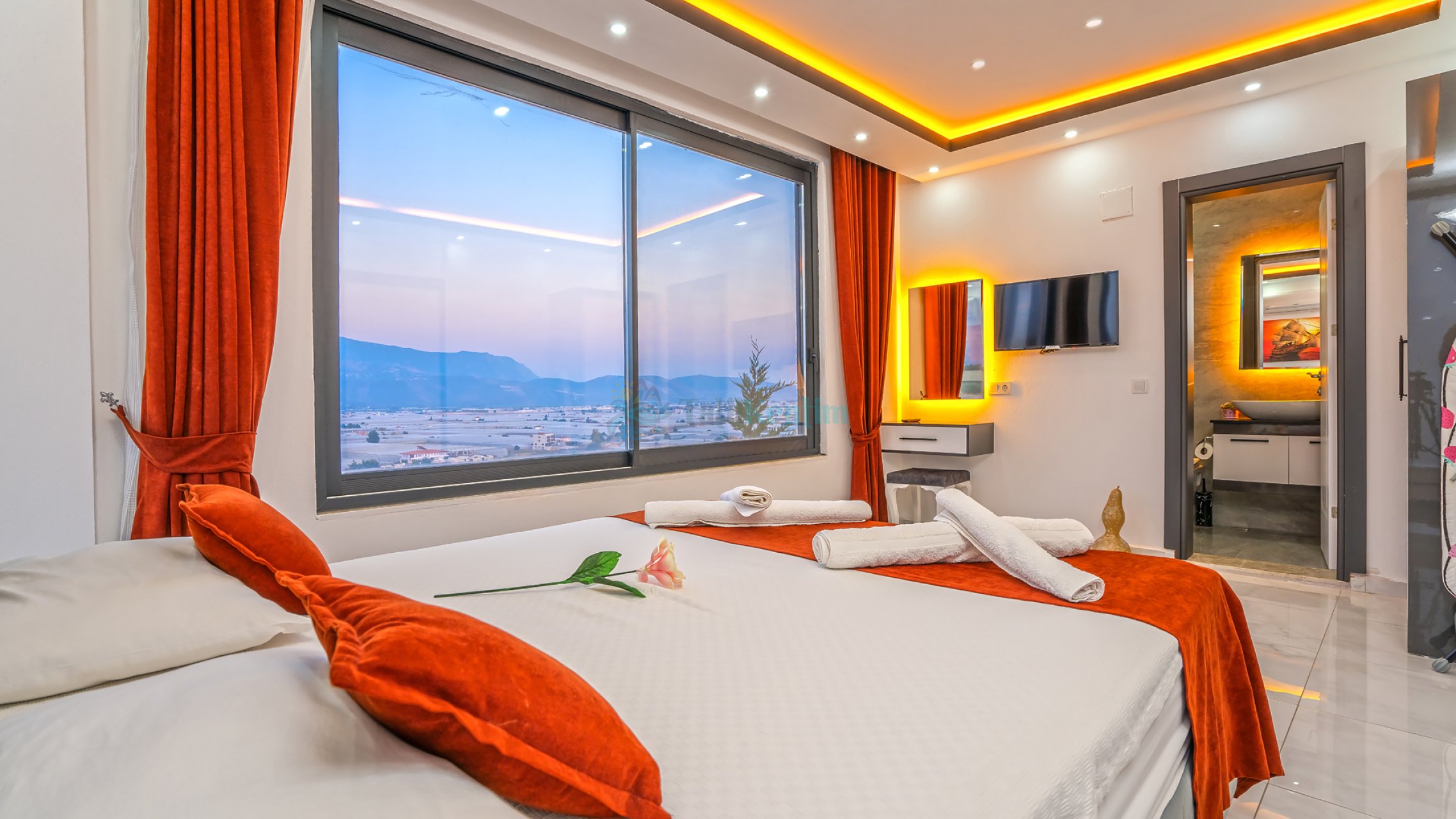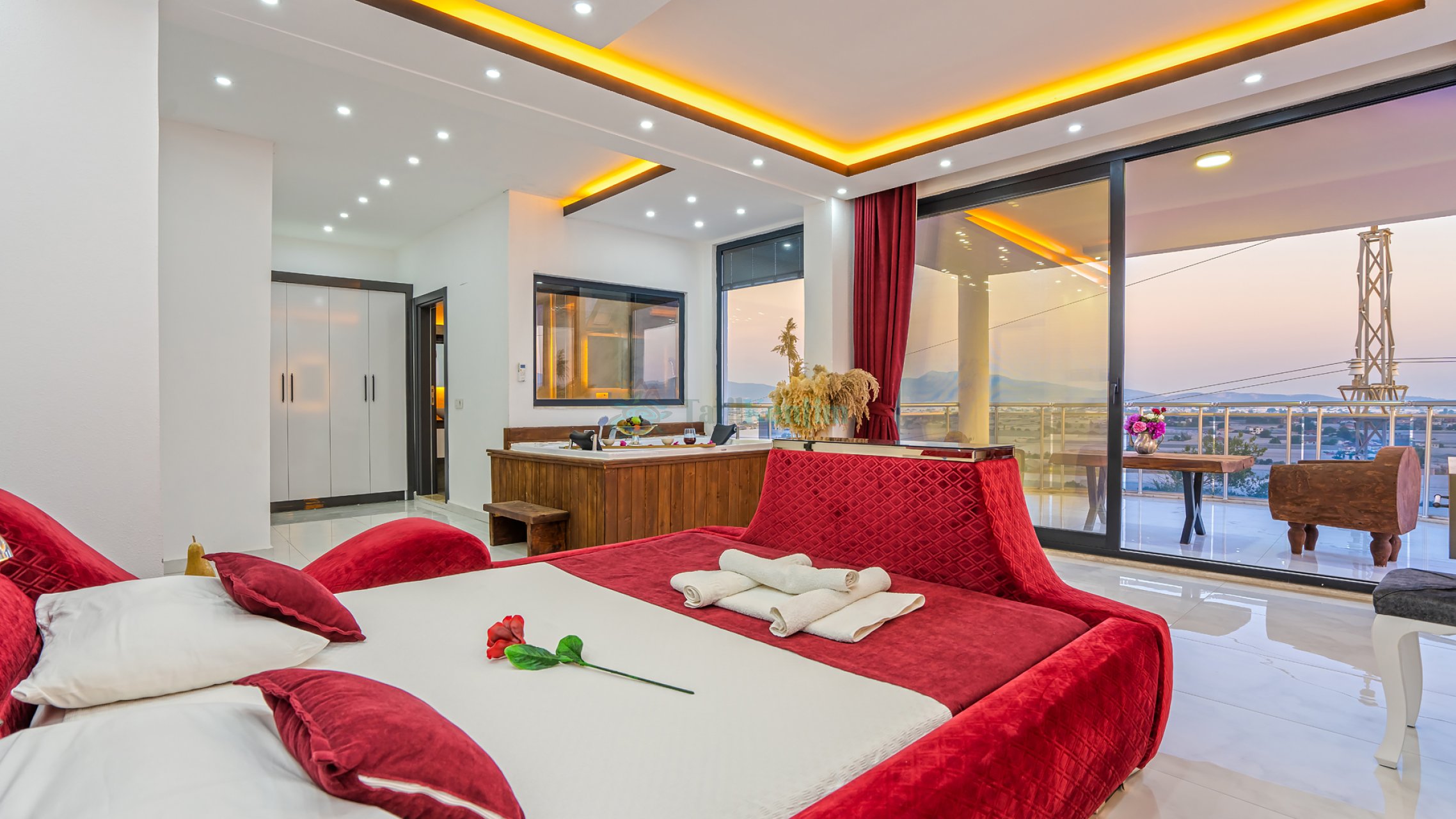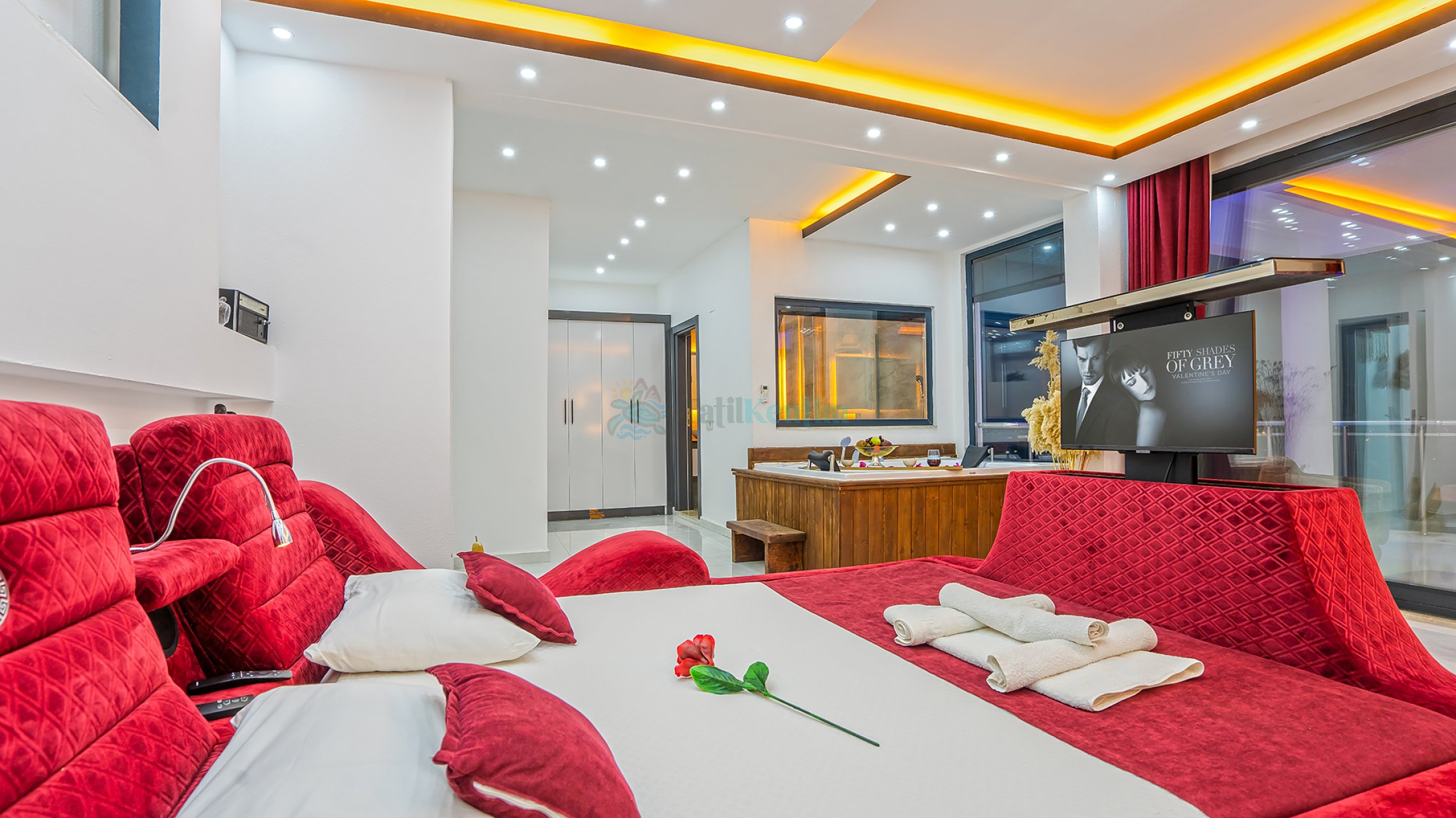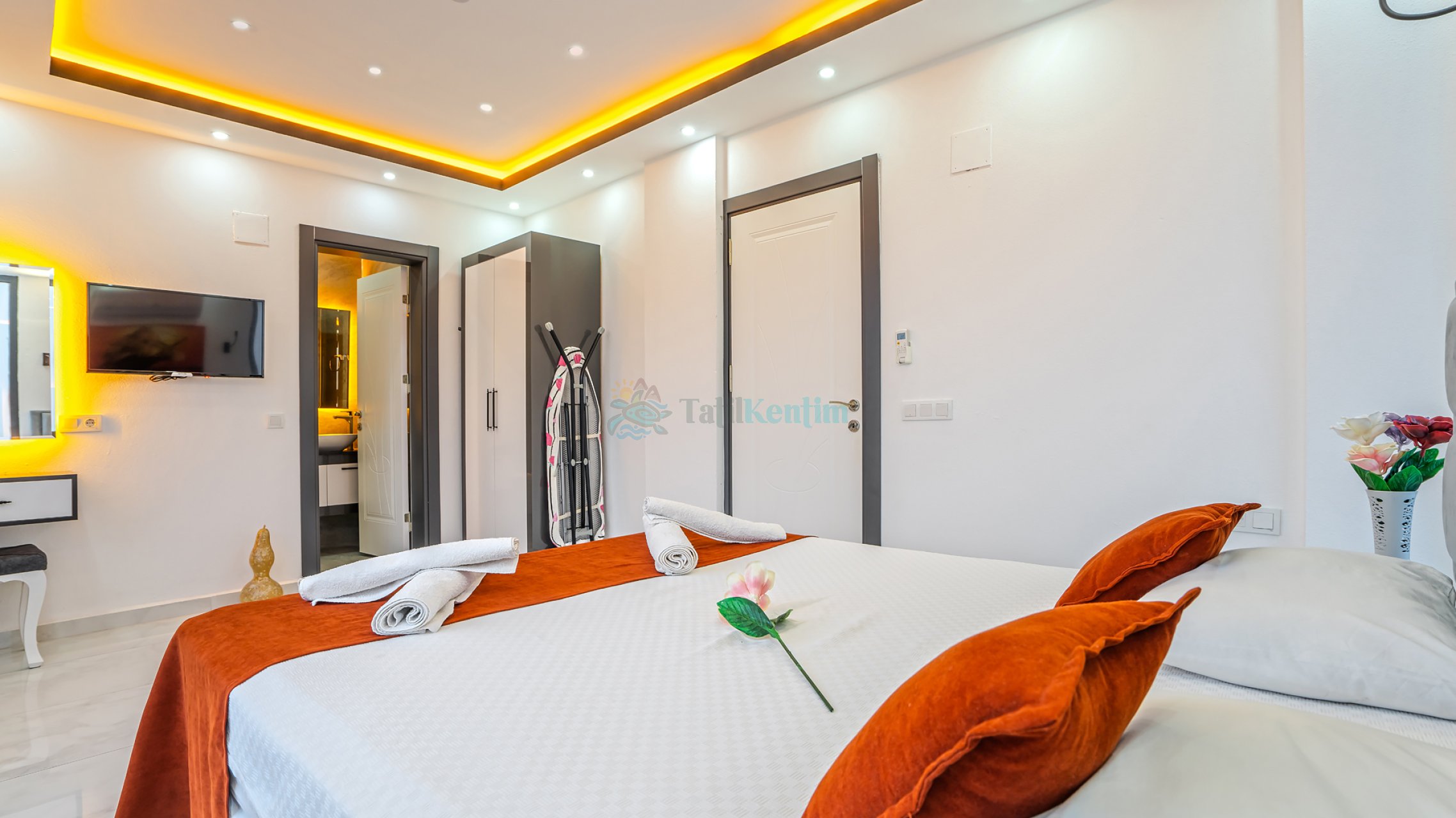 Tatil villamıza ait bu yatak odası içerisinde, 1 adet çift kişilik yatak, klima, elbise dolabı, komodin, jakuzi, TV, makyaj masası, banyo ve tuvalet bulunmaktadır.
