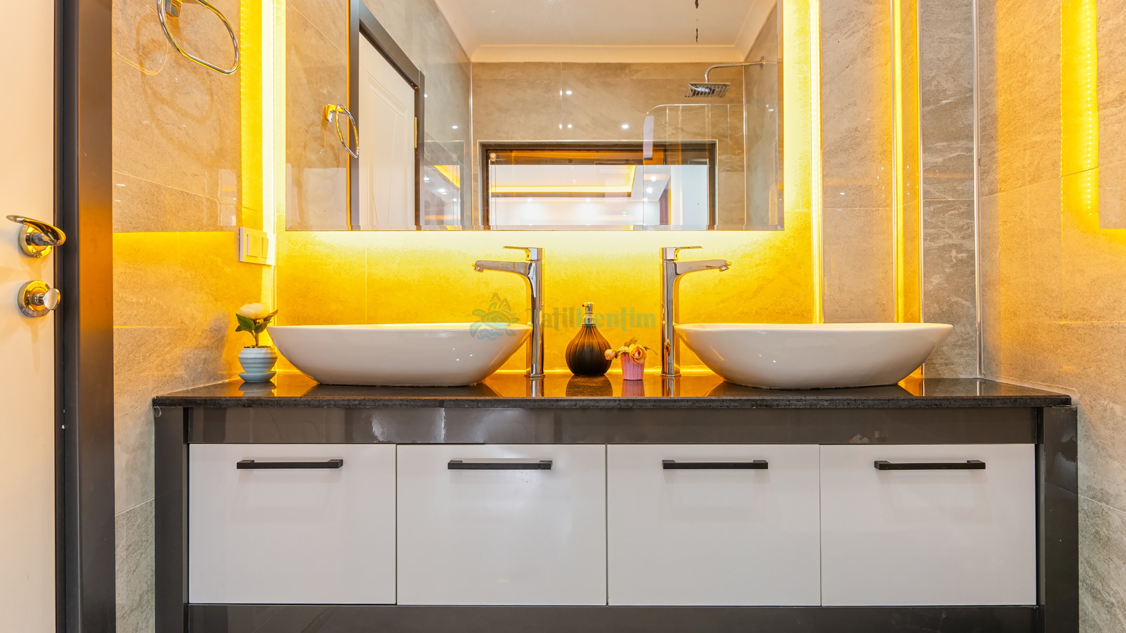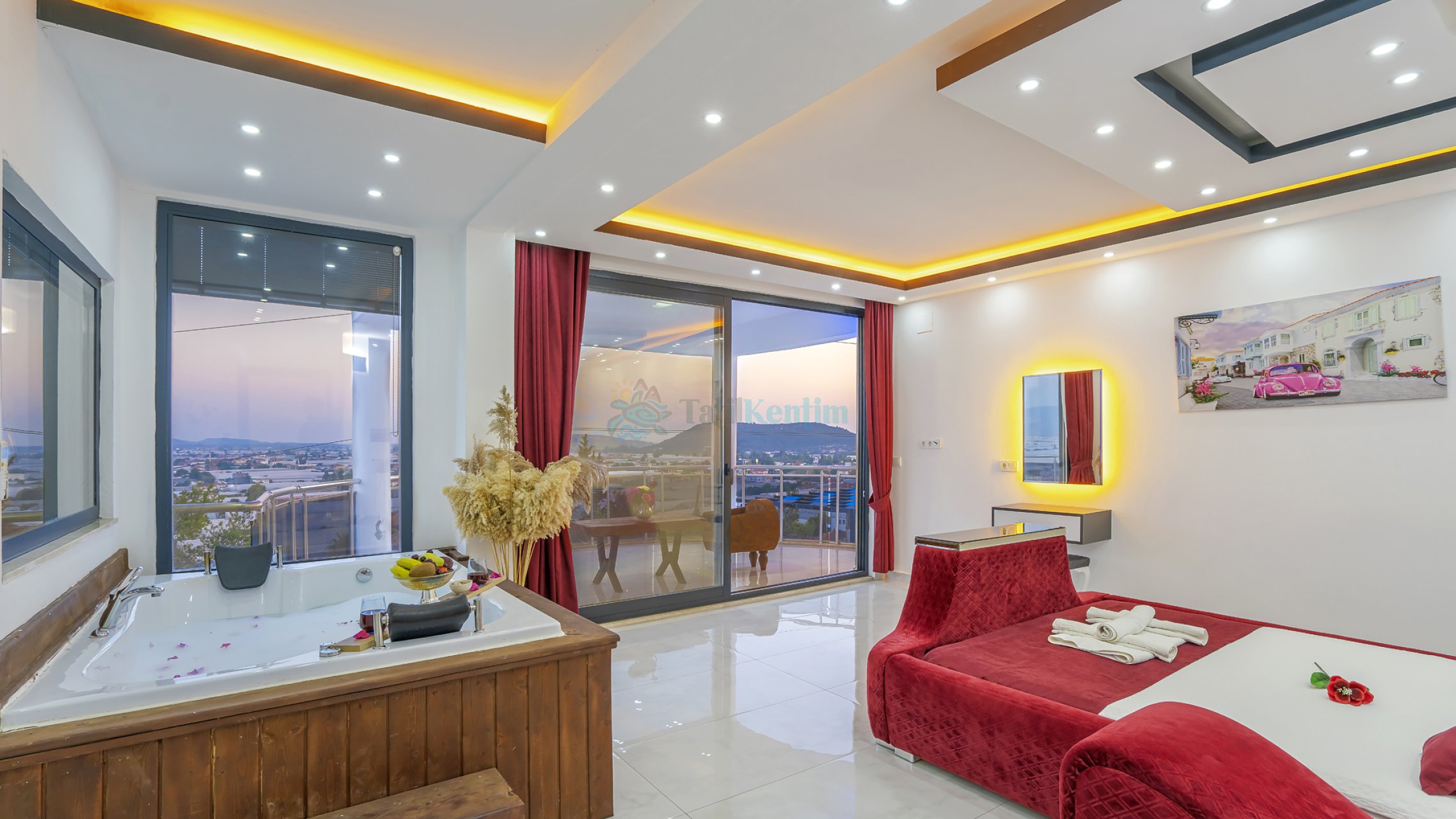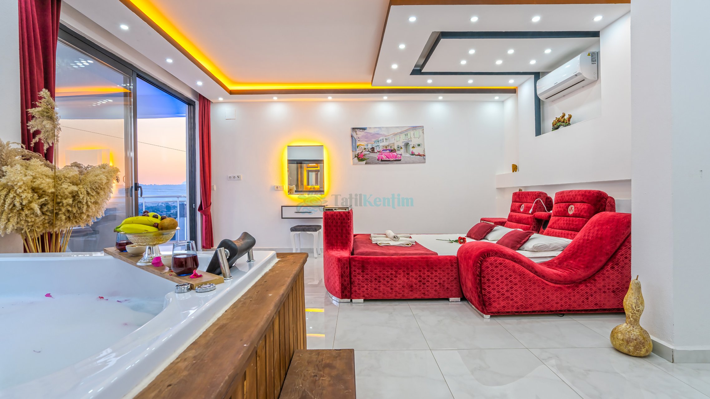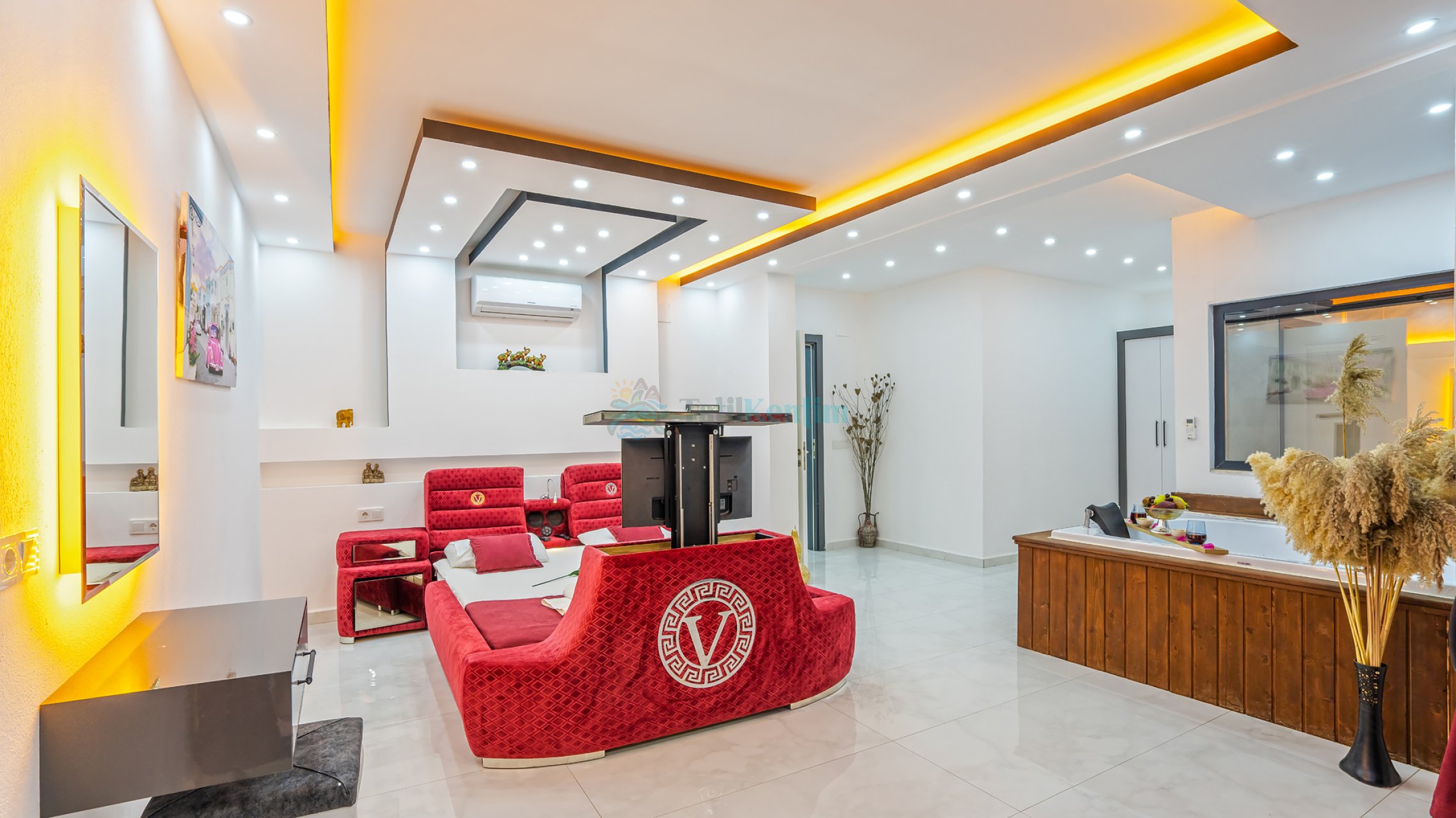 Tatil villamıza ait bu yatak odası içerisinde, 1 adet çift kişilik yatak, klima, elbise dolabı, komodin, jakuzi, TV, makyaj masası, banyo ve tuvalet bulunmaktadır.