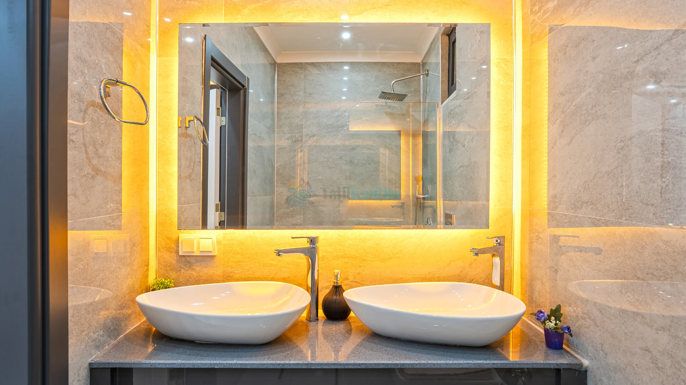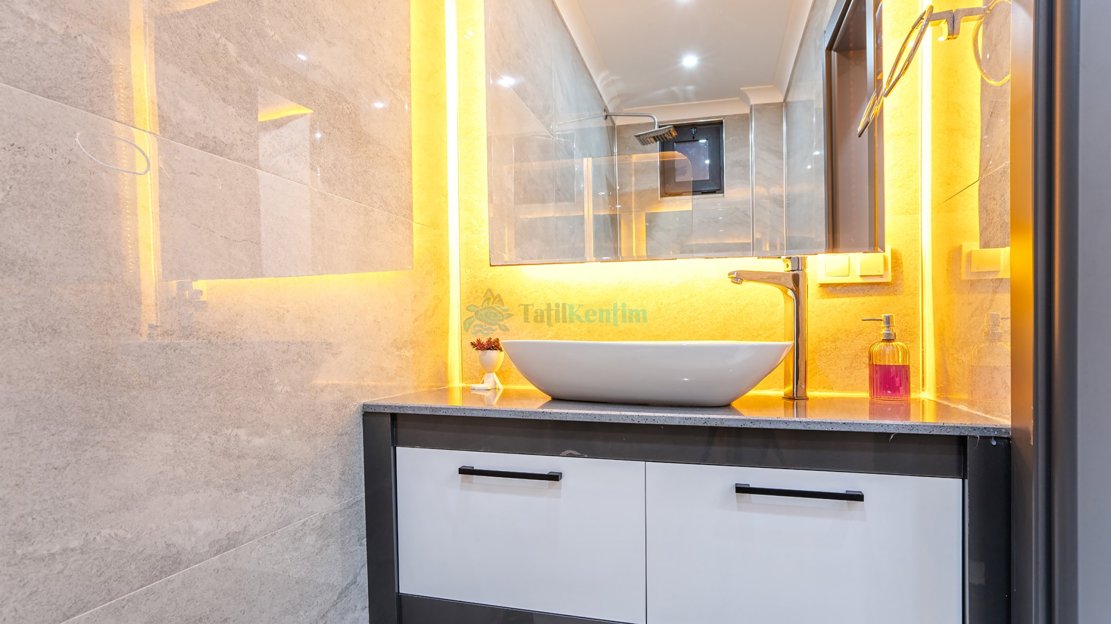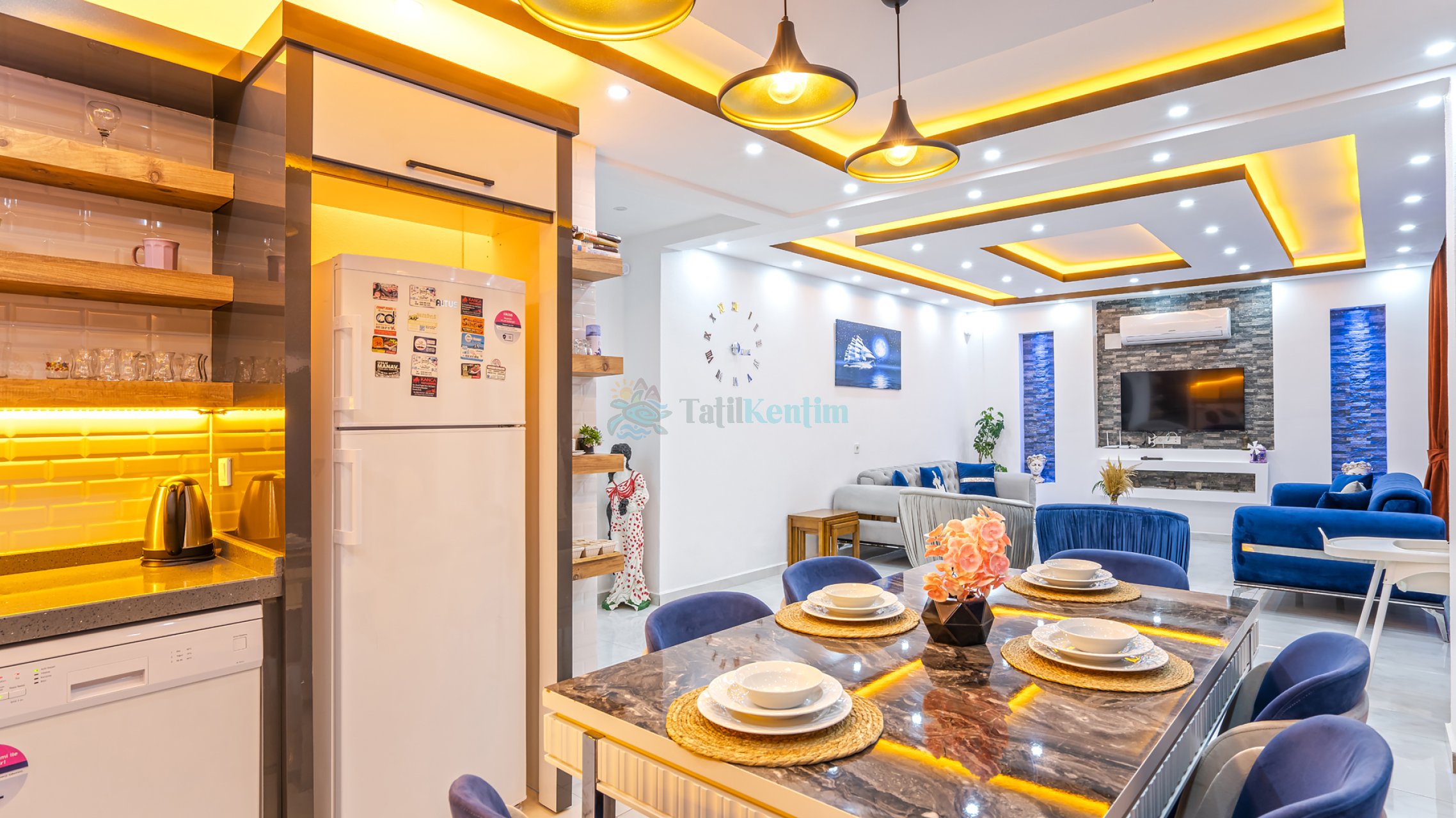 Amerikan mutfak içerisinde, buzdolabı, bulaşık makinası, çamaşır makinası, yemek masası, yemek takımı, ankastre fırın, mikrodalga fırın, ankastre ocak, çaydanlık, su ısıtıcısı, tava, tencere takımı ve gerekli olan tüm mutfak gereçleri yer almaktadır.
