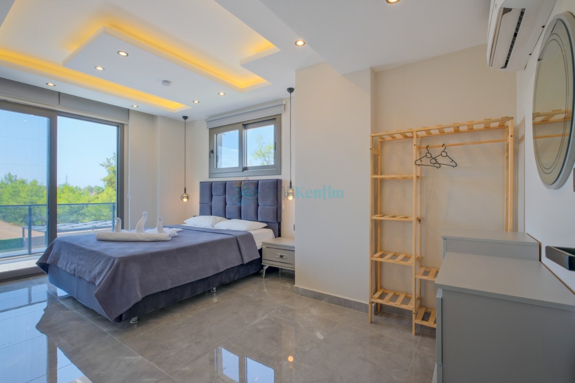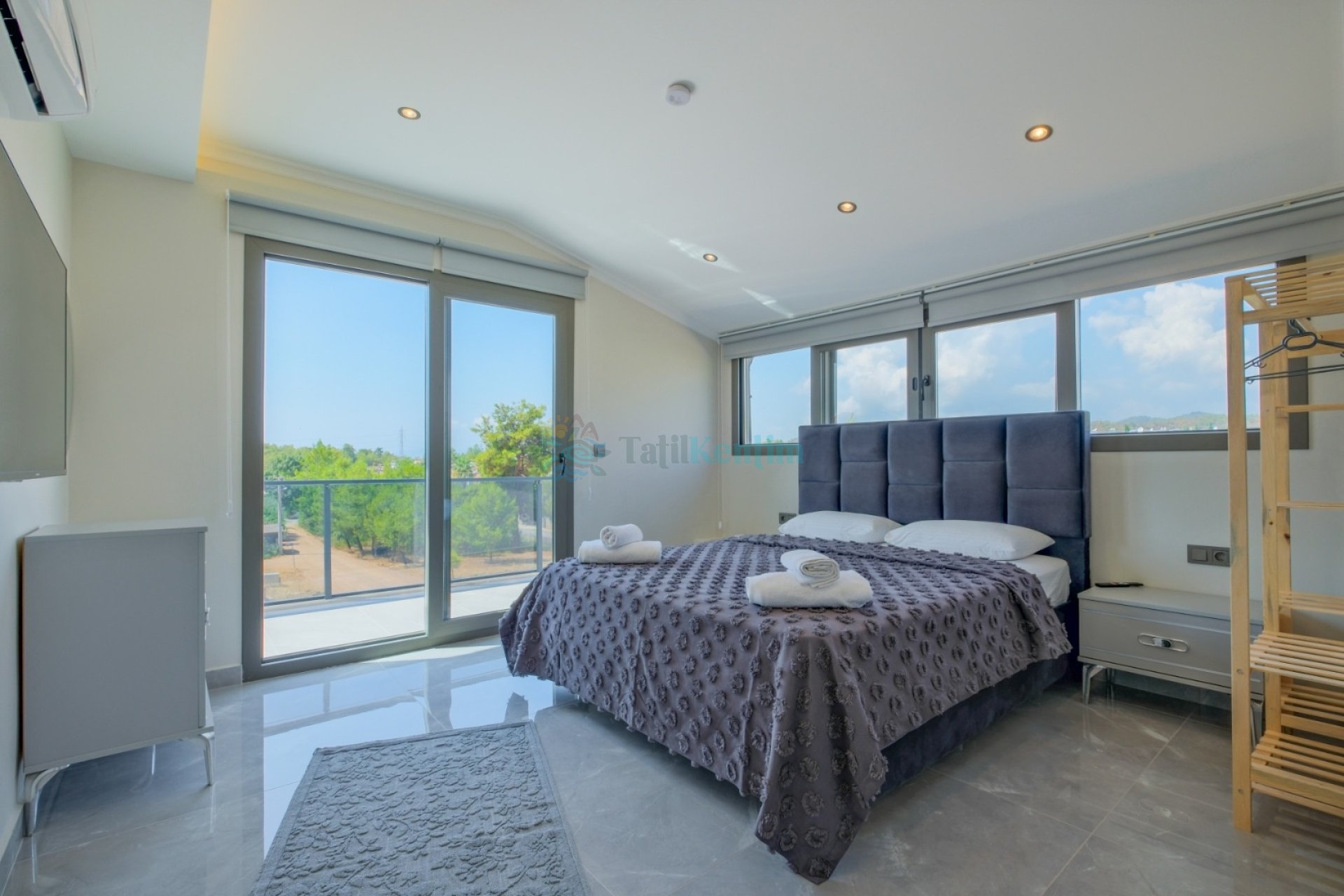 Kiralık villanın bu yatak odası içerisinde, 1 adet çift kişilik yatak, klima, elbise dolabı, komodin, makyaj masası, banyo ve tuvalet bulunmaktadır.