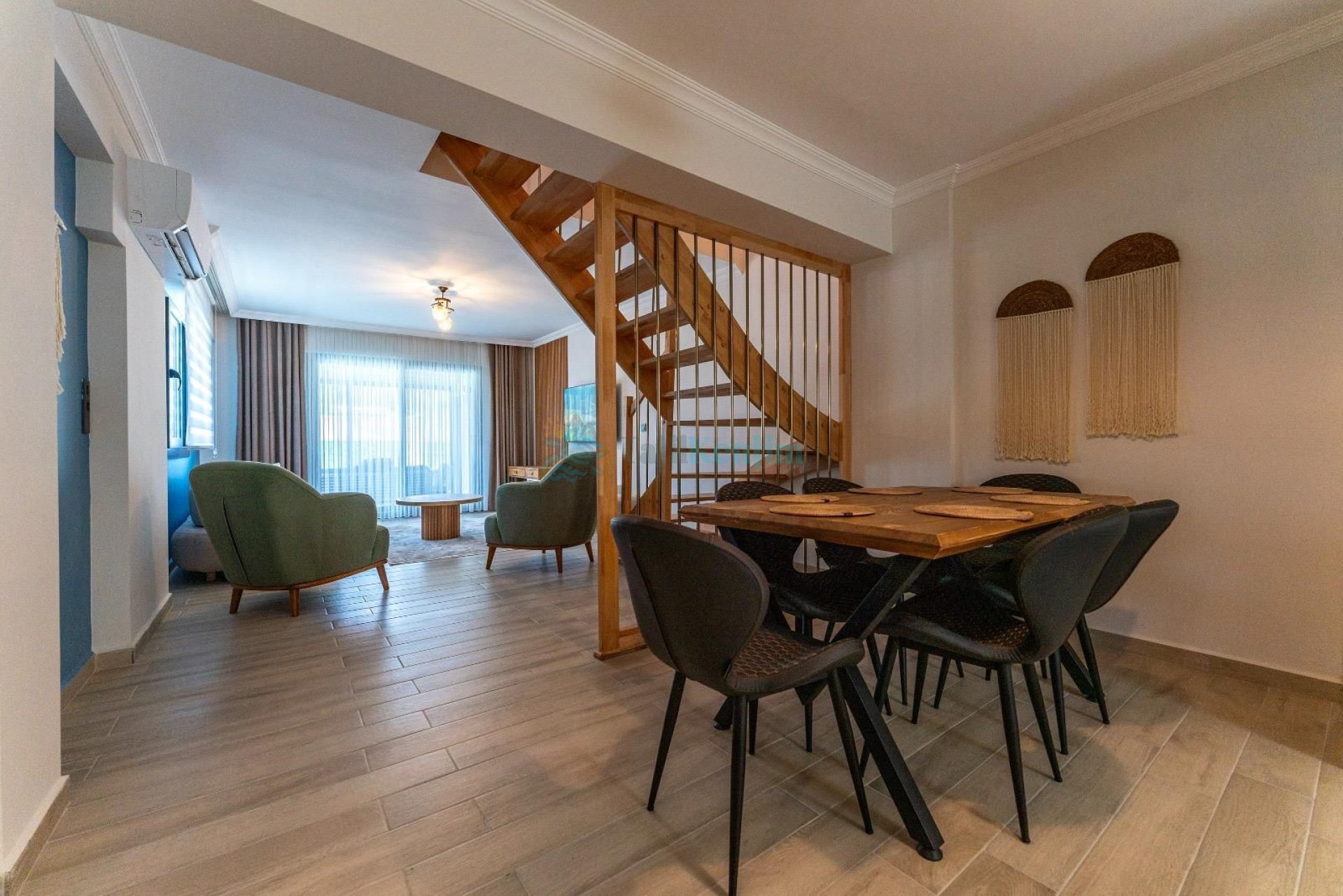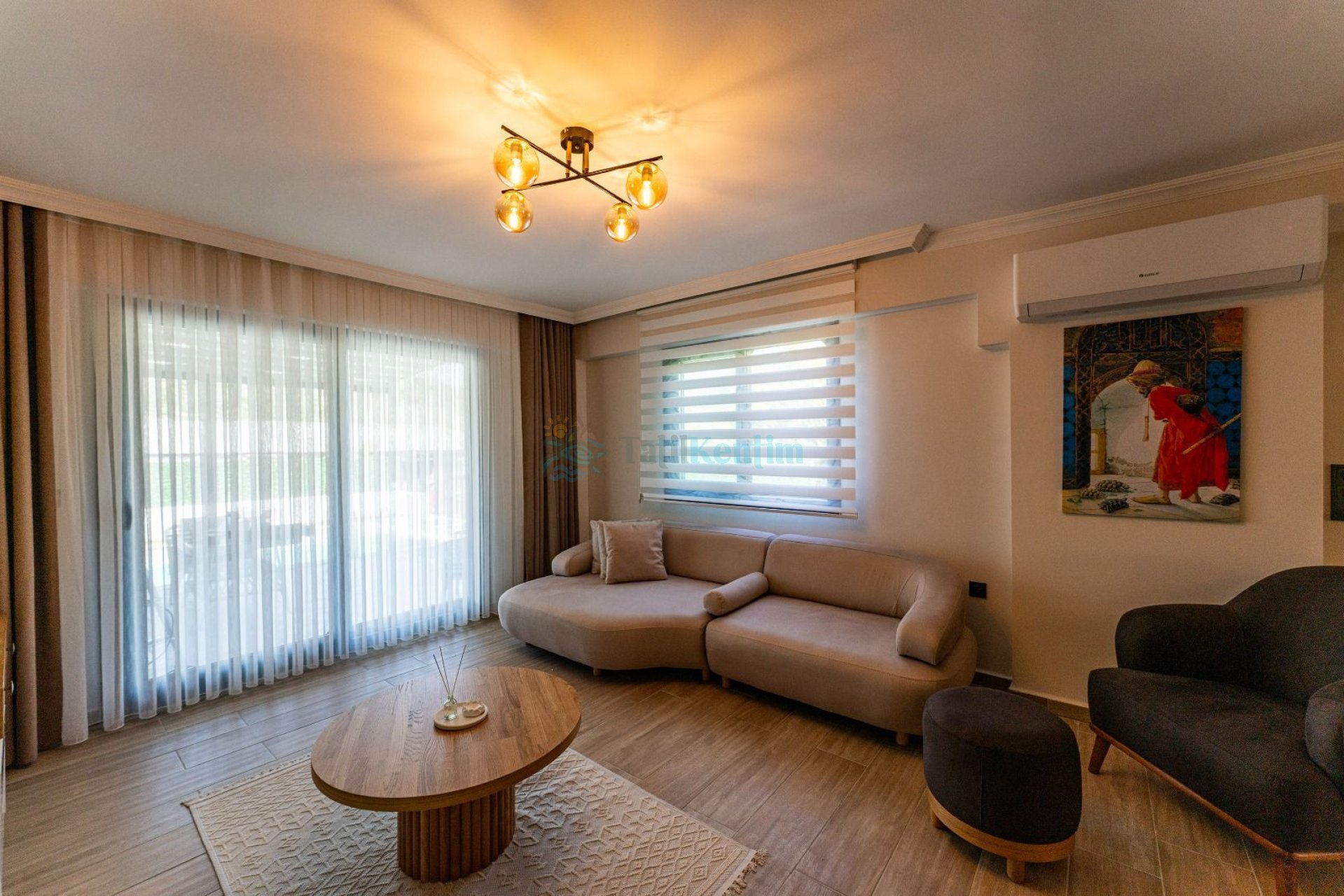 Modern şık oturma grubu, klima, televizyon, orta sehpa, yemek masası, yer almaktadır.