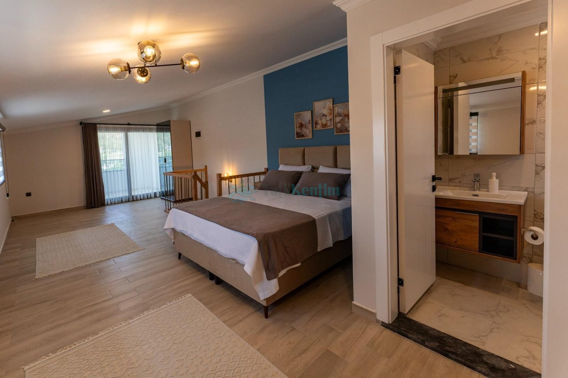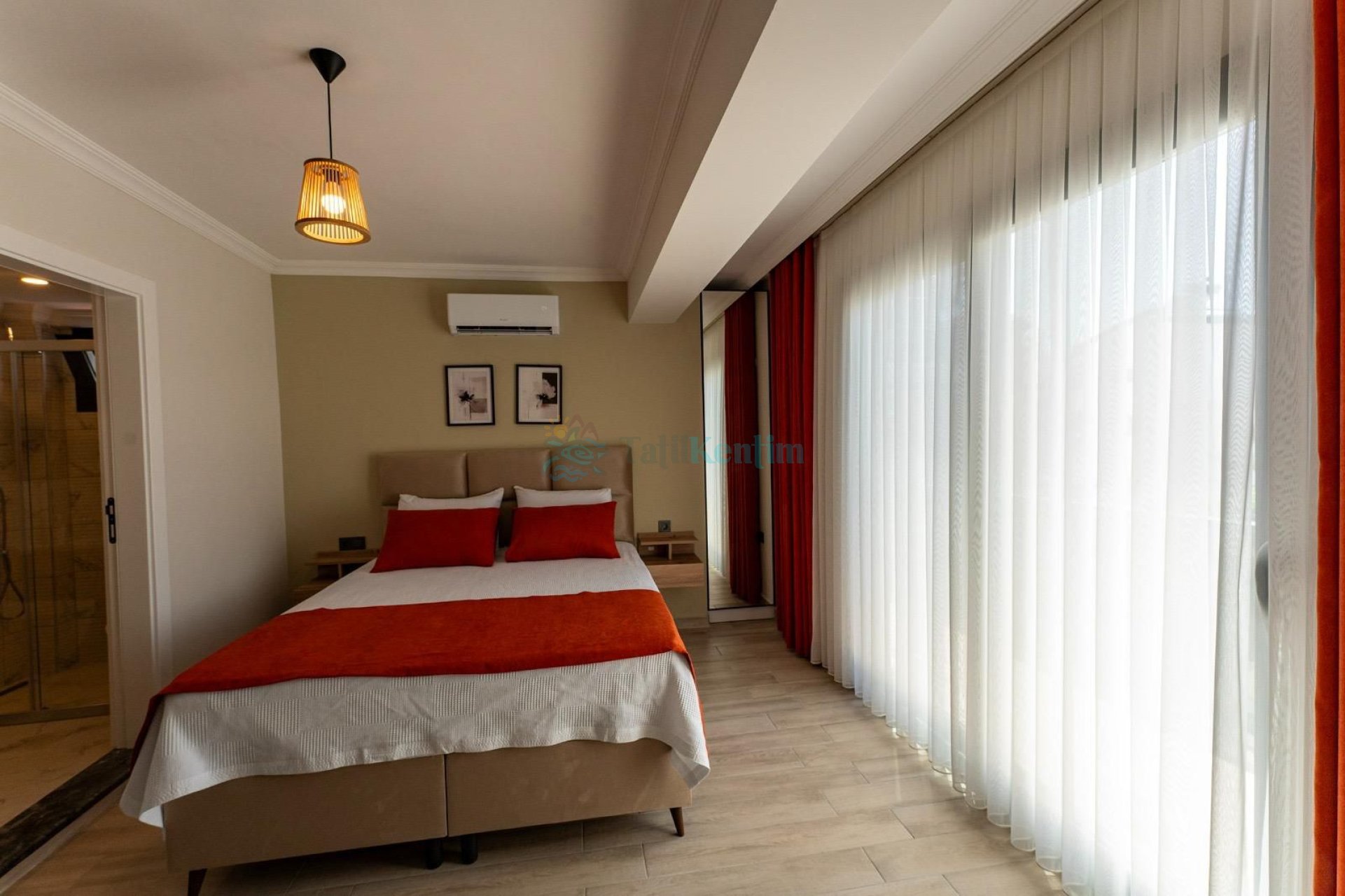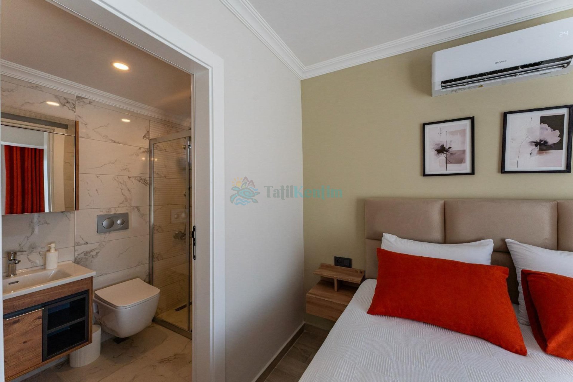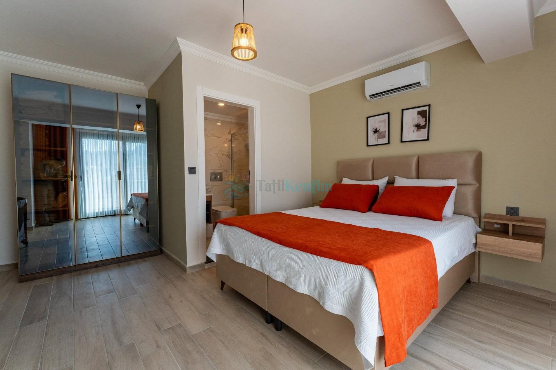 Yatak odası içerisinde, 1 adet çift kişilik yatak, klima, elbise dolabı, banyo ve tuvalet yer almaktadır.