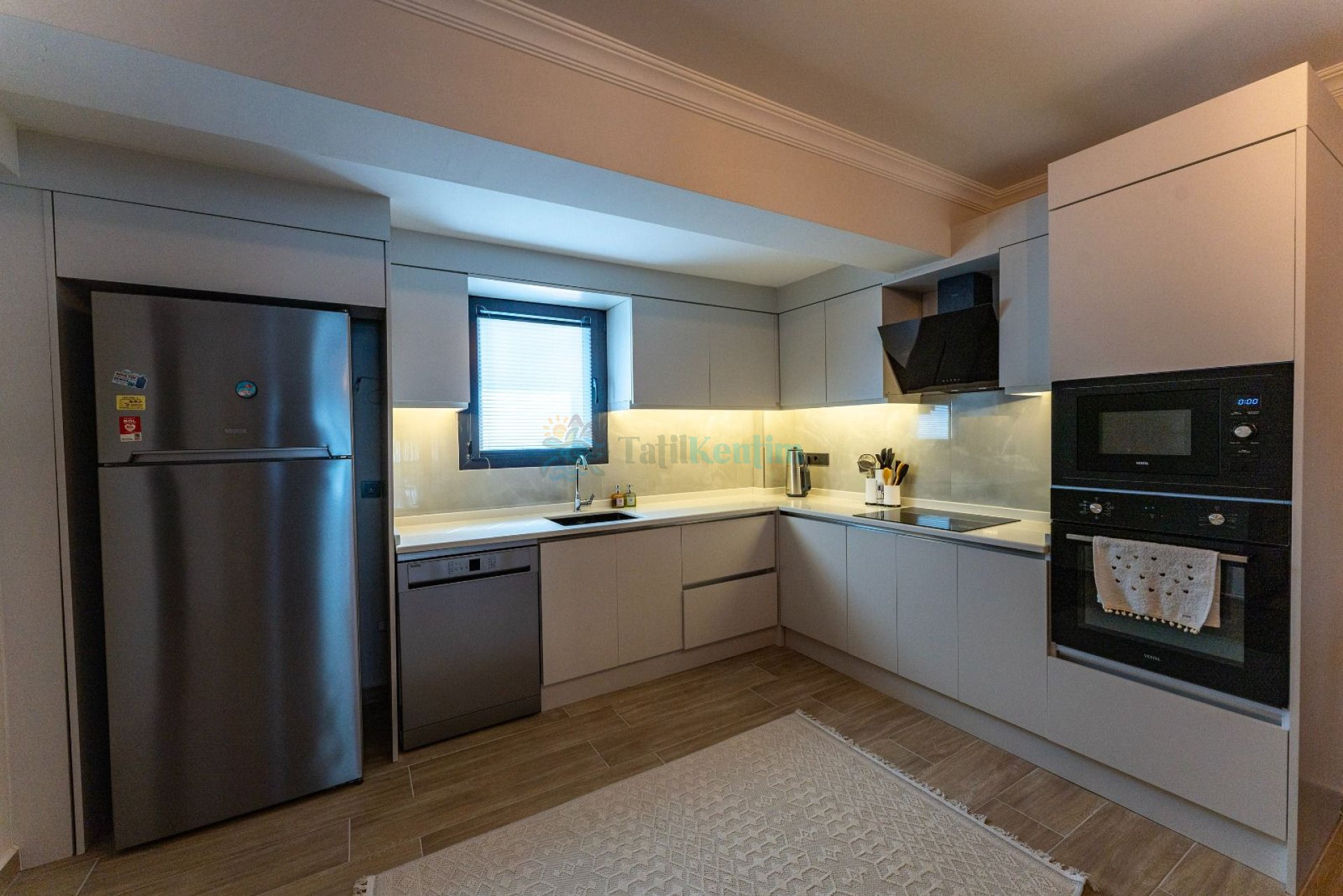 Amerikan mutfak, Buzdolabı, bulaşık makinası, yemek masası, fırın, ocak, kettle, tencere, tabak, çatal-bıçak takımı vb. ekipmanlar mevcuttur.