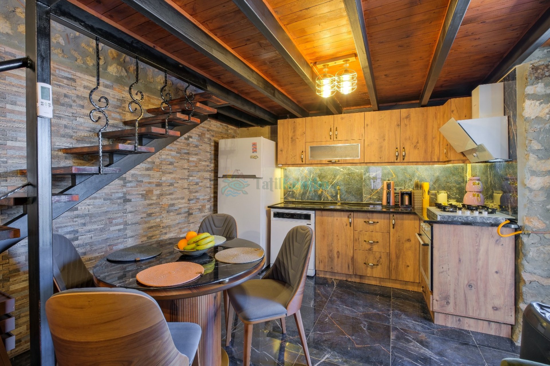 Yazlığımızın Amerikan mutfağı içerisinde, buzdolabı, bulaşık makinası, çamaşır makinası, yemek masası, yemek takımı, ankastre fırın, mikrodalga fırın, tost makinası, ankastre ocak, çaydanlık, su ısıtıcısı, çocuk masası, tava, tencere takımı ve gerekli olan tüm mutfak gereçleri yer almaktadır.