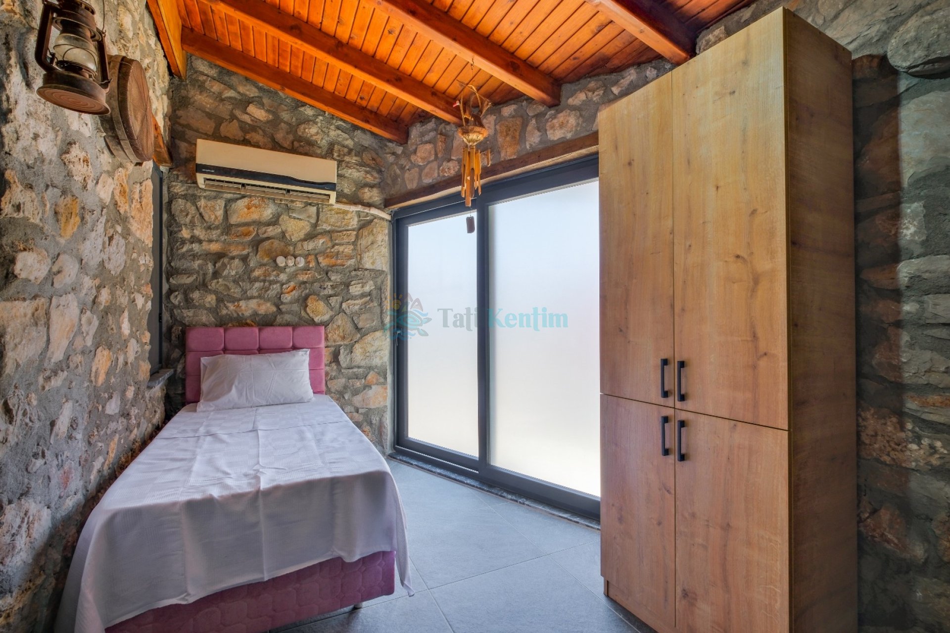 Kiralık villanın bu yatak odası içerisinde, 1 adet tek kişilik yatak, klima, elbise dolabı, komodin, makyaj masası, banyo ve tuvalet bulunmaktadır.