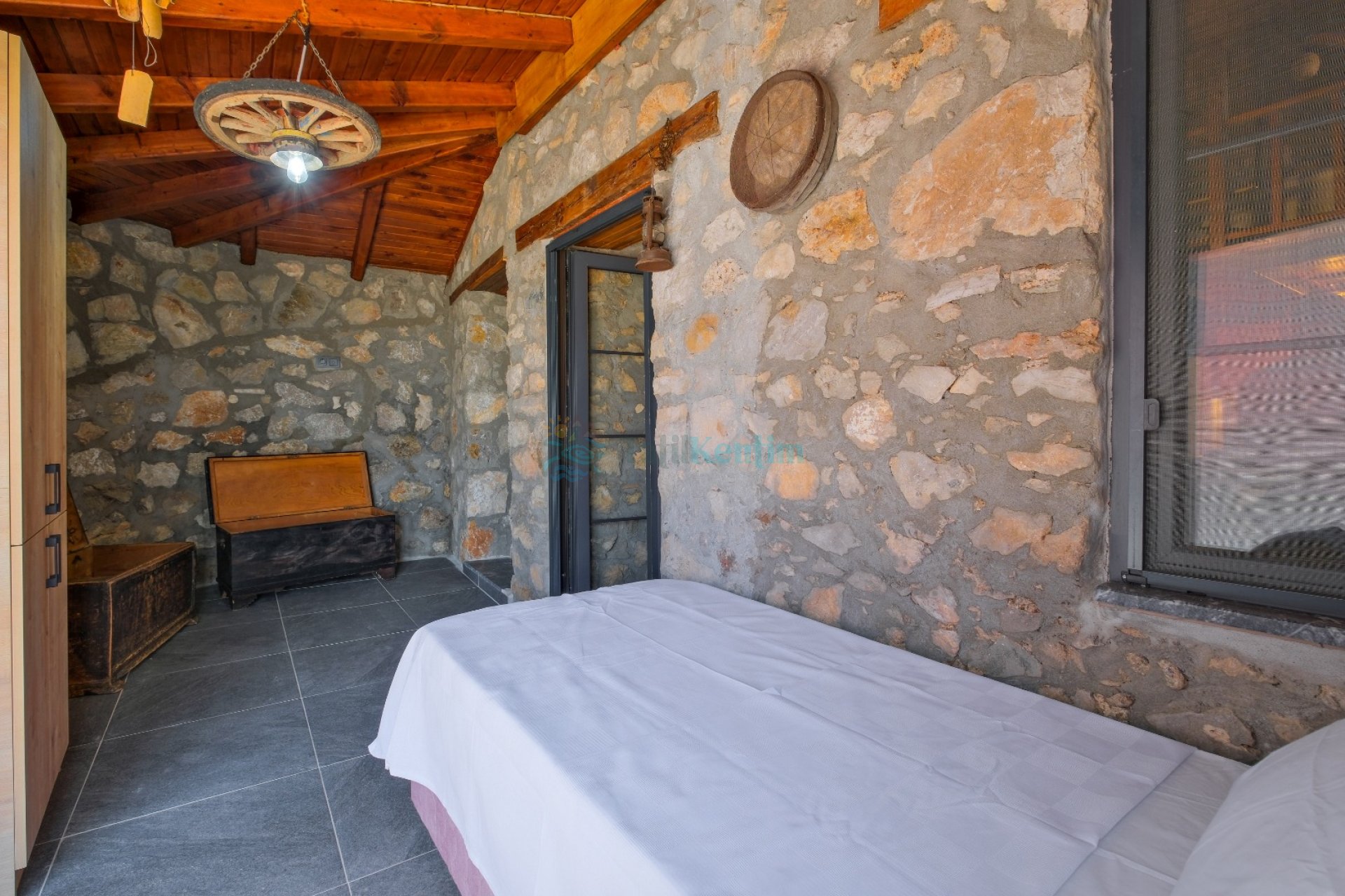 Tatil villamıza ait bu yatak odası içerisinde, 1 adet çift kişilik yatak, klima, elbise dolabı, komodin, makyaj masası, banyo ve tuvalet alanları bulunmaktadır.