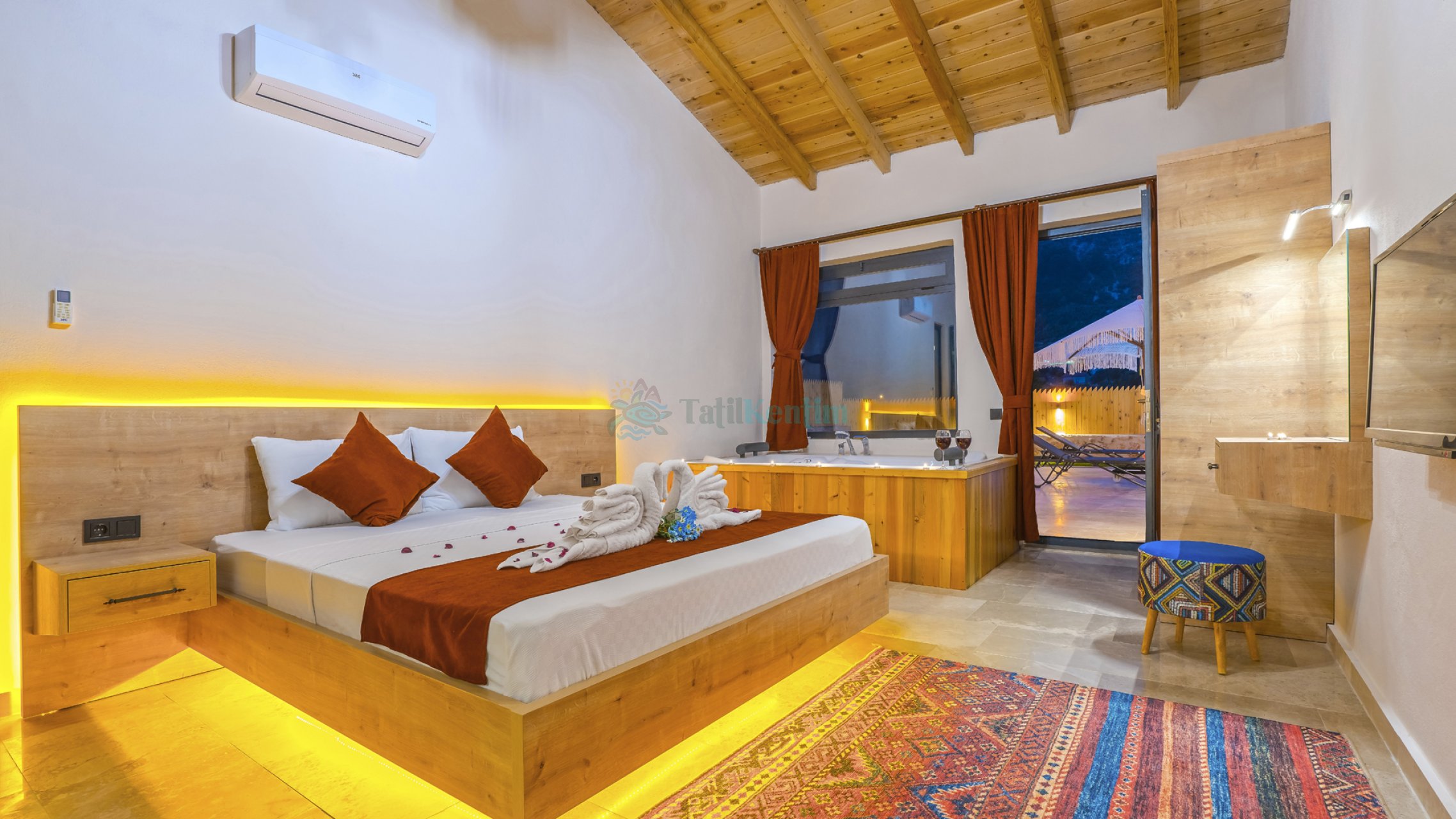 Yatak odası içerisinde, 1 adet çift kişilik yatak, klima, elbise dolabı, komodin, makyaj masası, jakuzi, banyo ve tuvalet yer almaktadır.