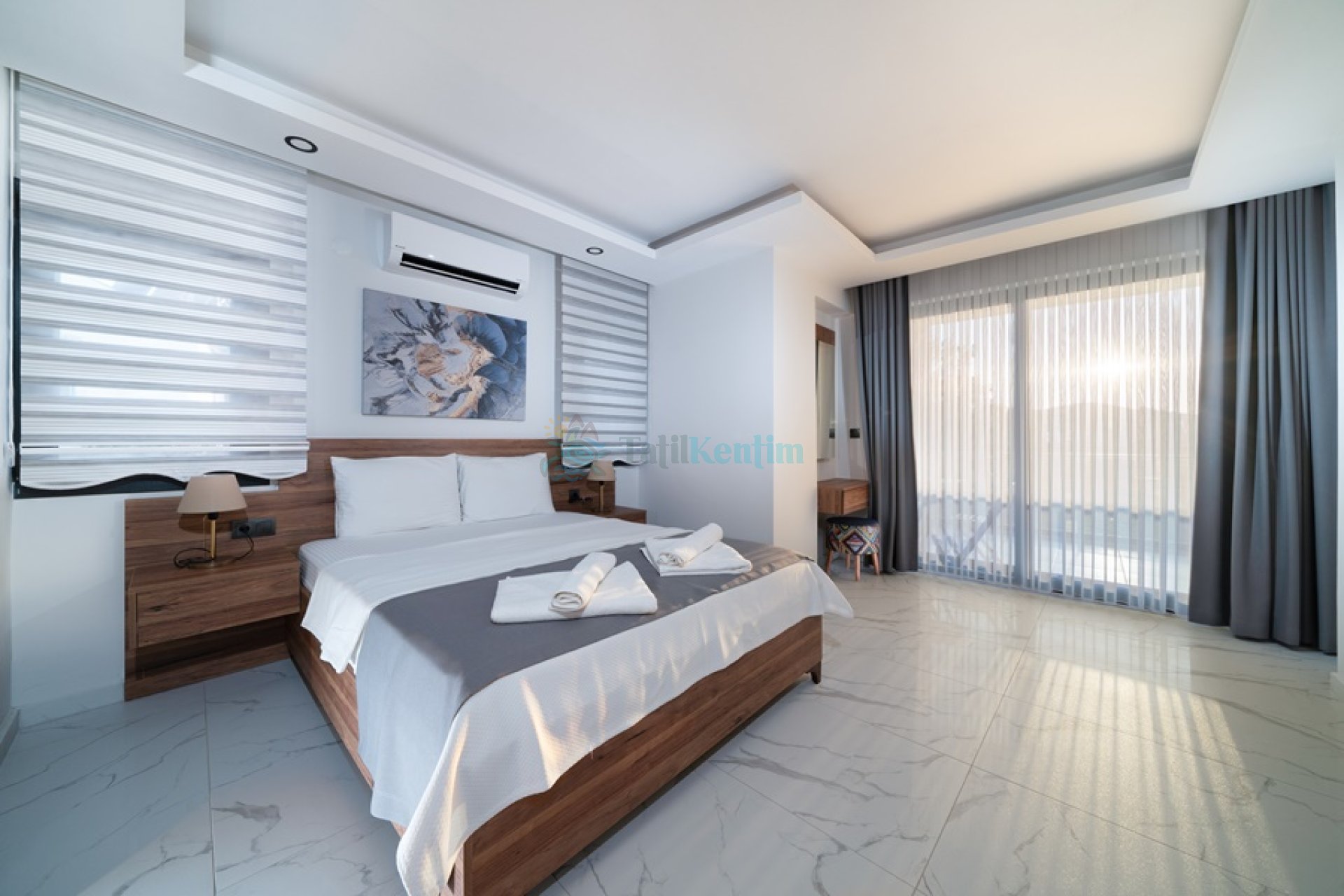 Kiralık villanın bu yatak odası içerisinde, 1 adet çift kişilik yatak, klima, elbise dolabı, komodin, makyaj masası, banyo ve tuvalet bulunmaktadır.
