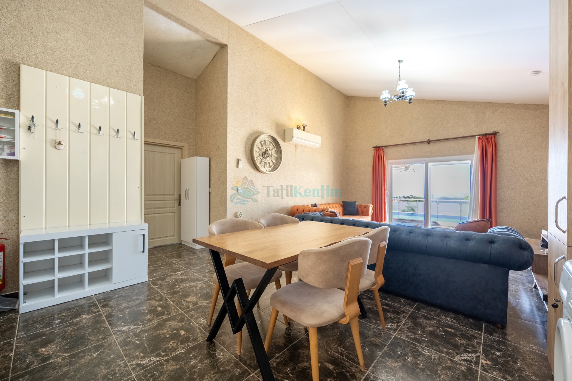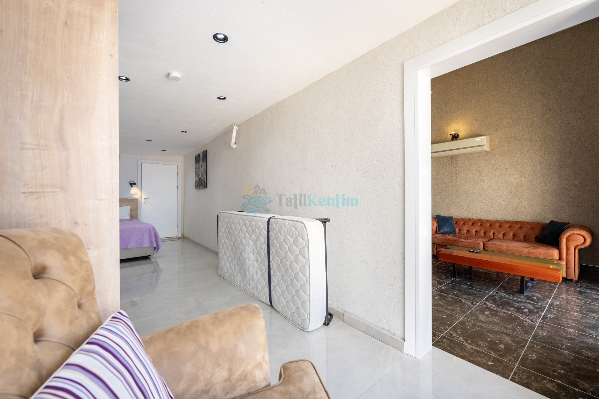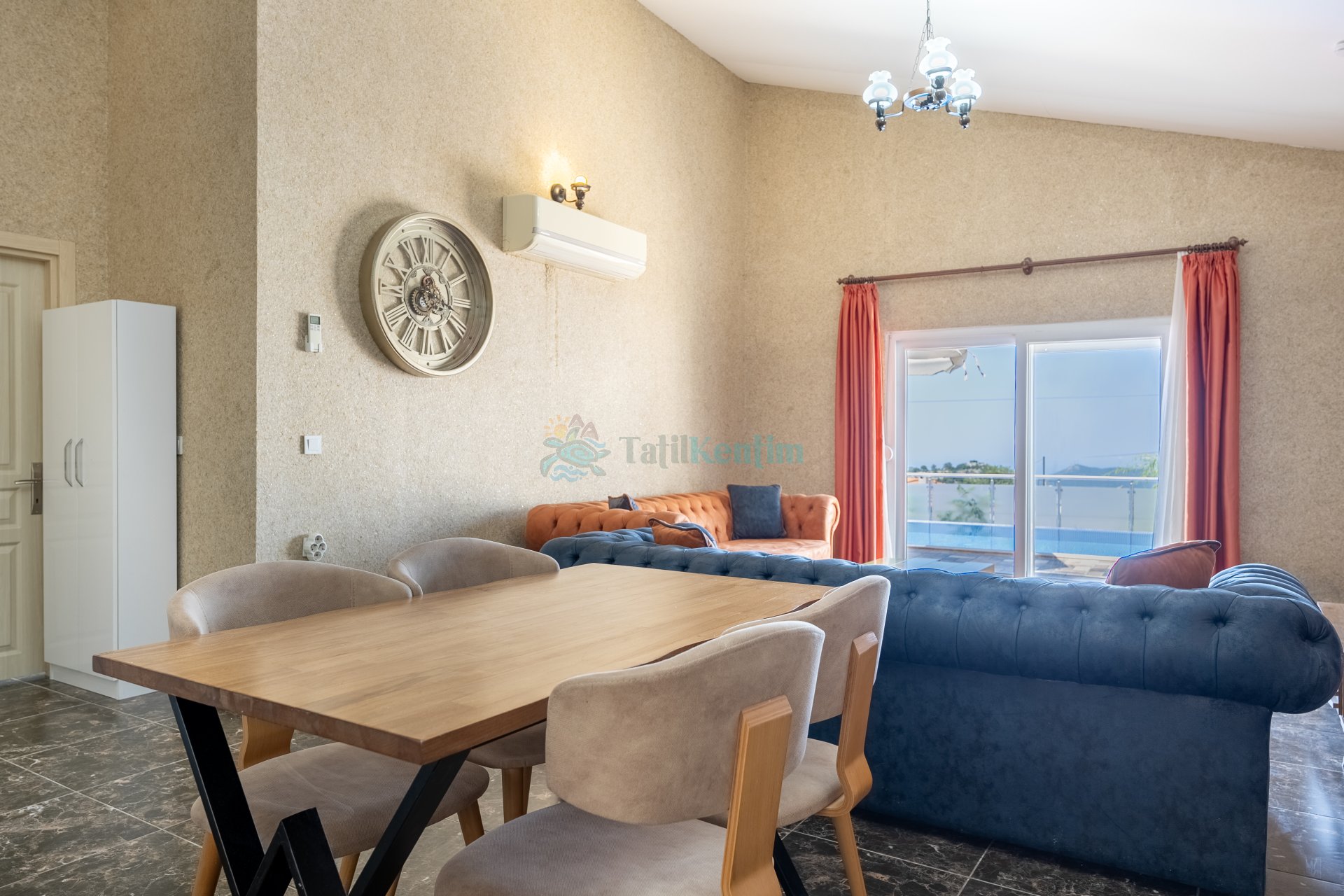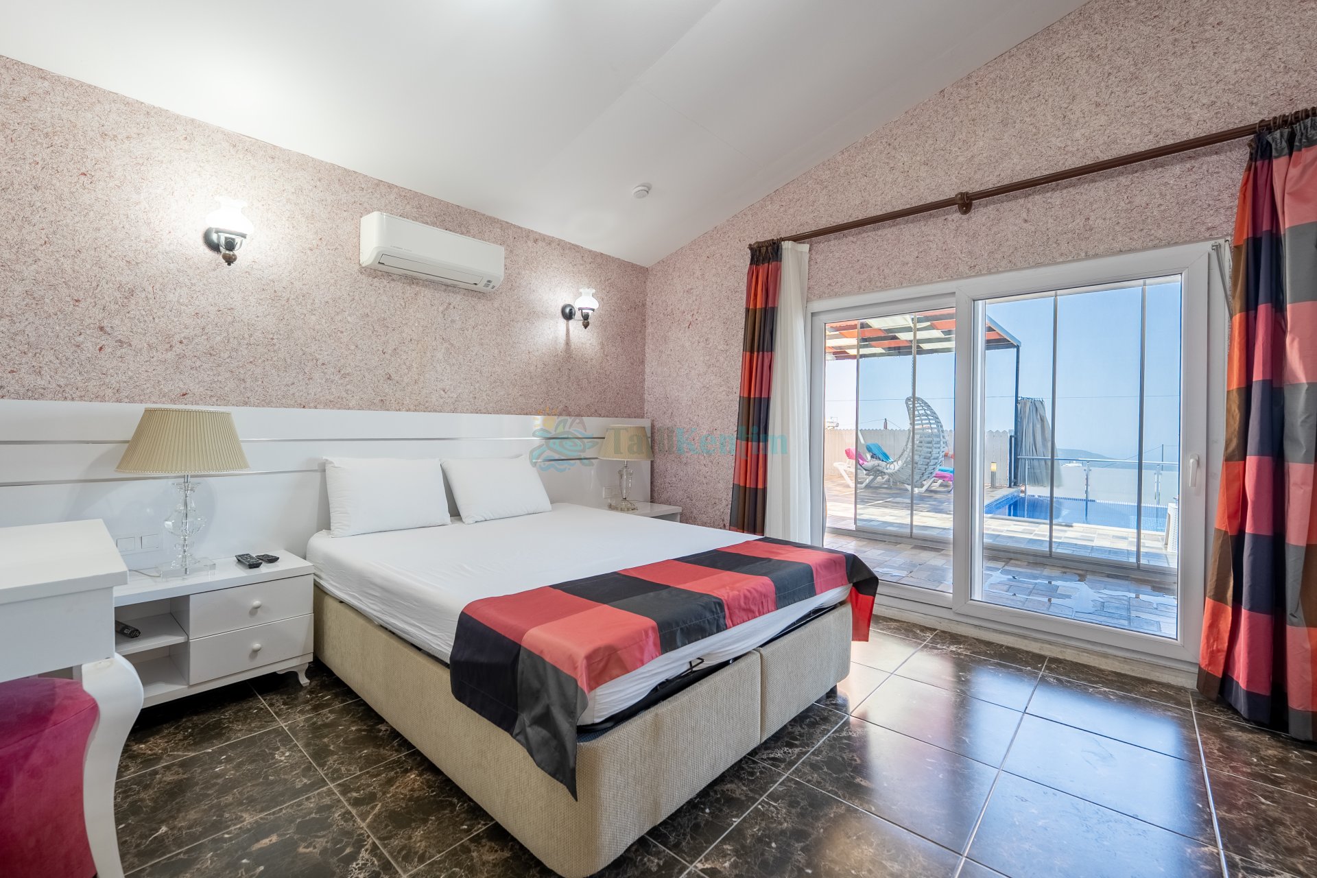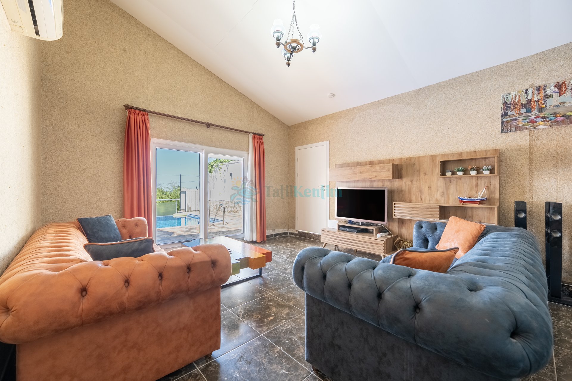 Oturma grubu, televizyon, klima ve havuz terasına çıkış bulunmaktadır.