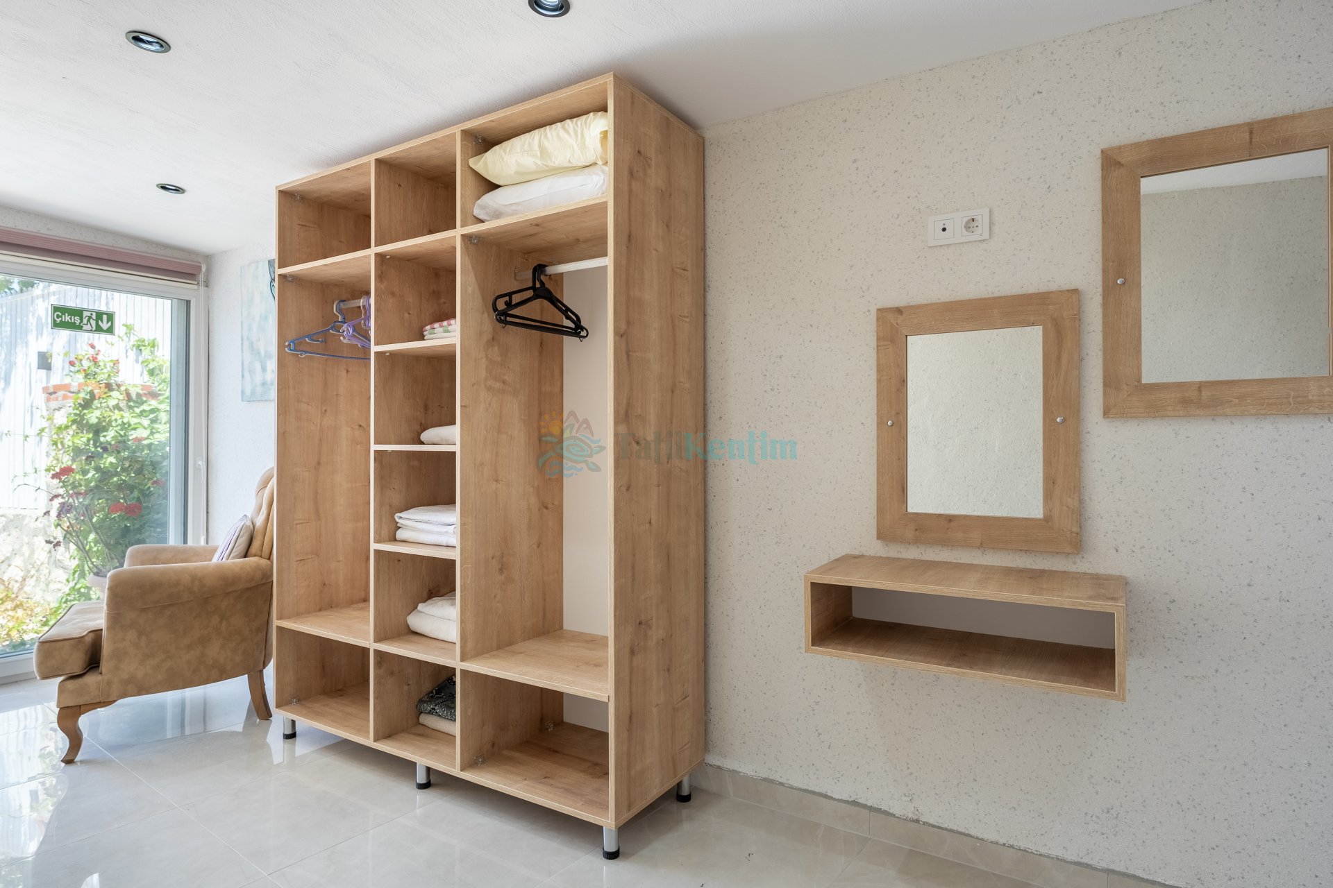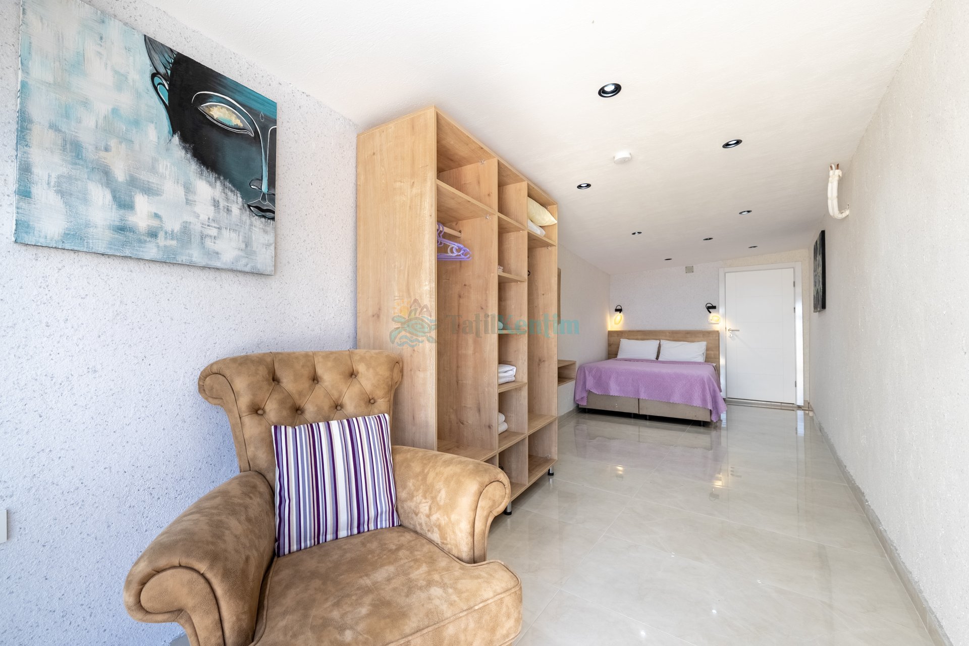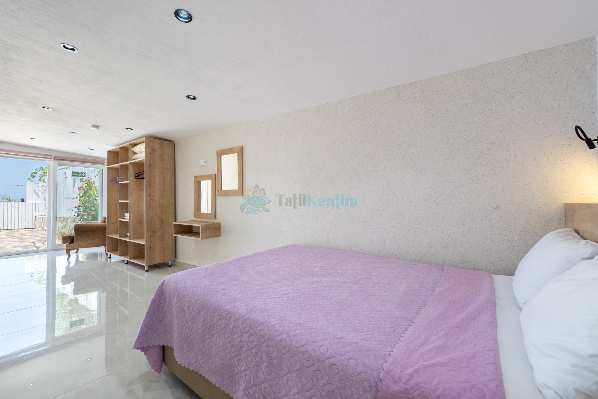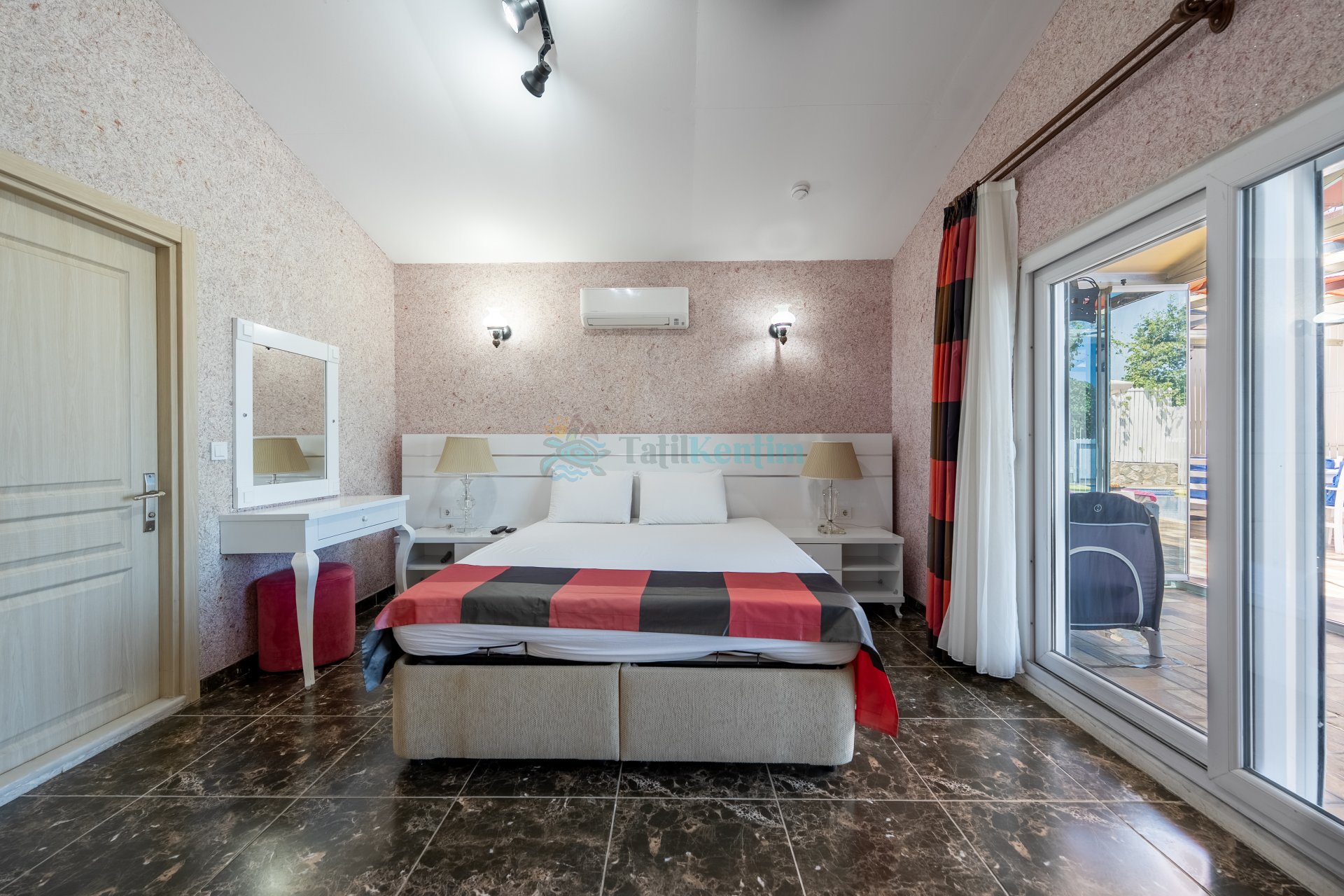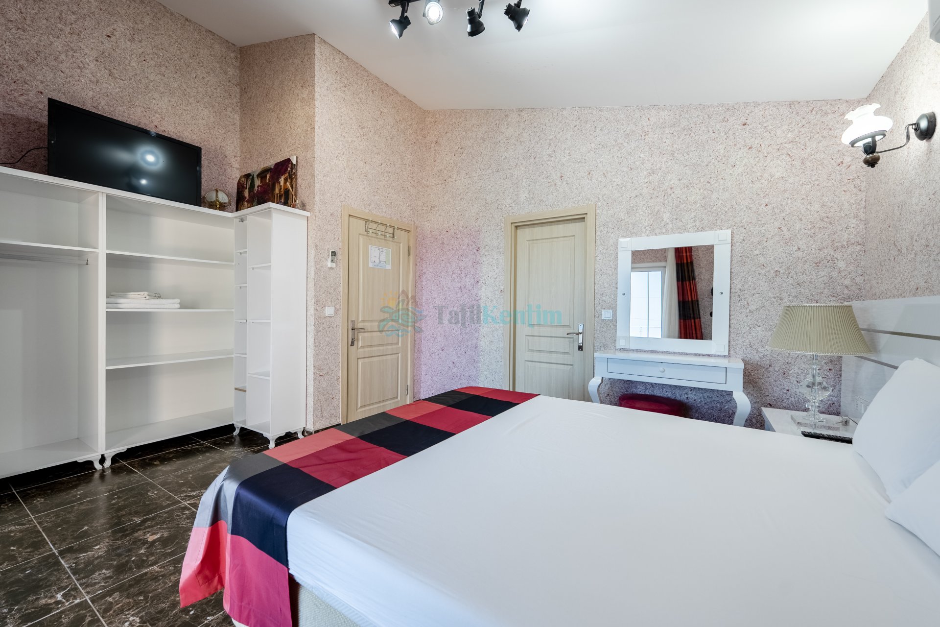 1 Adet çift kişilik yatak, makyaj masası, klima, berjer, elbise dolabı, banyo ve tuvalet bulunmaktadır.