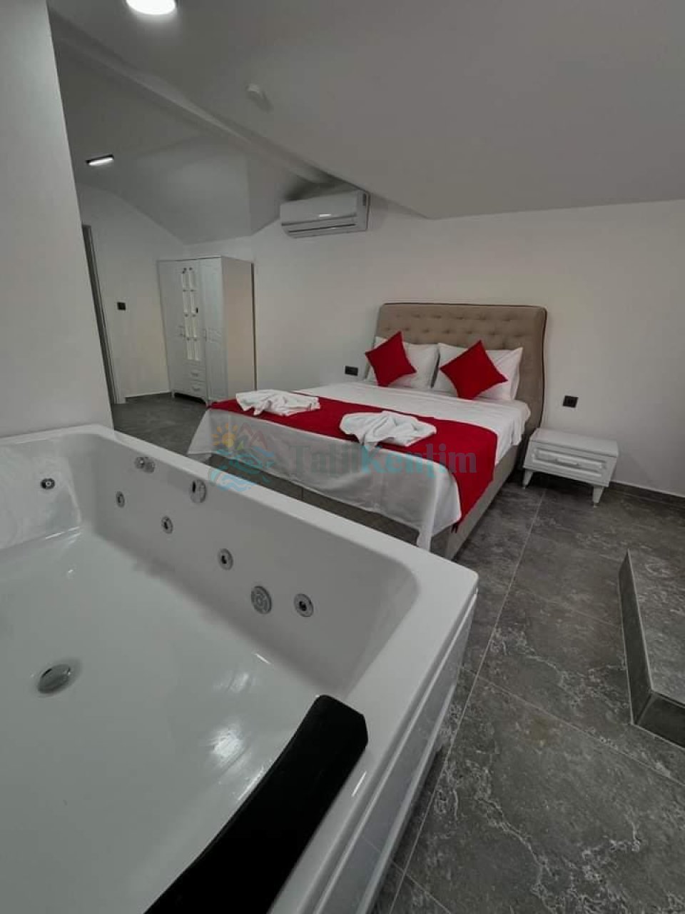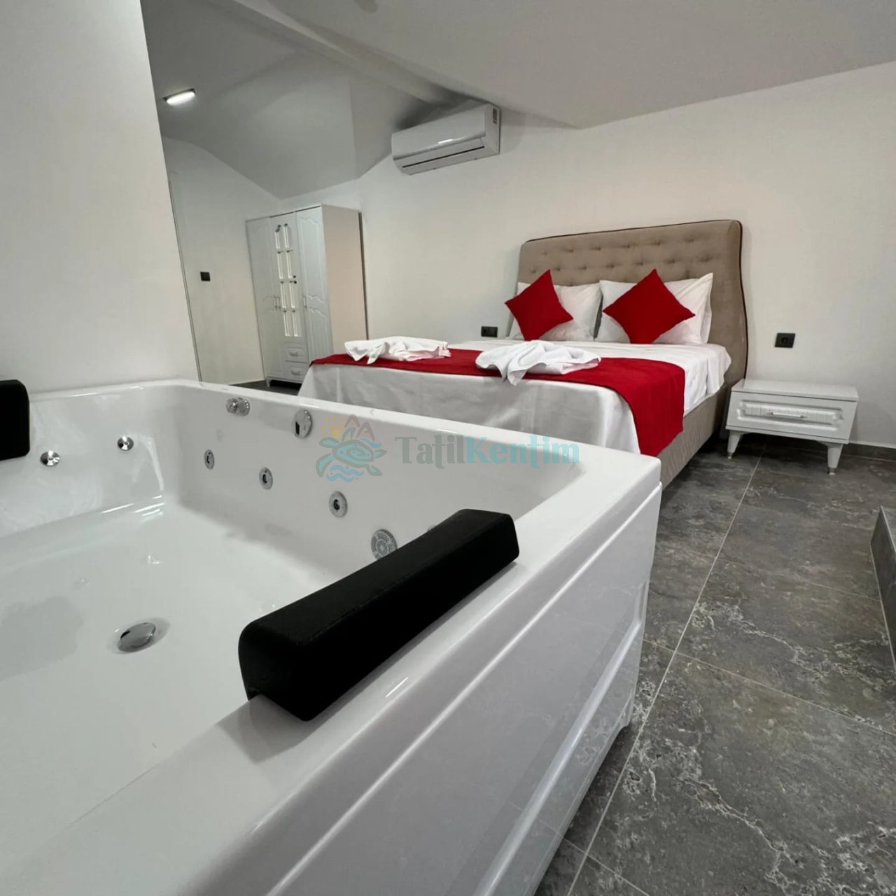 1 adet çift kişilik yatak, komodin, elbise dolabı, klima, ebeveyn banyosu ve jakuzi bulunmaktadır.