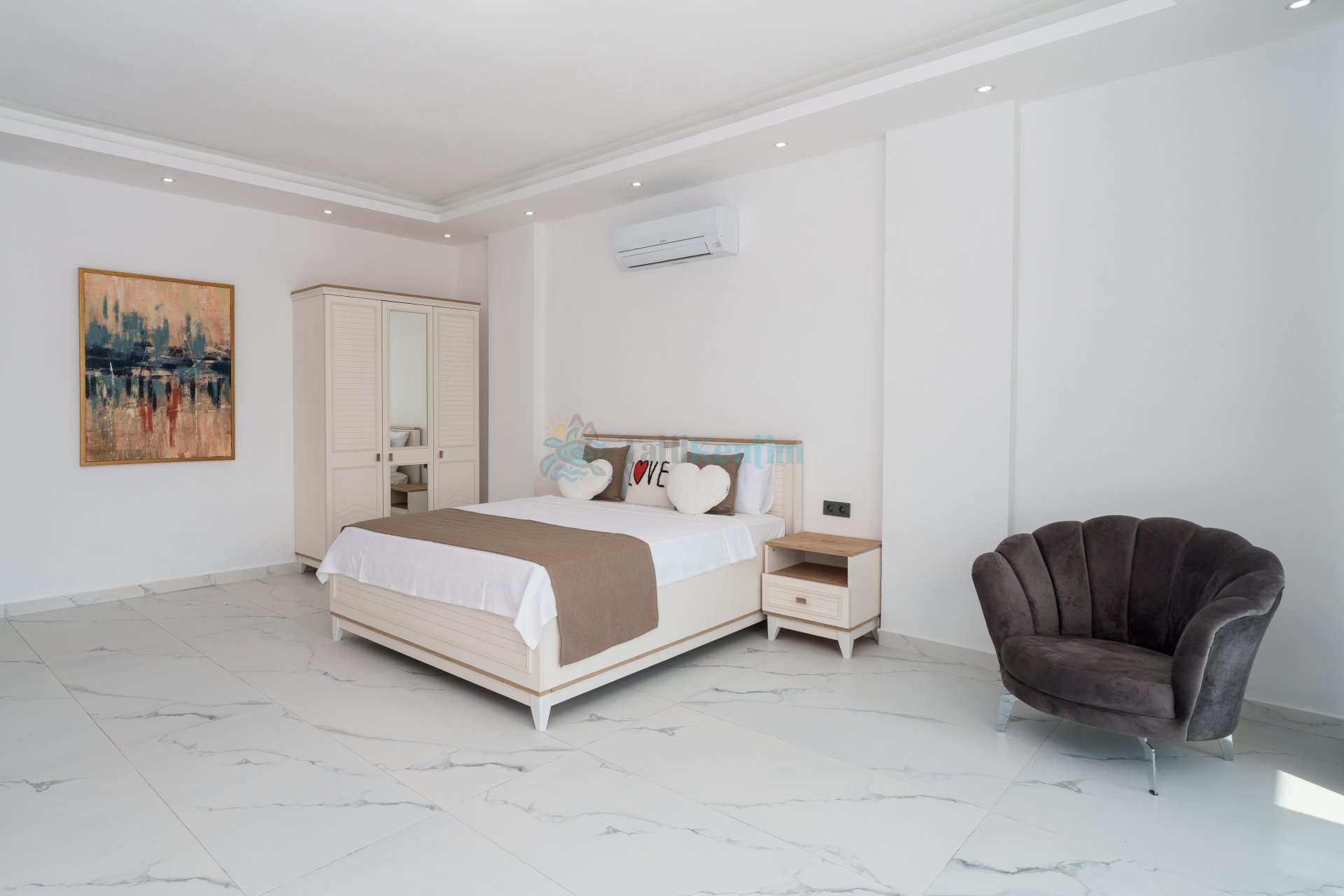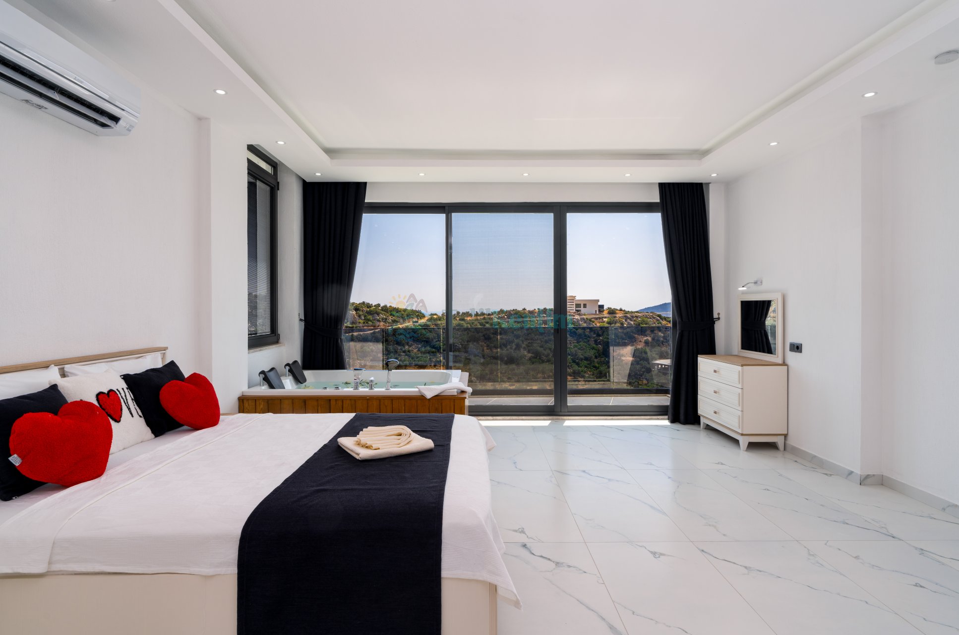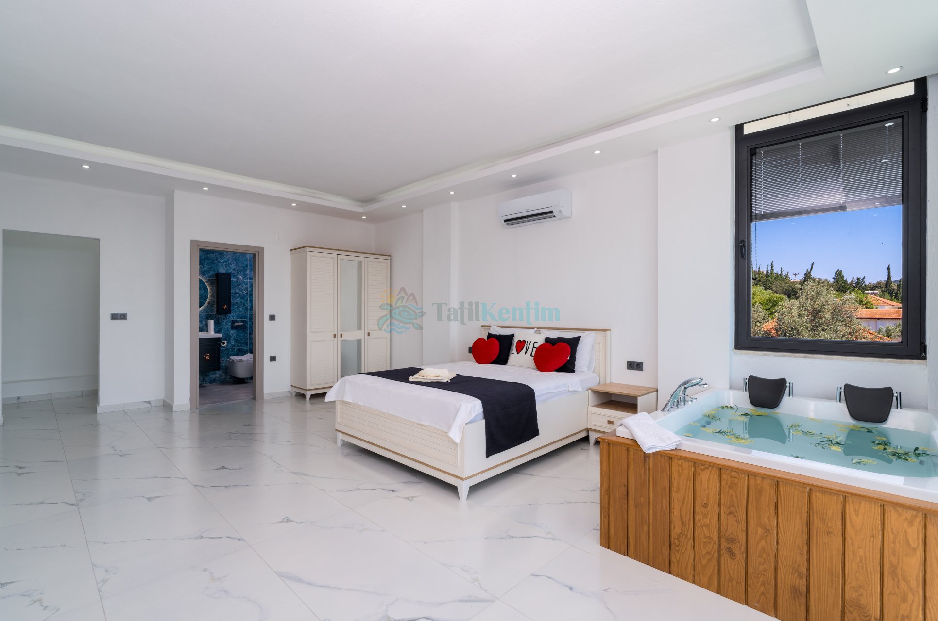 1.Yatak Odası: 1 adet çift kişilik yatak, komodin, jakuzi, TV, makyaj masası, klima, elbise dolabı, banyo ve tuvalet bulunmaktadır.