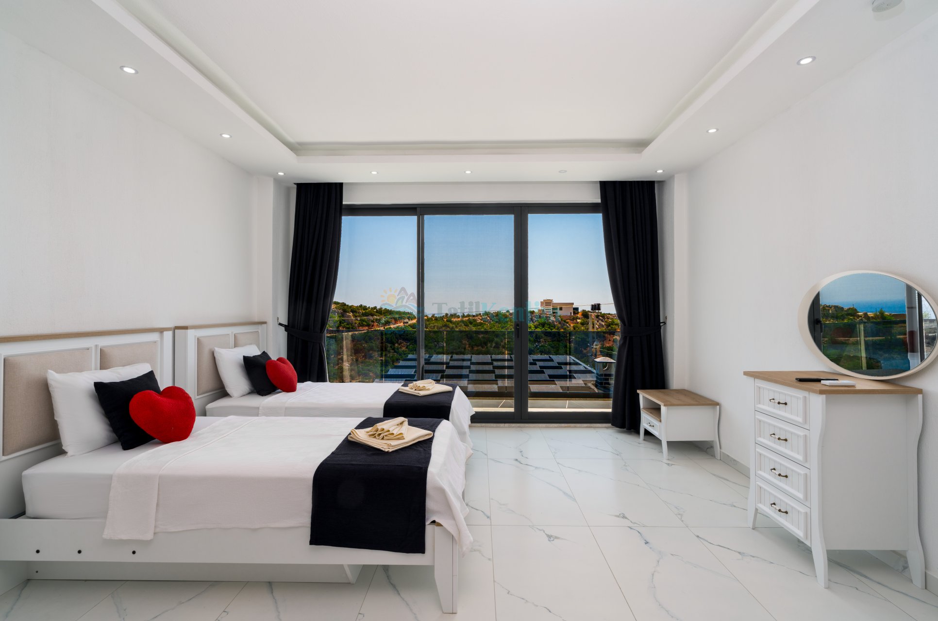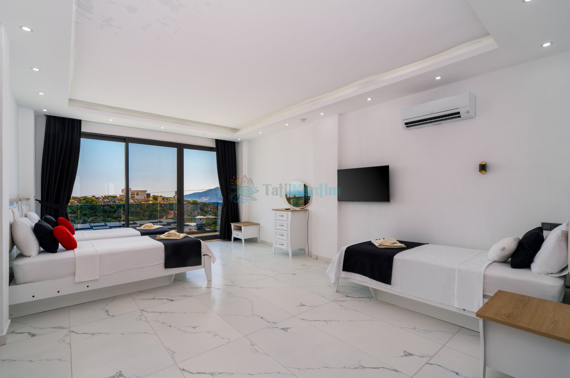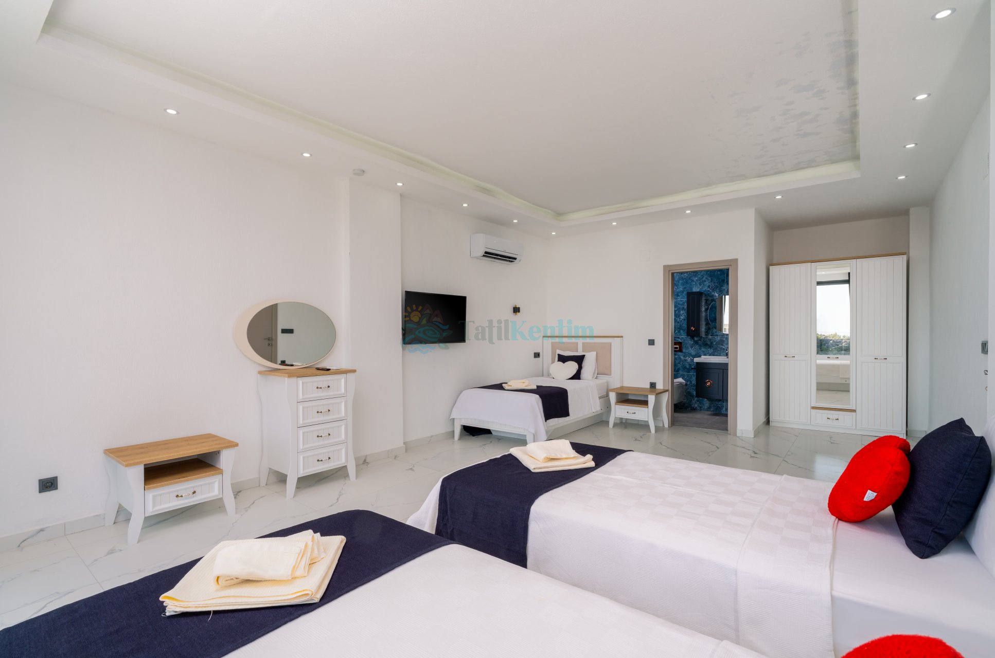4.Yatak Odası: 3 Adet tek kişilik yatak, komodin, TV, makyaj masası, elbise dolabı ve klima bulunmaktadır.
