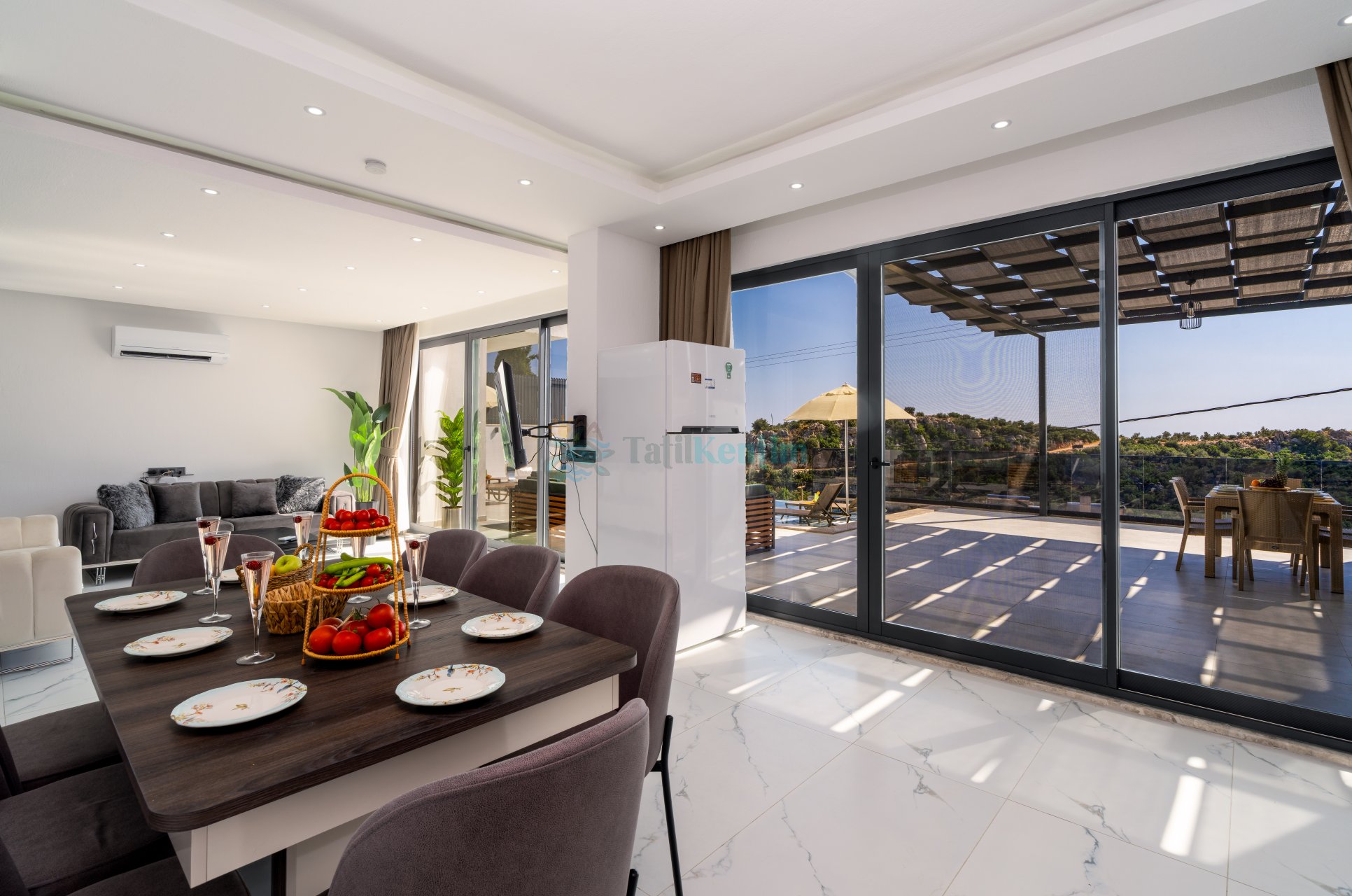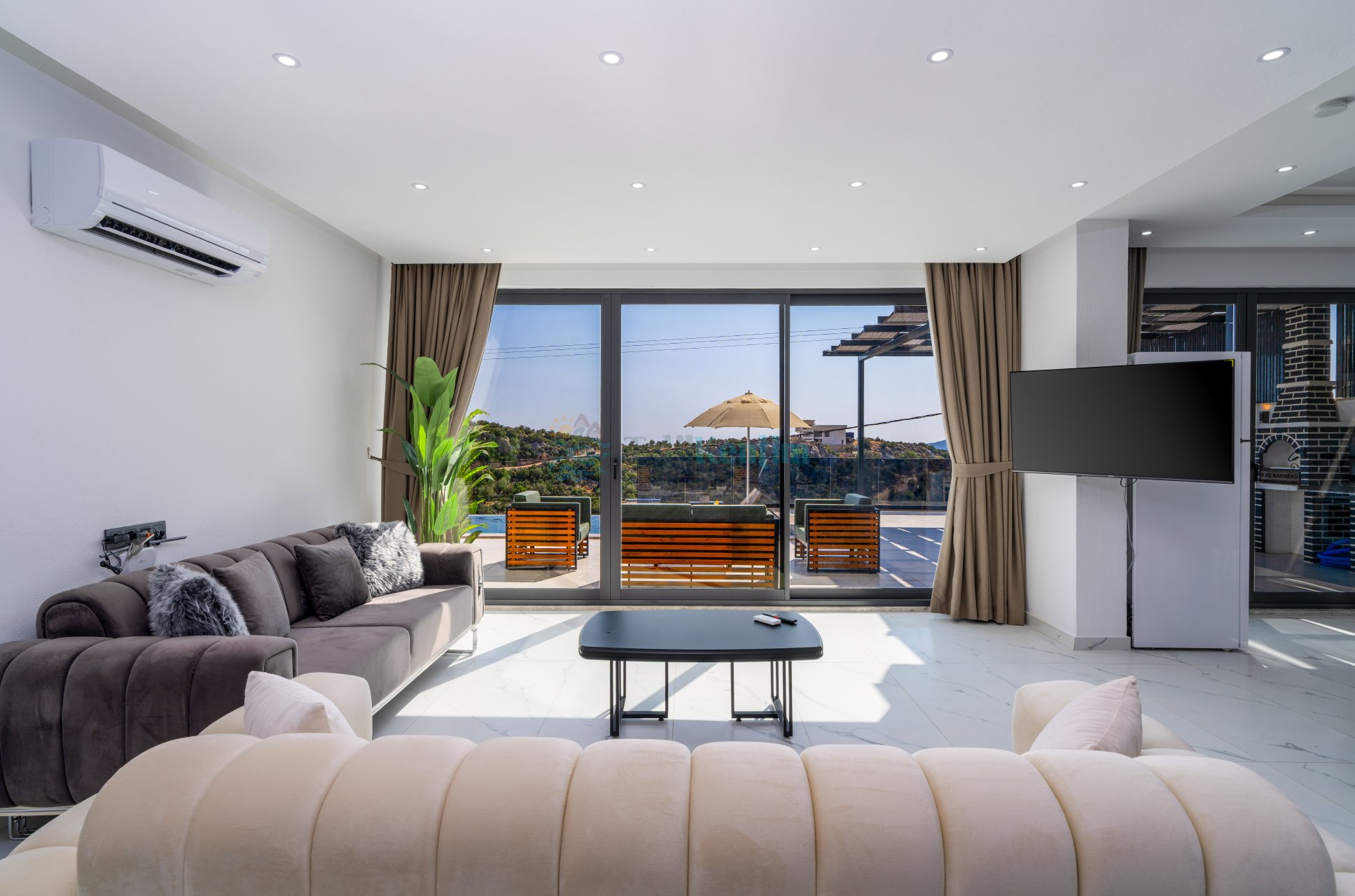 Salon: Oturma grubu, televizyon, klima ve havuz terasına çıkış bulunmaktadır.