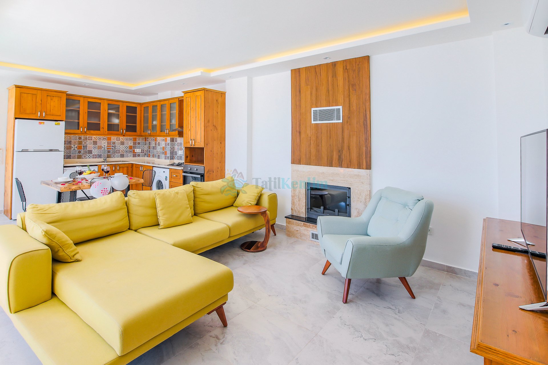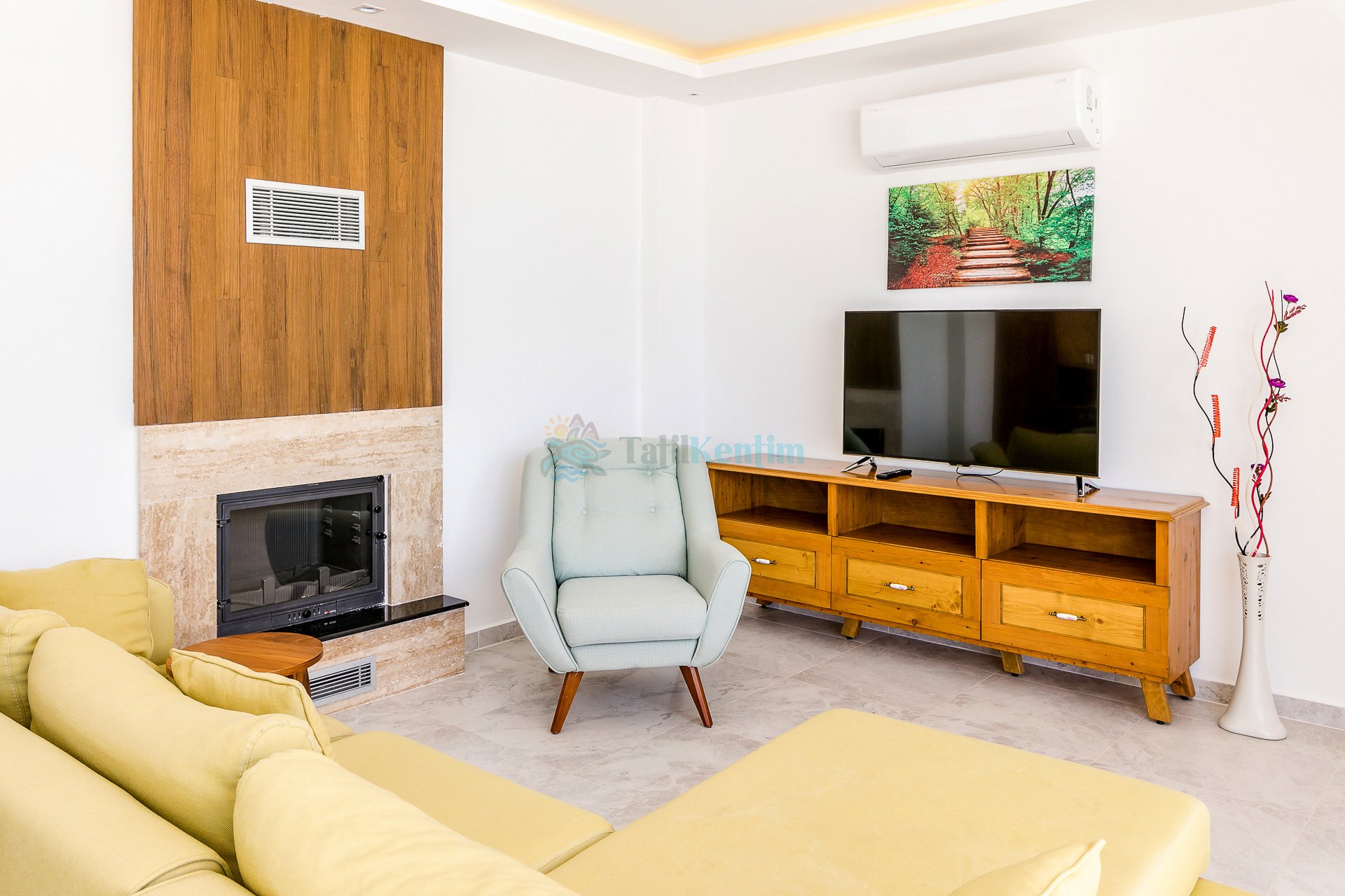 Doğa manzaralı salon içerisinde, koltuk takımı, TV, TV ünitesi, klima, şömine, uydu alıcısı yer almaktadır.