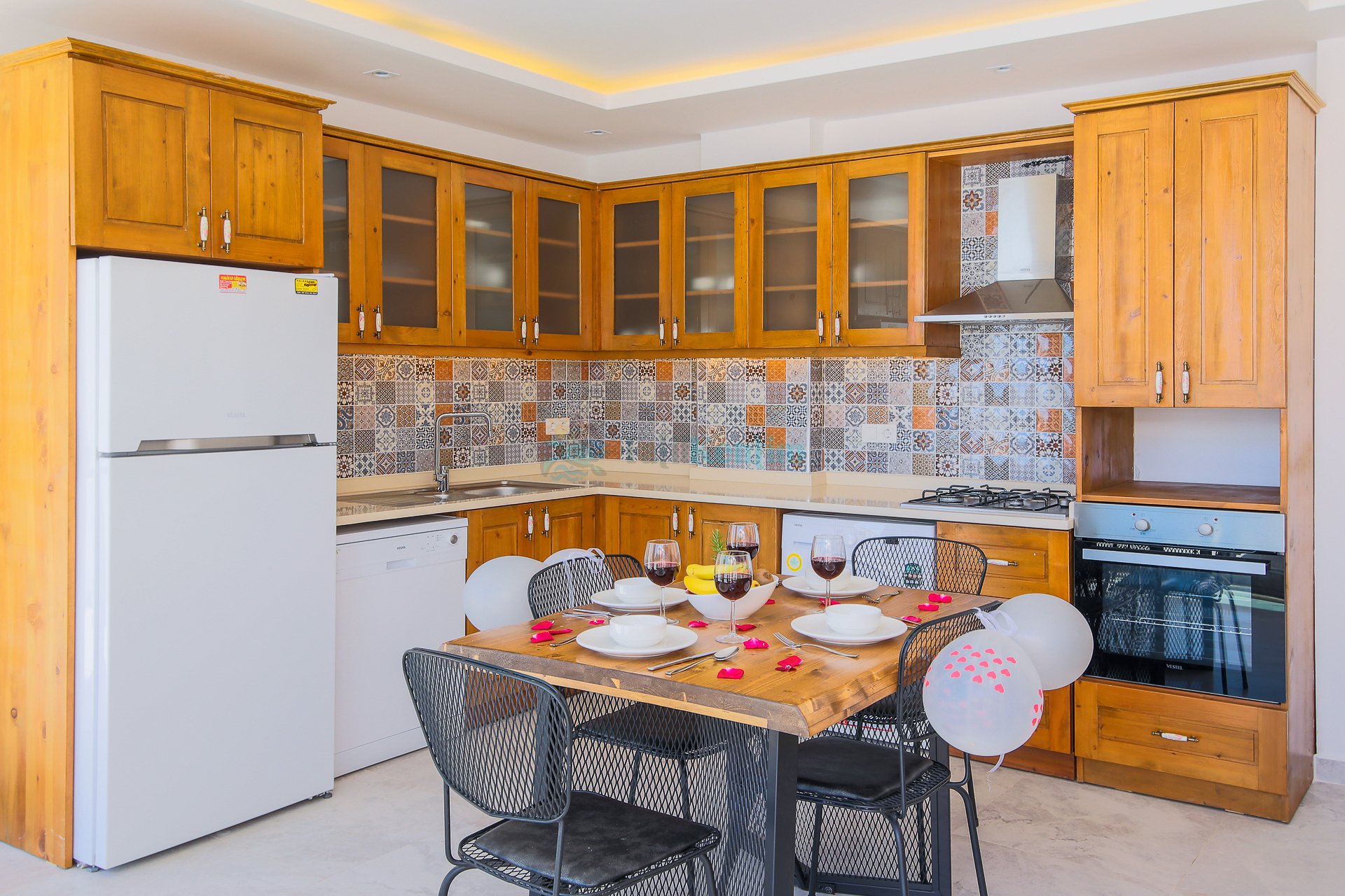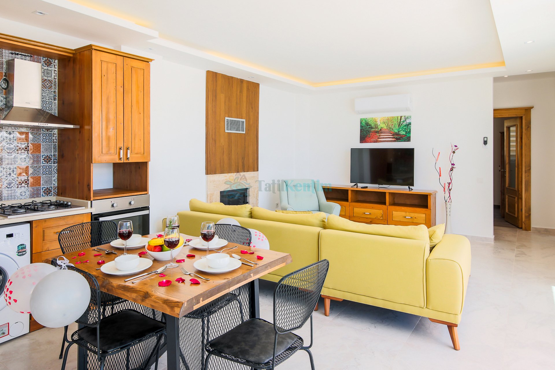 Amerikan mutfak içerisinde, buzdolabı, bulaşık makinası, çamaşır makinası, yemek masası, yemek takımı, ankastre fırın, ankastre ocak, çaydanlık, su ısıtıcısı, tava, tencere takımı ve gerekli olan tüm mutfak gereçleri yer almaktadır.