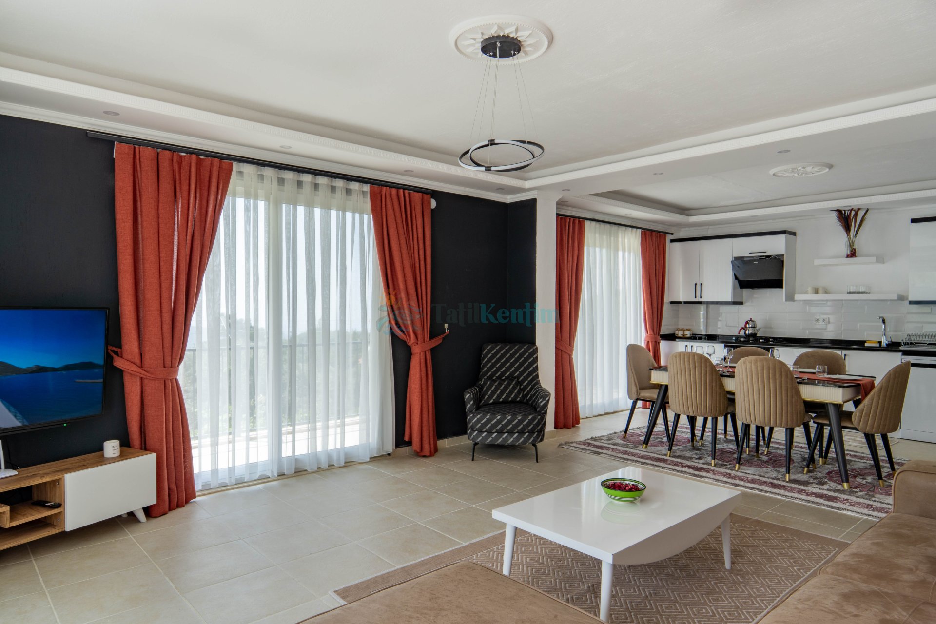 Doğa manzaralı salon içerisinde, koltuk takımı, orta sehpa, TV, TV ünitesi, klima, uydu alıcısı yer almaktadır.
