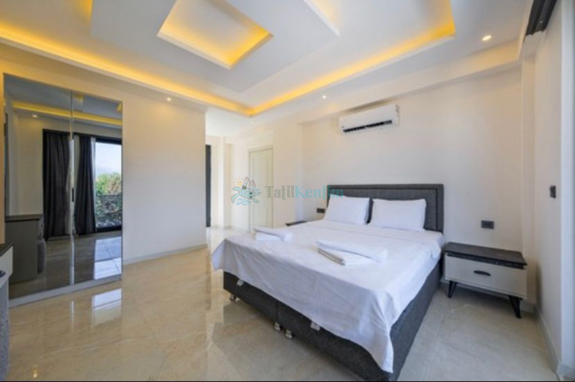 Yatak odası içerisinde, 1 adet çift kişilik yatak, klima, elbise dolabı, makyaj masası, komodin yer almaktadır.