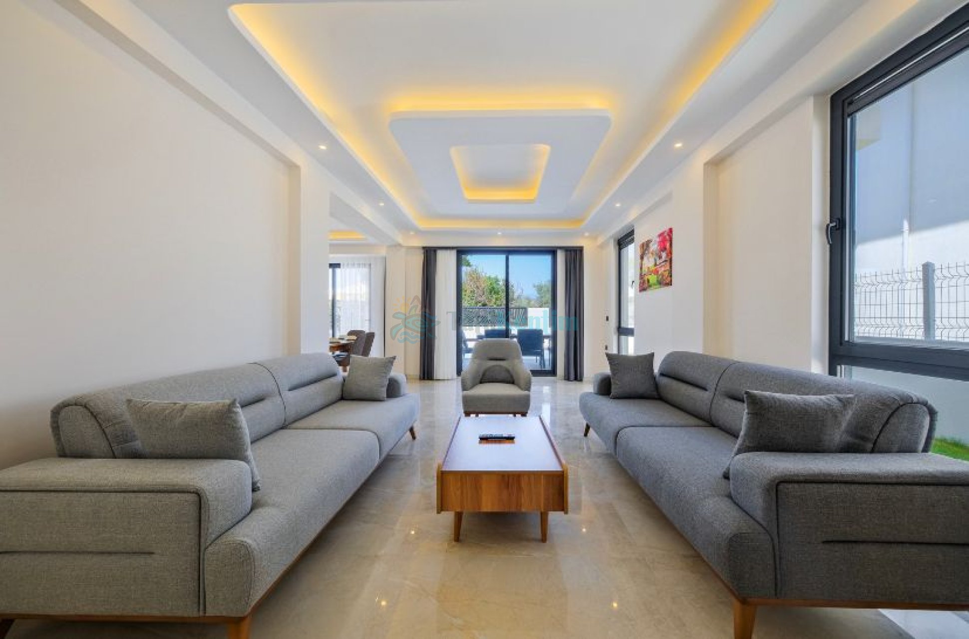 Modern şık oturma grubu, klima, televizyon, orta sehpa yer almaktadır.