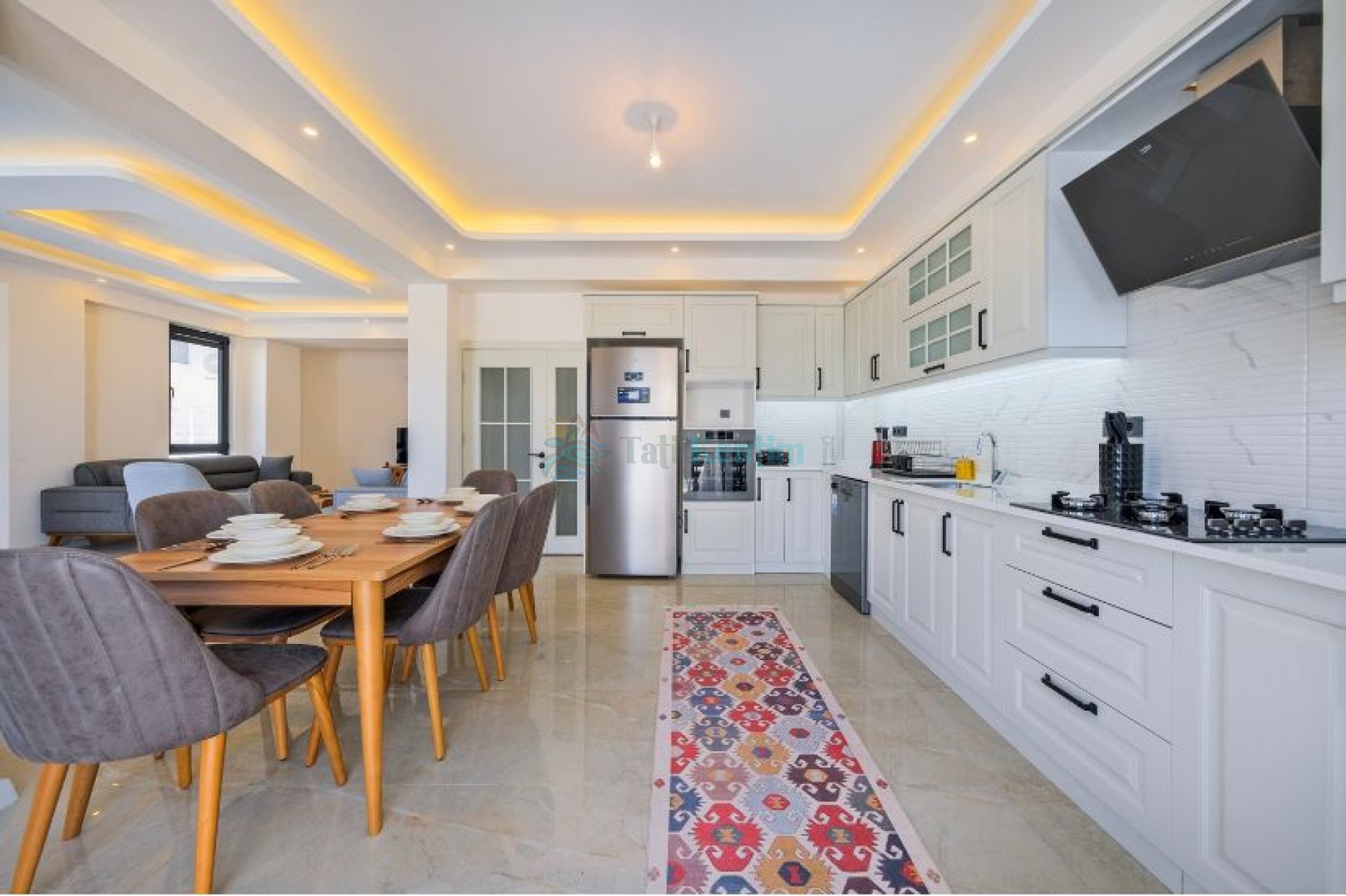 Amerikan mutfak, Buzdolabı, bulaşık makinası, yemek masası, fırın, ocak, tost makinası, kettle, tencere, tabak, çatal-bıçak takımı vb. ekipmanlar mevcuttur.