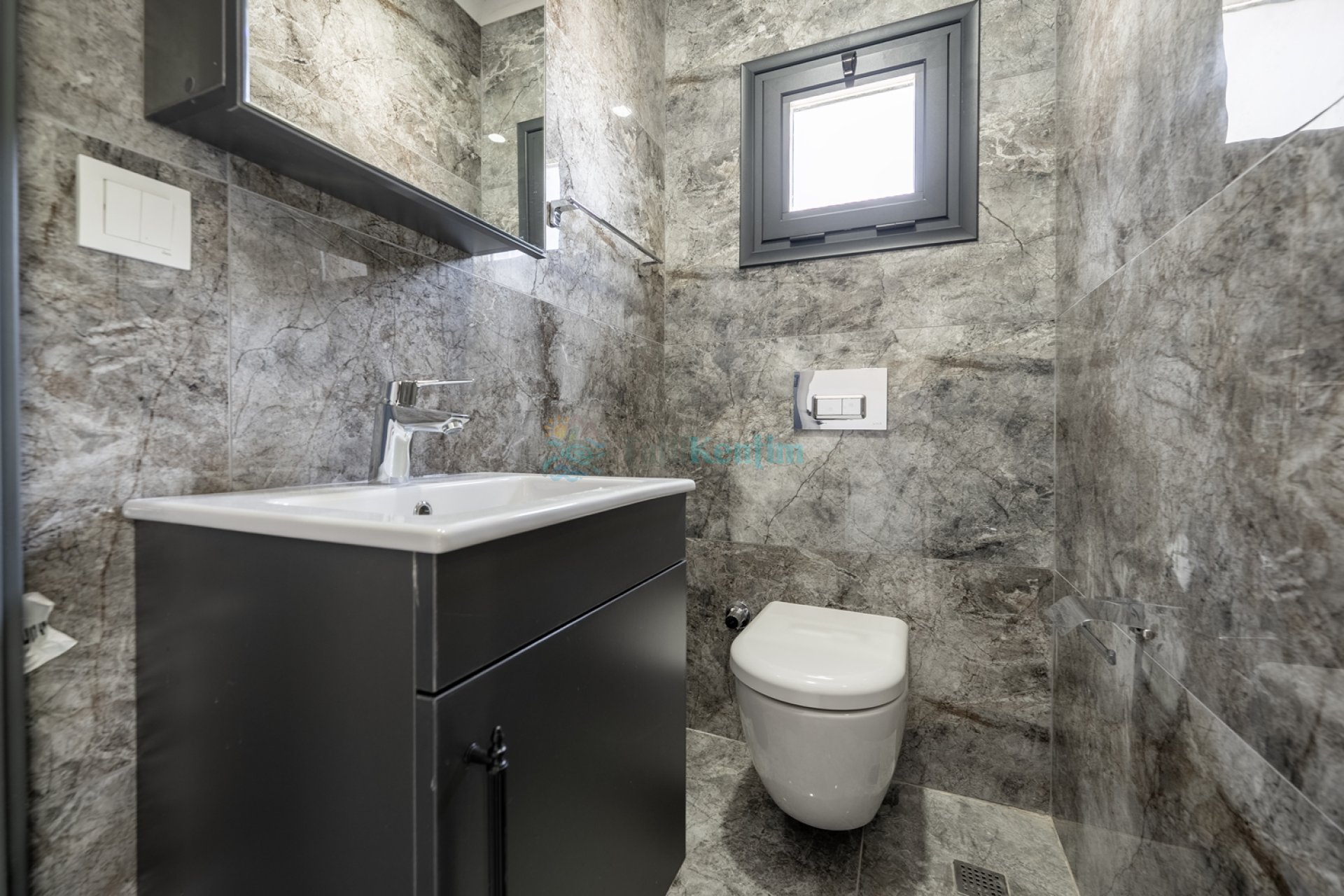 Tatil villamıza ait bu yatak odası içerisinde, 1 adet çift kişilik yatak, klima, elbise dolabı, komodin, makyaj masası, banyo ve tuvalet alanları bulunmaktadır.