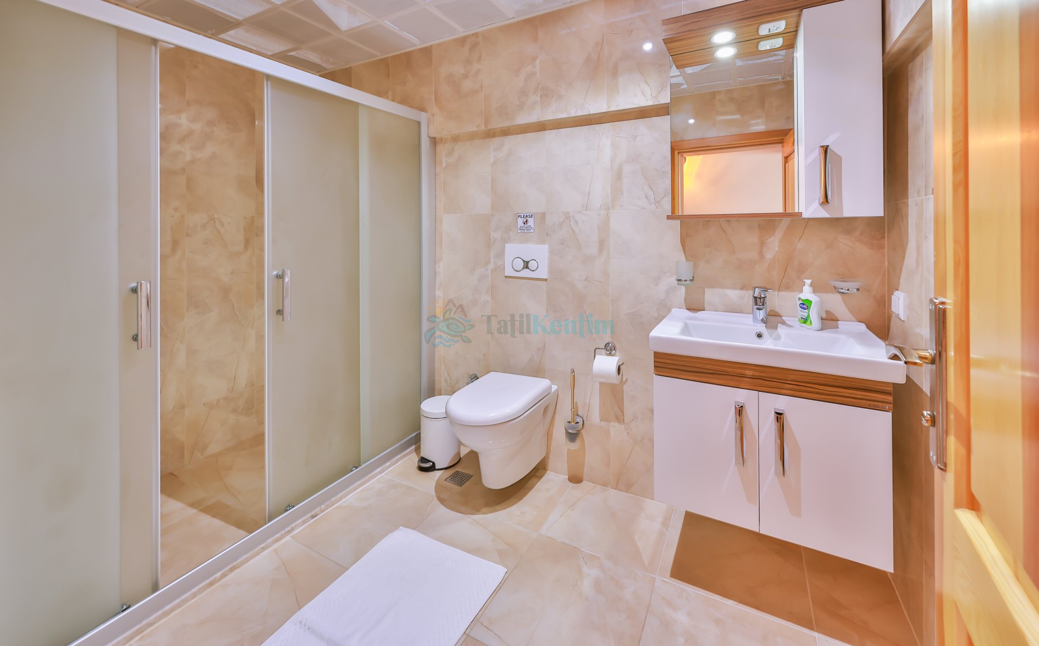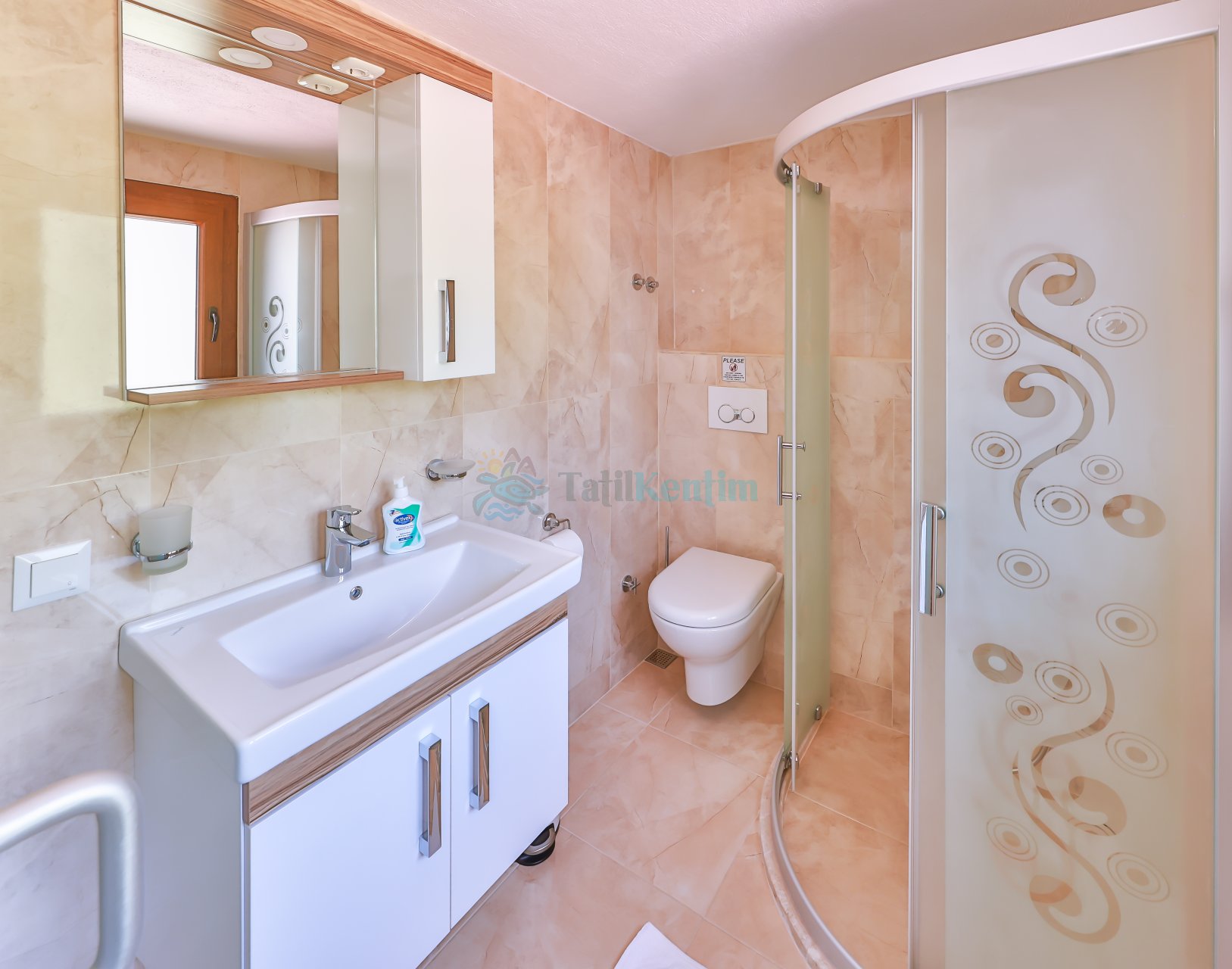Tatil villamıza ait bu yatak odası içerisinde, 1 adet çift kişilik yatak, klima, elbise dolabı, komodin, makyaj masası, banyo ve tuvalet alanları bulunmaktadır.
