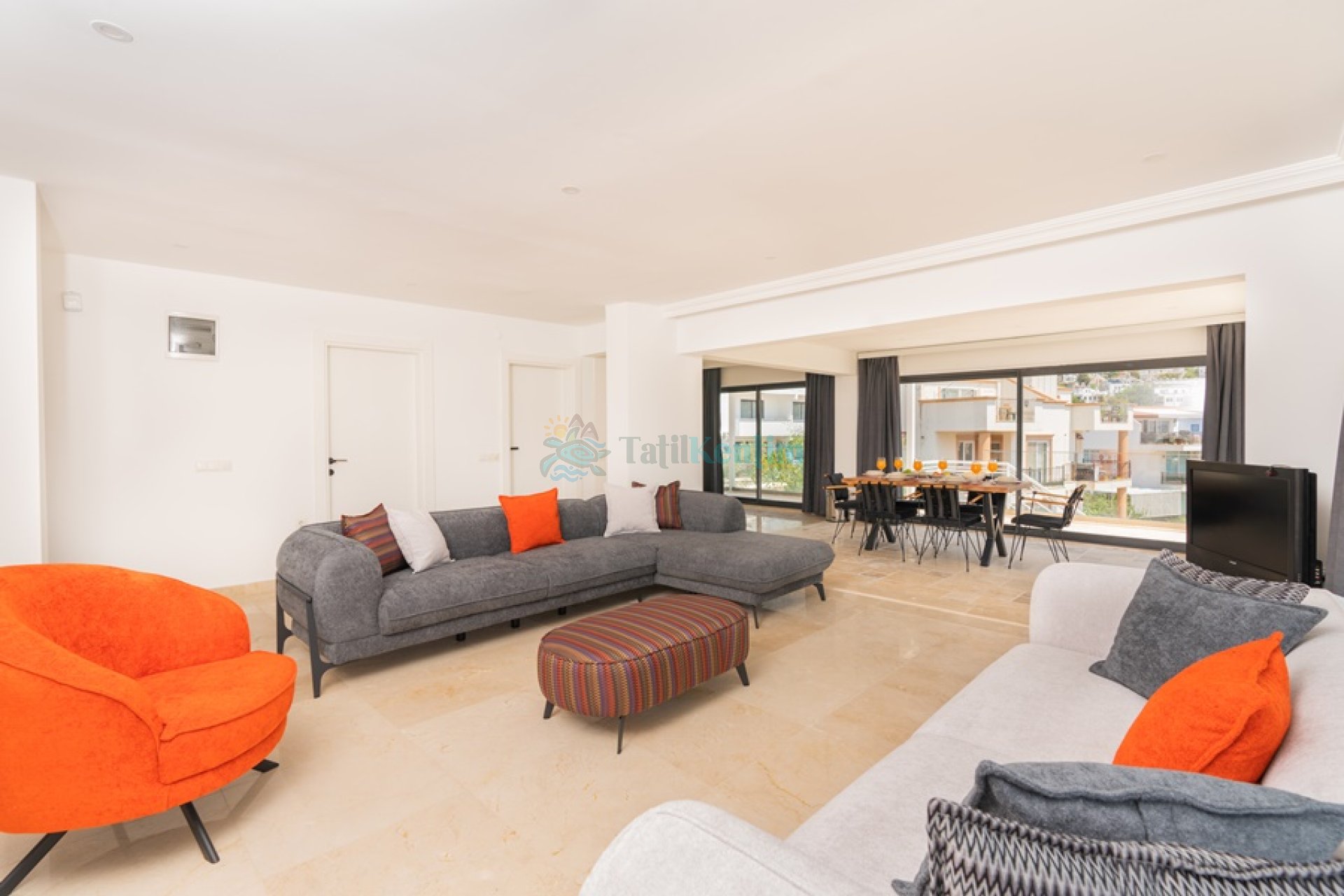 Salon: Villamızın geniş ve ferah salon katı içerisinde oturma grubu, LCD TV, yemek masası, kablosuz modem, uydu, sehpa, ütü, ütü masası, elektrik süpürgesi, klima, banyo ve tuvalet bulunmaktadır. Salondan havuz terasına direk çıkış yapılabilmektedir.