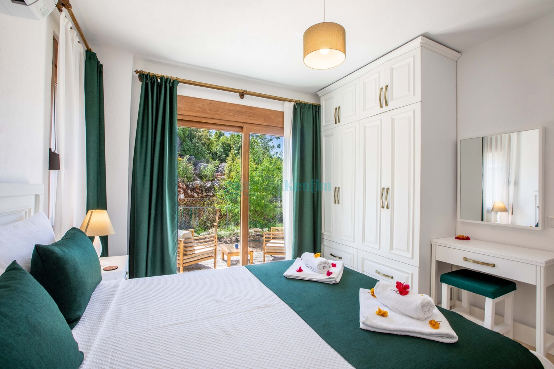 2.Yatak odası: Yatak odası içerisinde, 1 adet çift kişilik yatak, klima, elbise dolabı, komodin, makyaj masası, banyo ve tuvalet yer almaktadır.