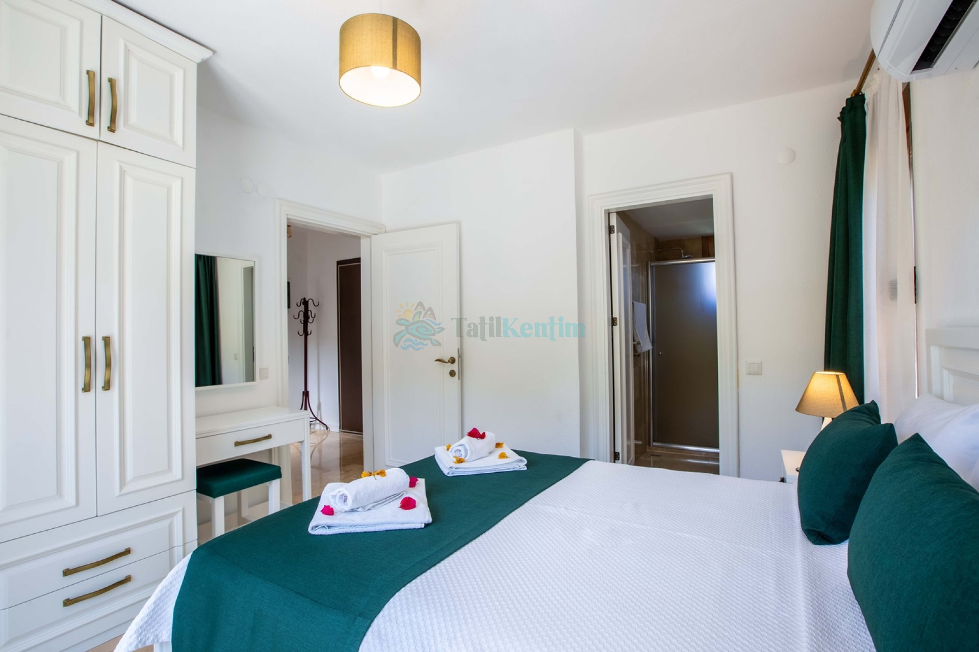 1.Yatak odası: Yatak odası içerisinde, 1 adet çift kişilik yatak, klima, elbise dolabı, komodin, makyaj masası, banyo ve tuvalet yer almaktadır.