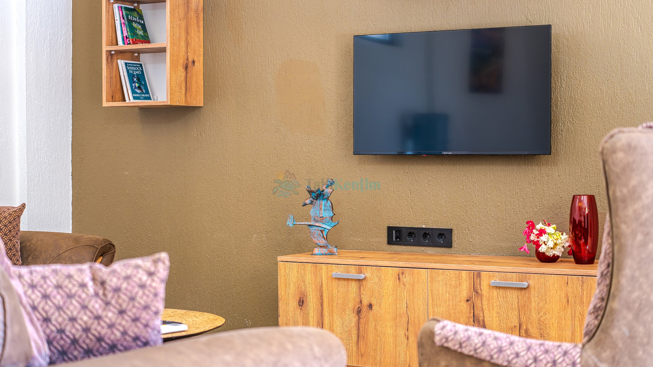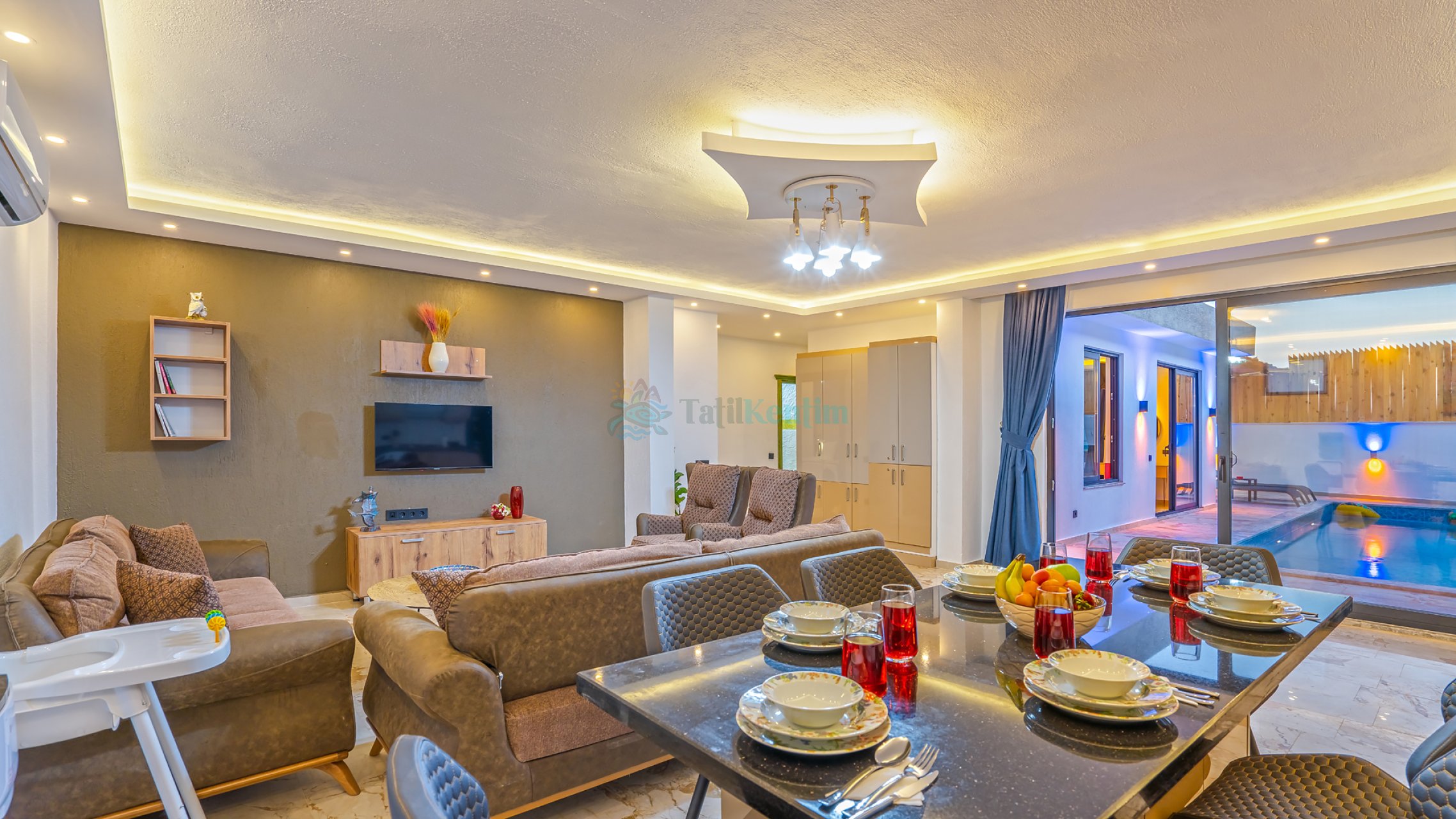 Salon : Modern ve konforlu olarak oturabileceğiniz şekilde tasarlanan salonda 4 kişilik yemek masası, lüks bir oturma grubu ve LCD TV bulunmaktadır.