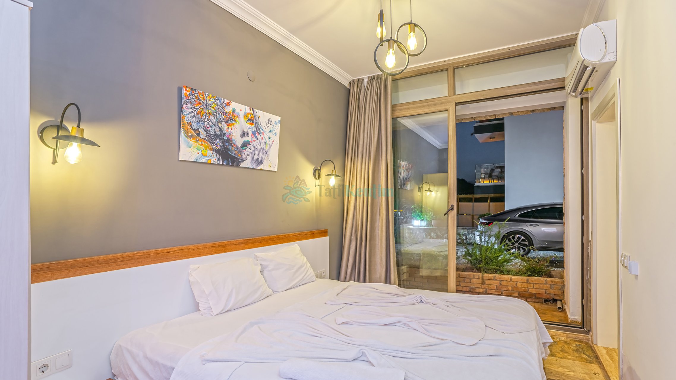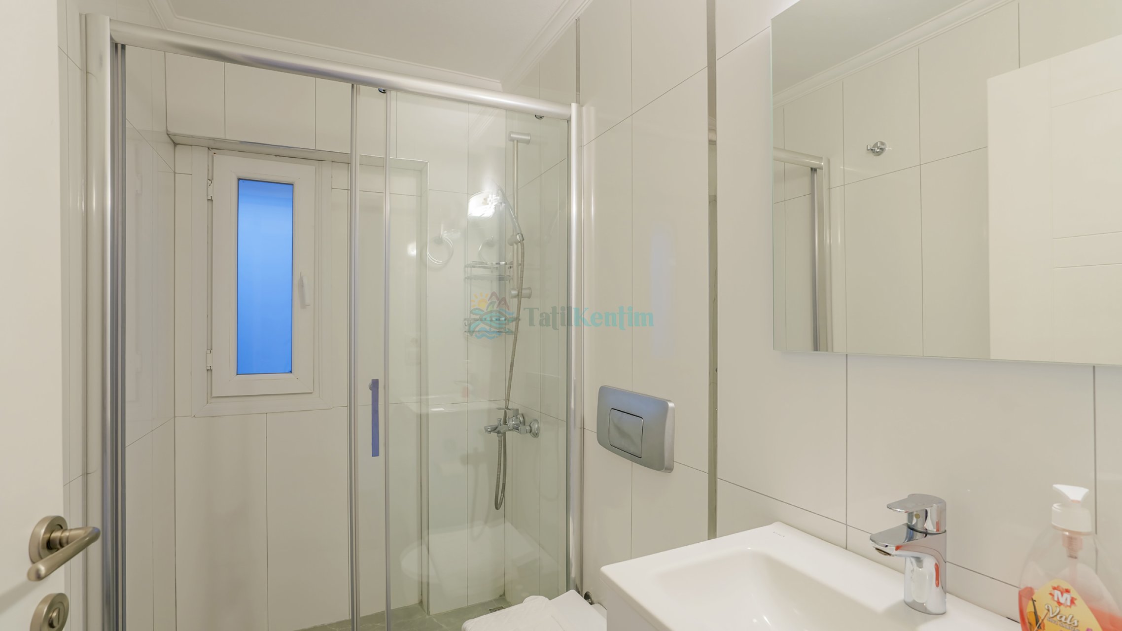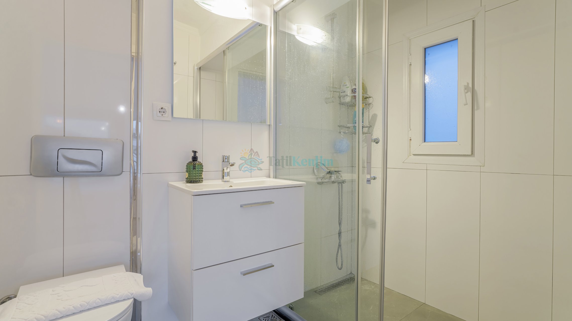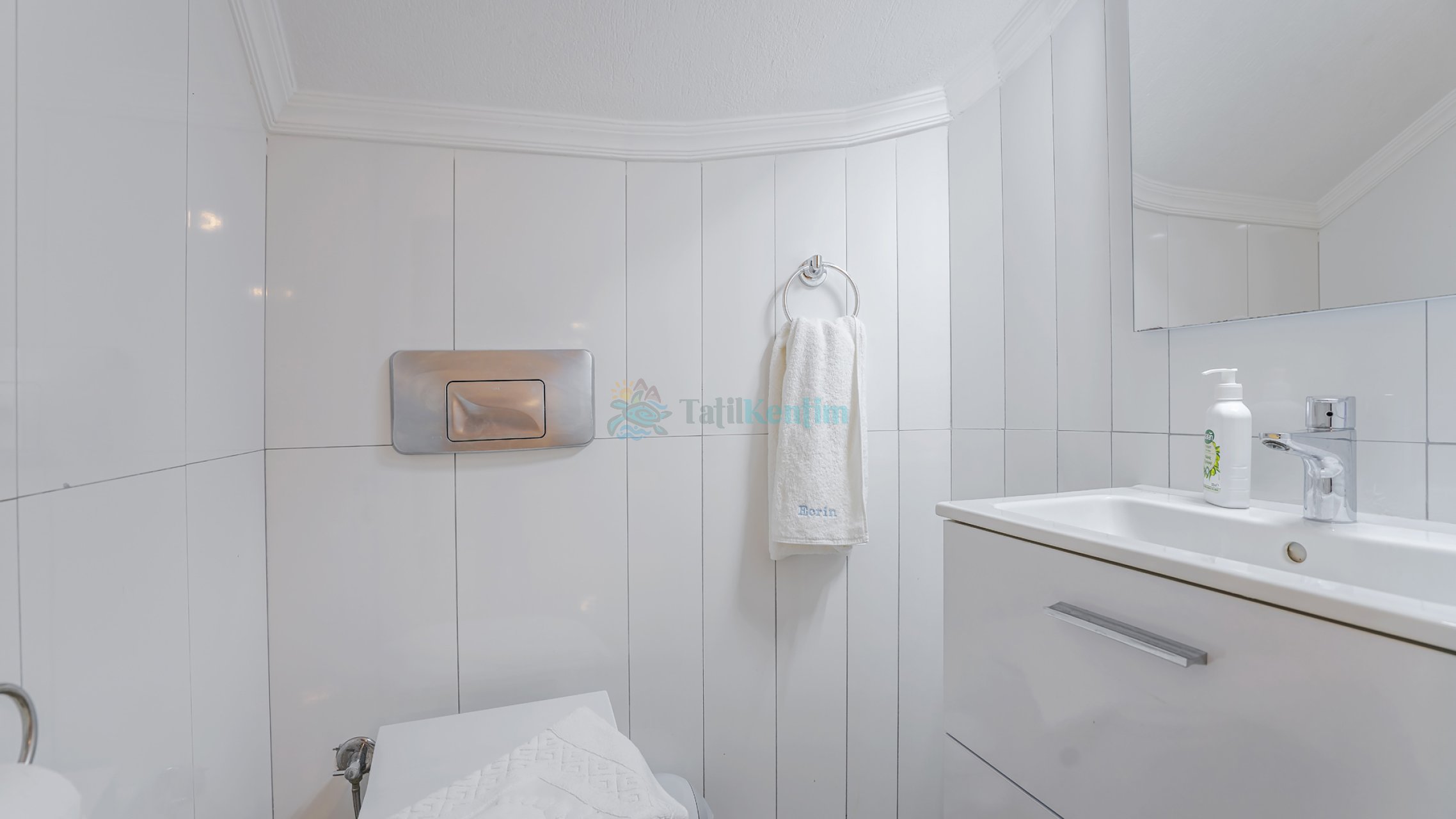 Kiralık villanın bu yatak odasında 1 adet çift kişilik yatak, klima, elbise dolabı, komodin, makyaj masası banyo ve tuvalet bulunmaktadır.
