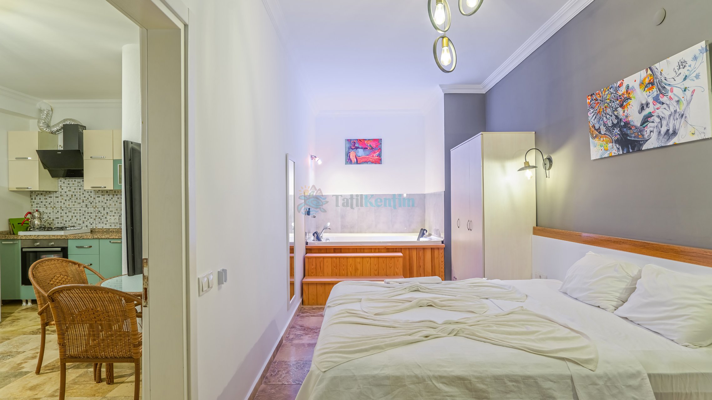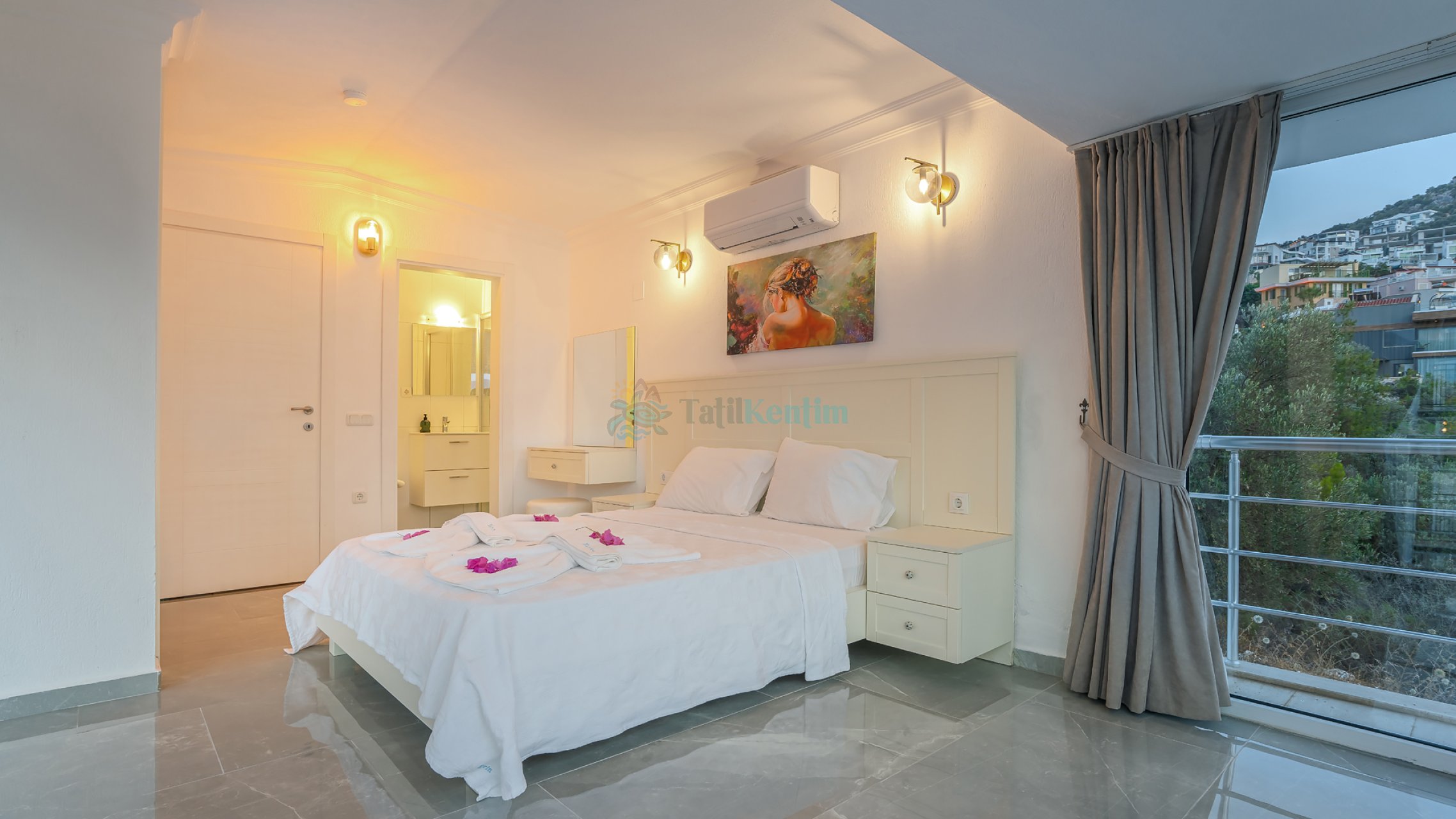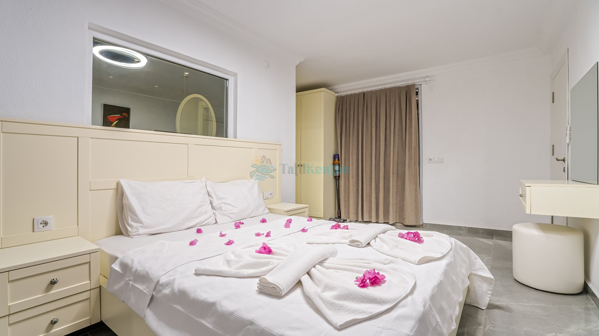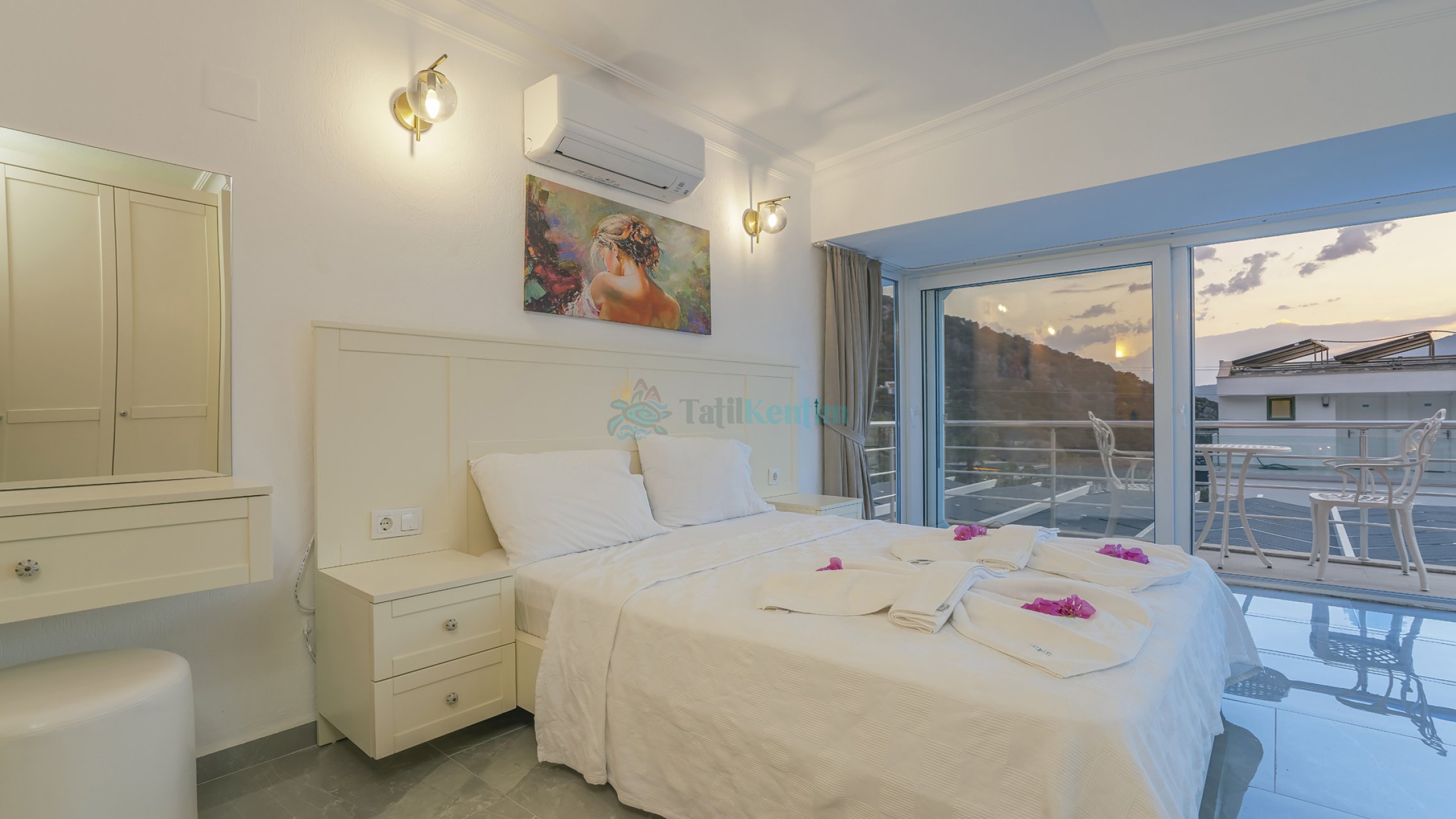 Tatil villamıza ait bu yatak odası içerisinde, 1 adet çift kişilik yatak, klima, elbise dolabı, komodin, makyaj masası, jakuzi, banyo ve tuvalet alanları bulunmaktadır.