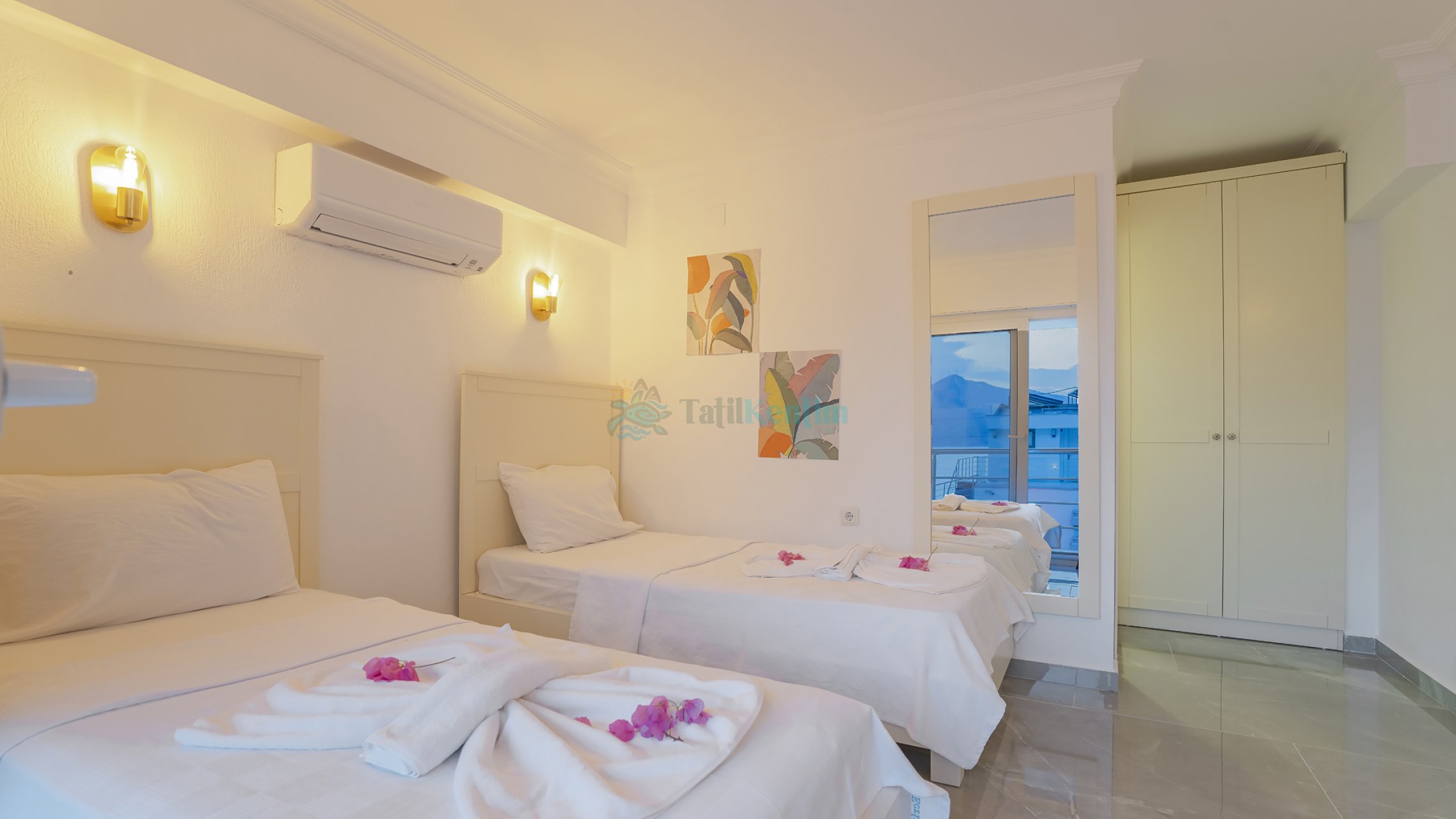 Kiralık villanın bu yatak odası içerisinde, 2 adet tek kişilik yatak, klima, elbise dolabı, komodin, makyaj masası, tuvalet ve banyo bulunmaktadır.