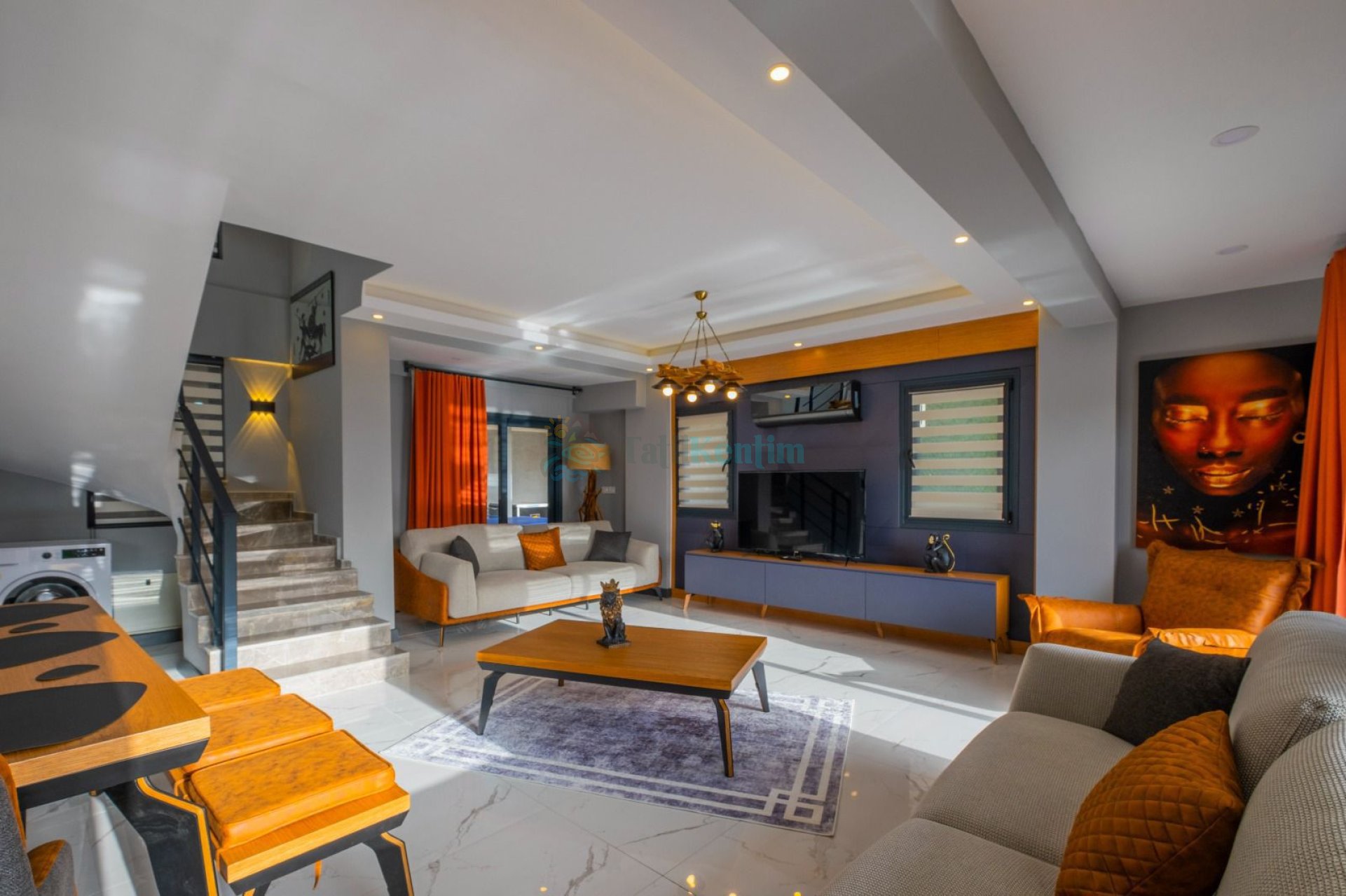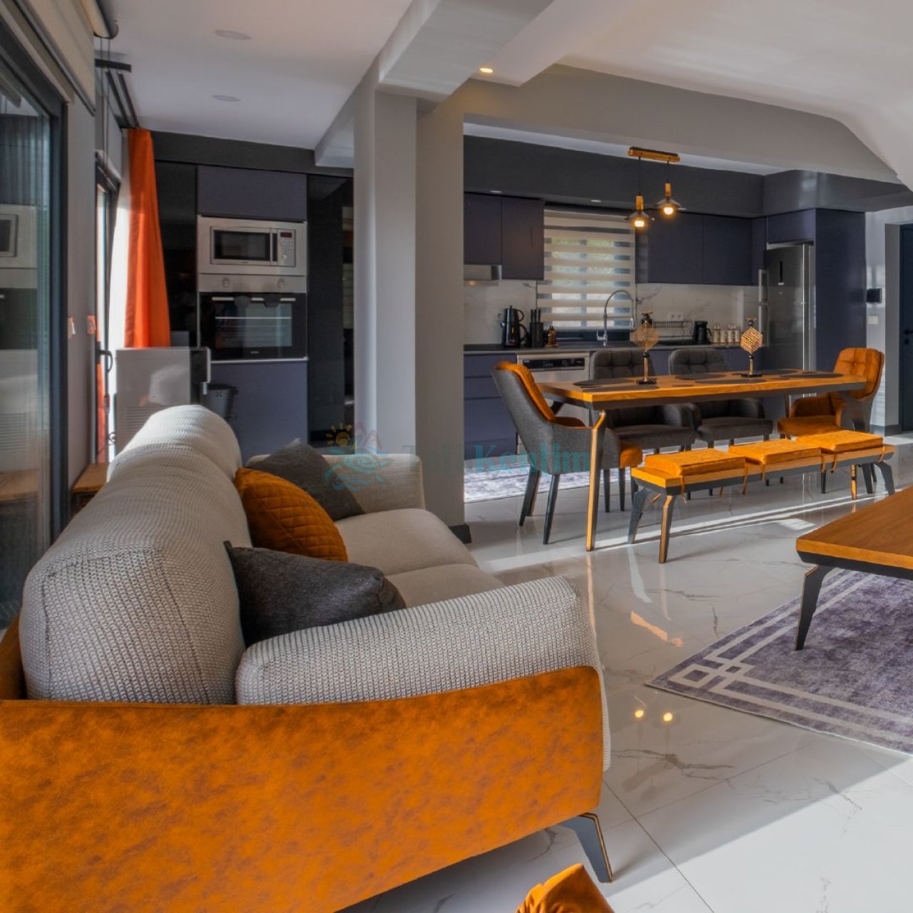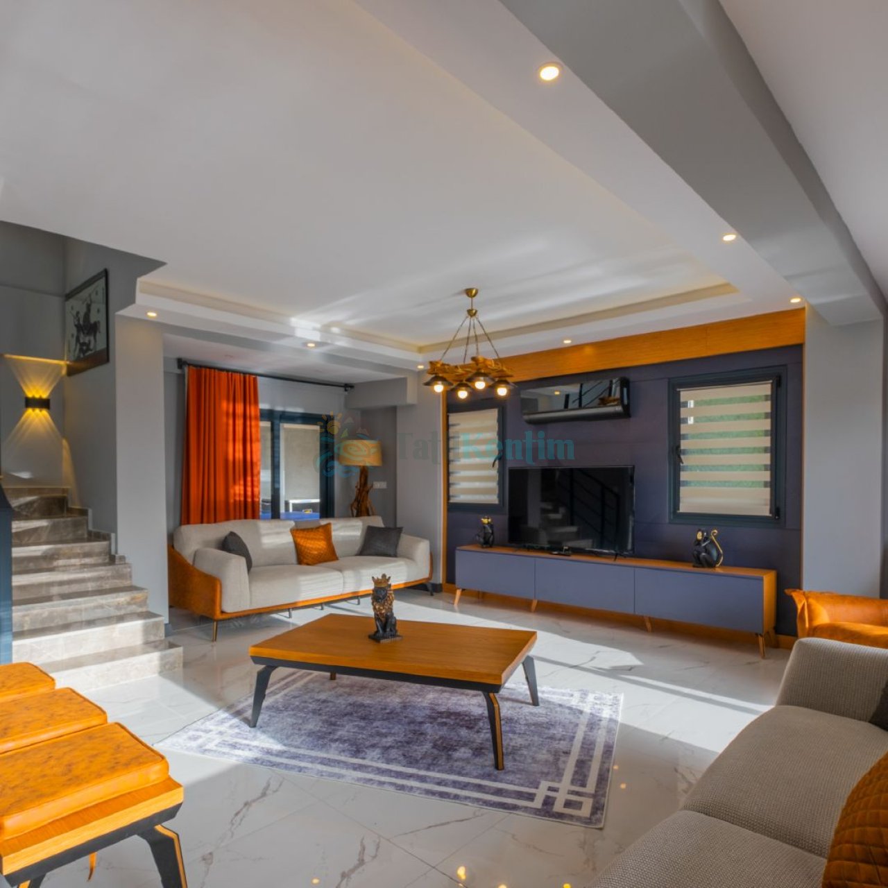Villamızın salonu içerisinde, koltuk takımı, orta sehpa, TV, TV ünitesi, klima, uydu alıcısı yer almaktadır.