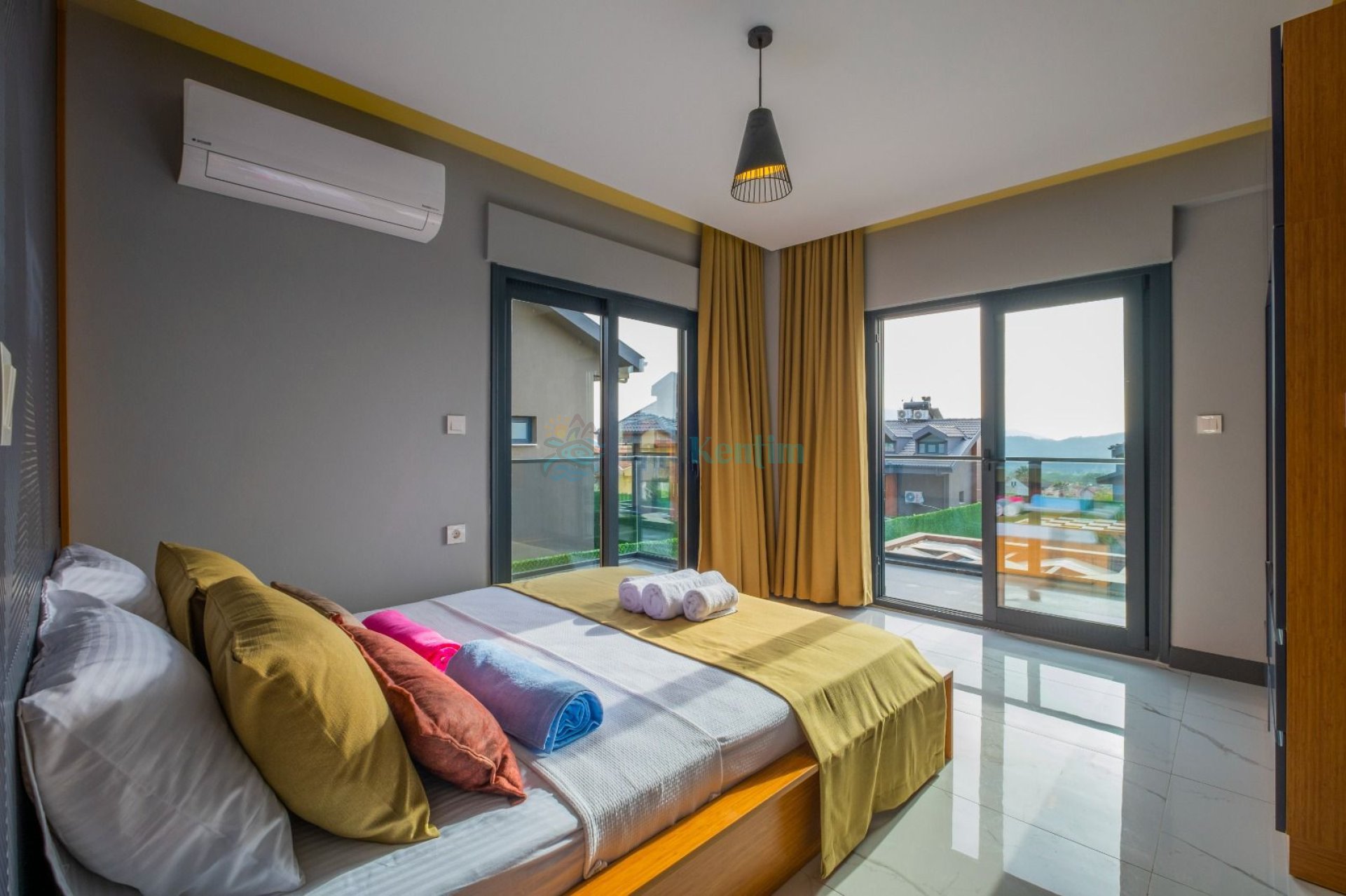 Kiralık villanın bu yatak odası içerisinde, 1 adet çift kişilik yatak, klima, elbise dolabı, komodin, makyaj masası, banyo ve tuvalet bulunmaktadır.