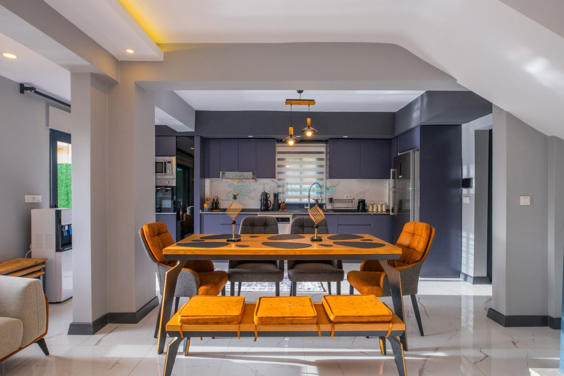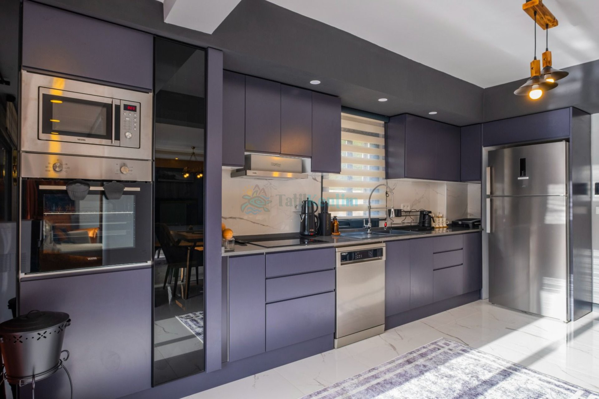 Yazlığımızın Amerikan mutfağı içerisinde, buzdolabı, bulaşık makinası, çamaşır makinası, yemek masası, yemek takımı, ankastre fırın, tost makinası, ankastre ocak, çaydanlık, su ısıtıcısı, tava, tencere takımı ve gerekli olan tüm mutfak gereçleri yer almaktadır.