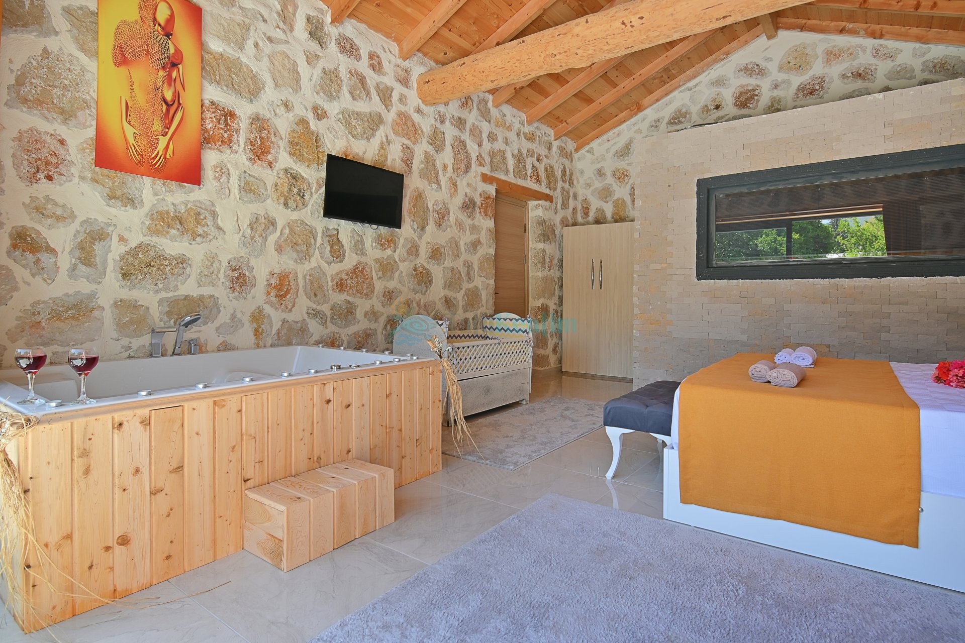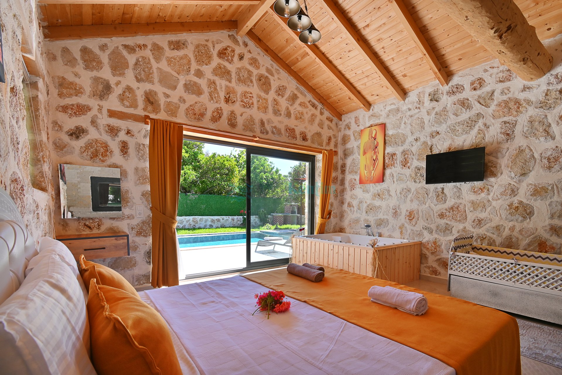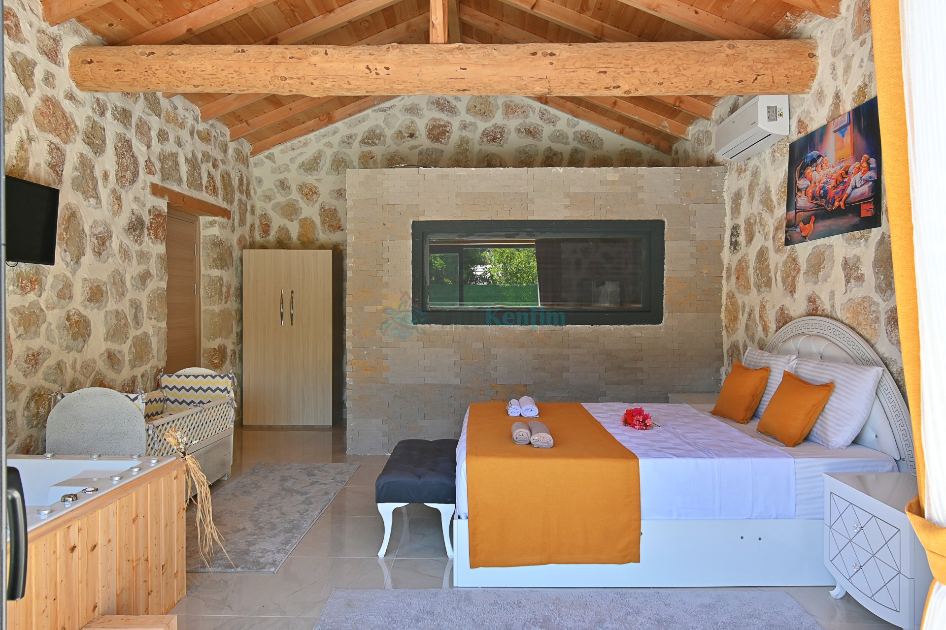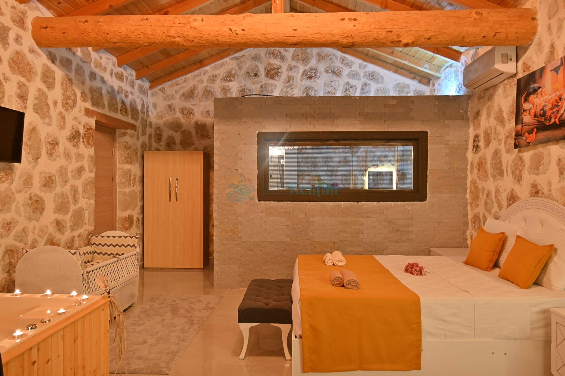 1 Adet çift kişilik yatak, makyaj masası, jakuzi, klima, televizyon, komodin, elbise dolabı, ebevyn banyosu bulunmaktadır.