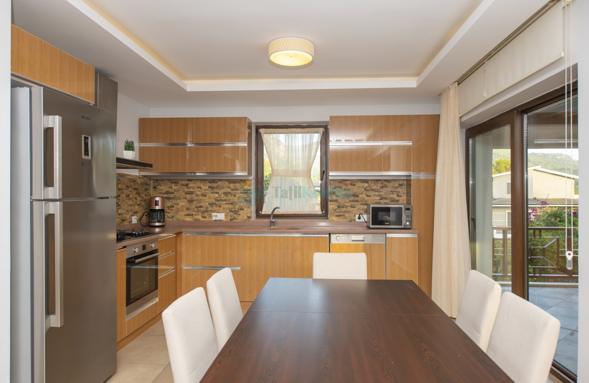 Yazlığımızın Amerikan mutfağı içerisinde, buzdolabı, bulaşık makinası, çamaşır makinası, yemek masası, yemek takımı, ankastre fırın, tost makinası, ankastre ocak, çaydanlık, su ısıtıcısı, tava, tencere takımı ve gerekli olan tüm mutfak gereçleri yer almaktadır.