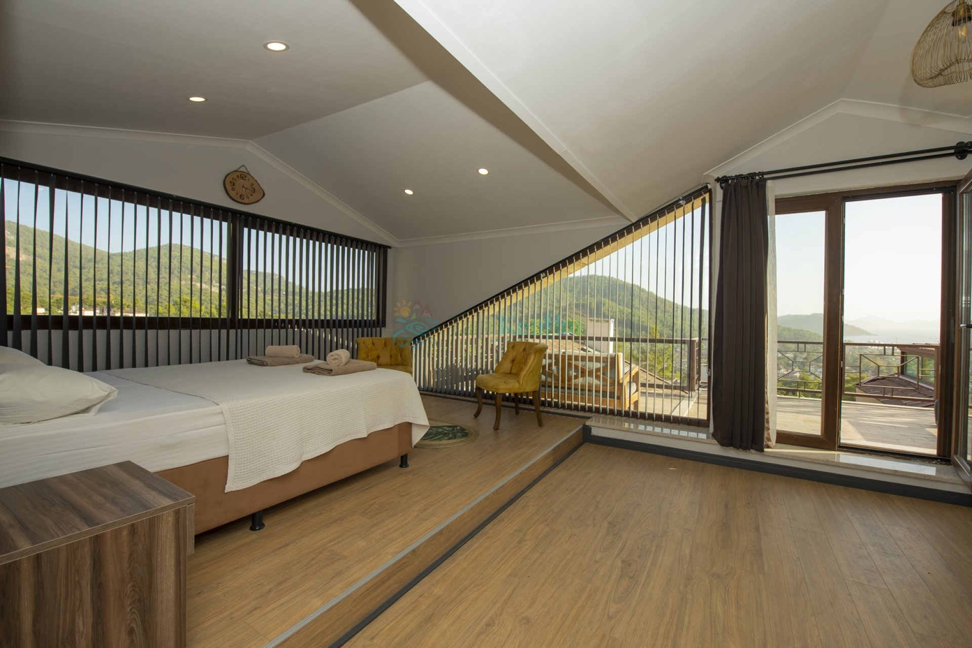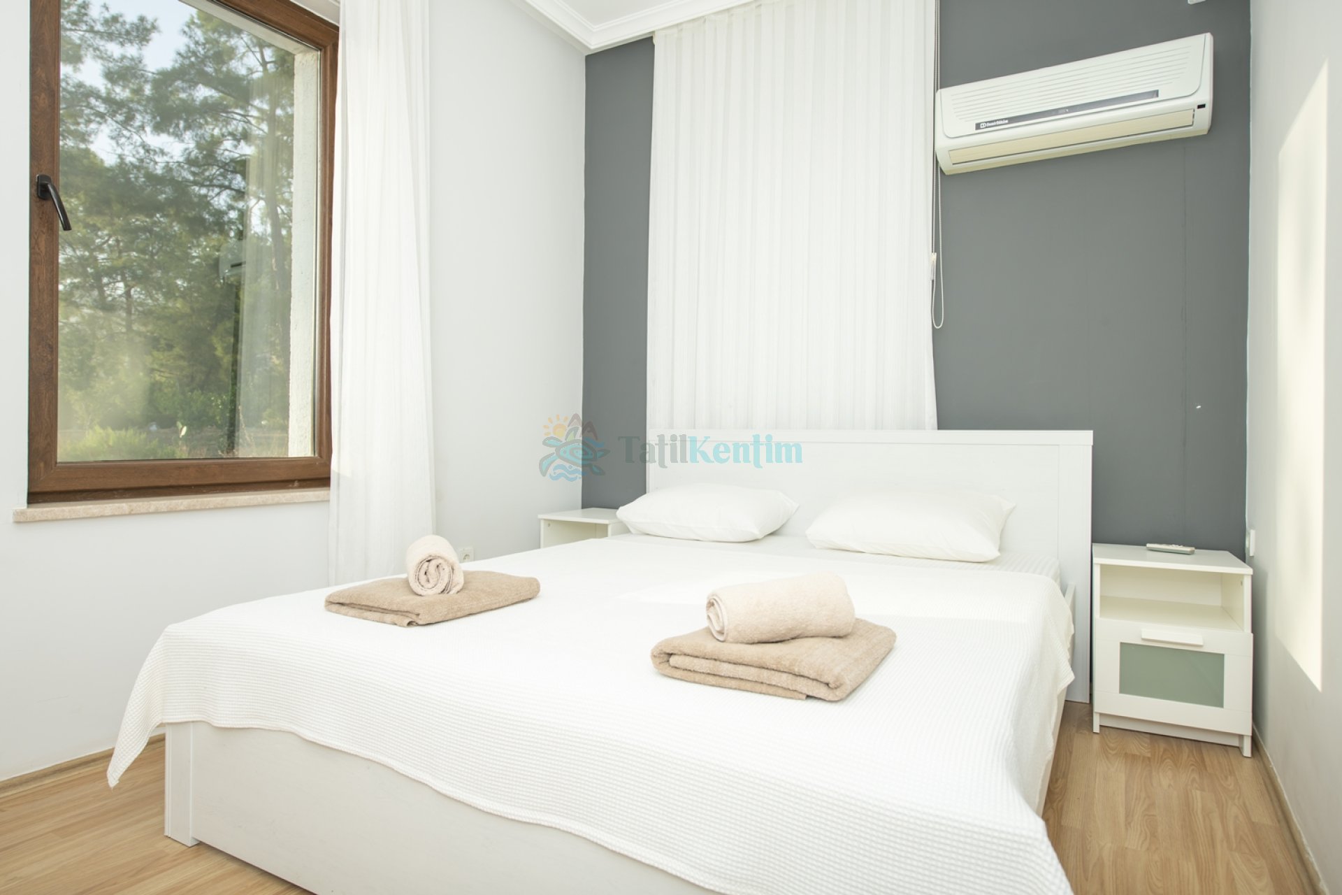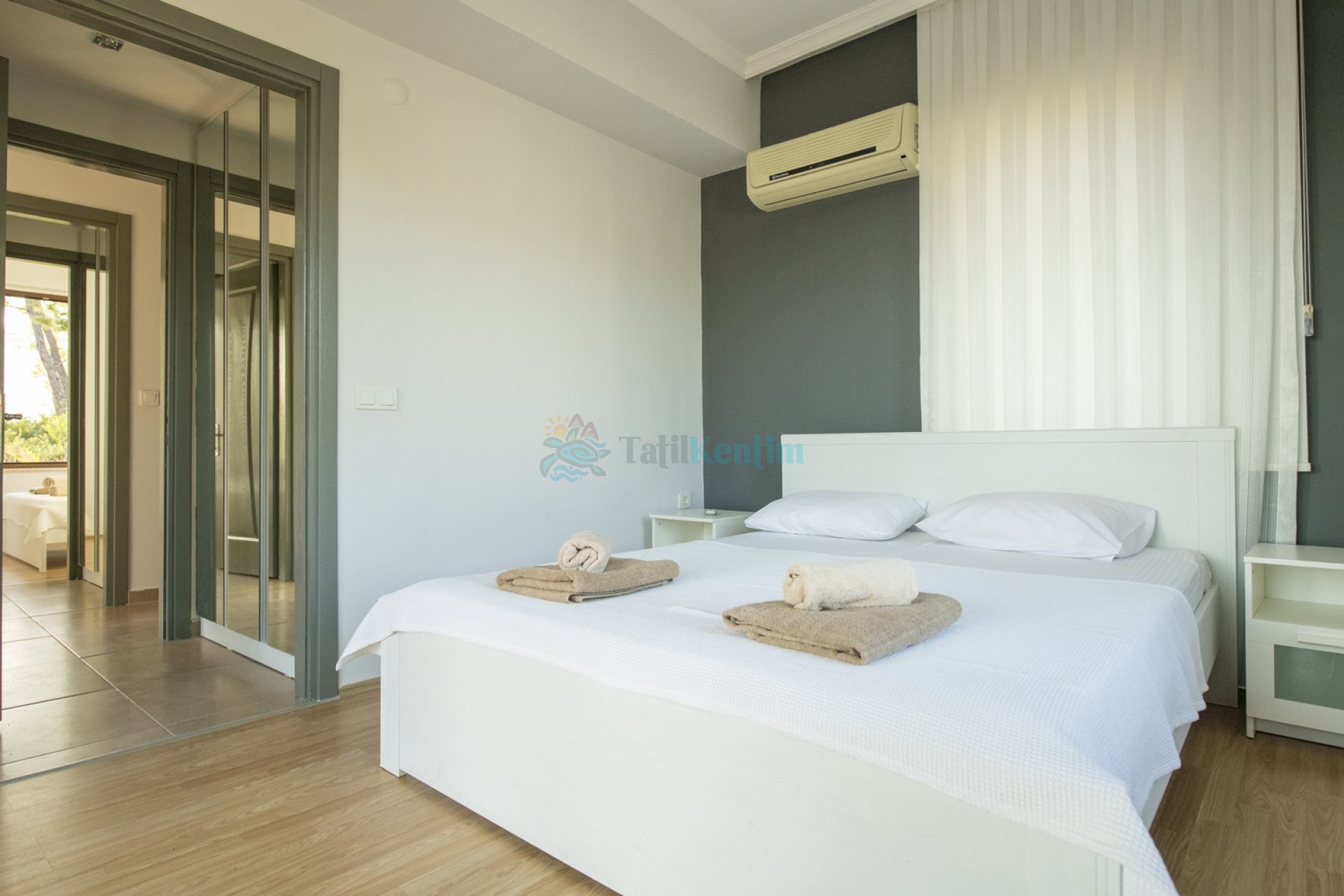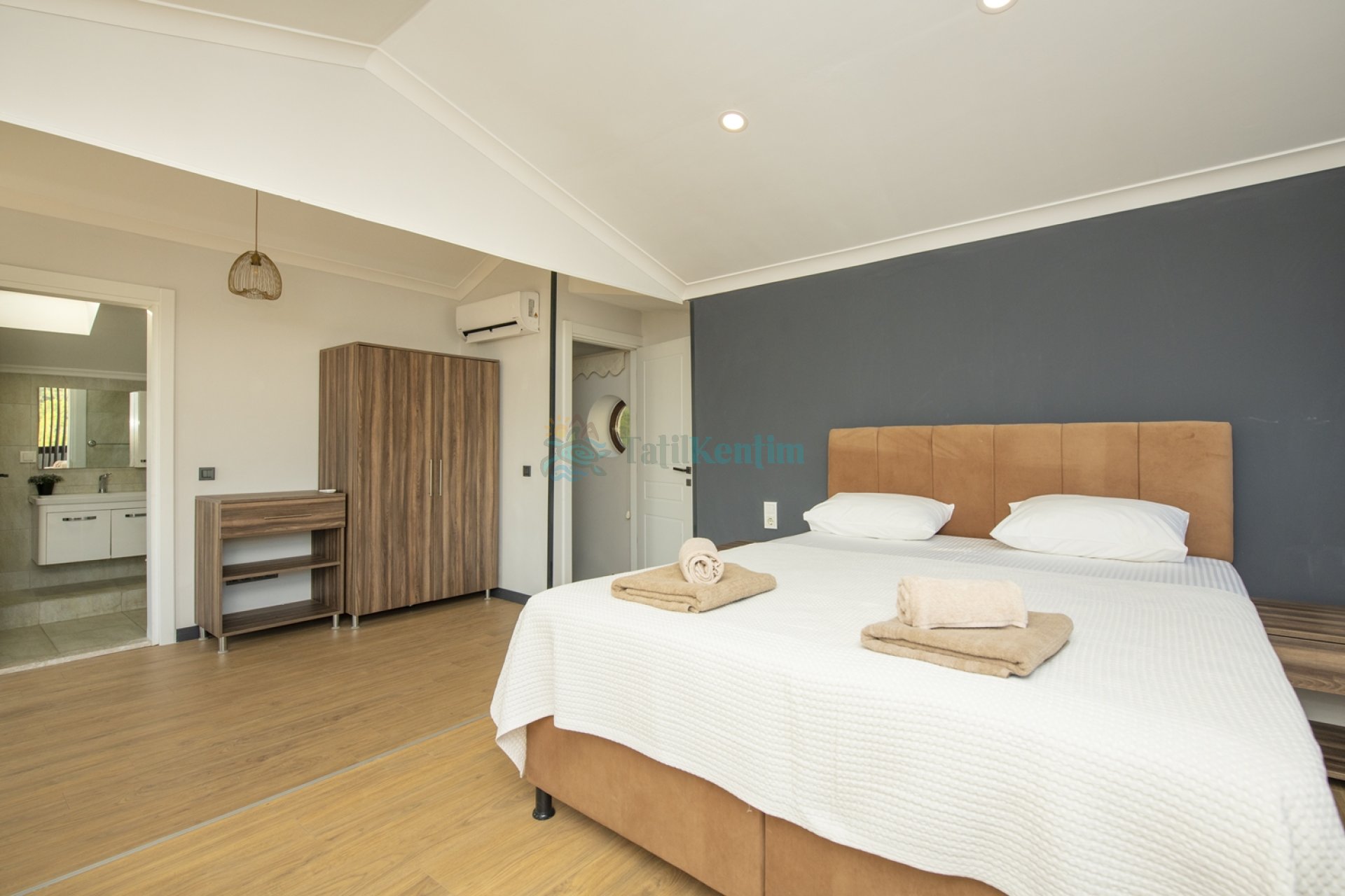 Kiralık villanın bu yatak odası içerisinde, 1 adet çift kişilik yatak, klima, elbise dolabı, komodin, makyaj masası, banyo ve tuvalet bulunmaktadır.