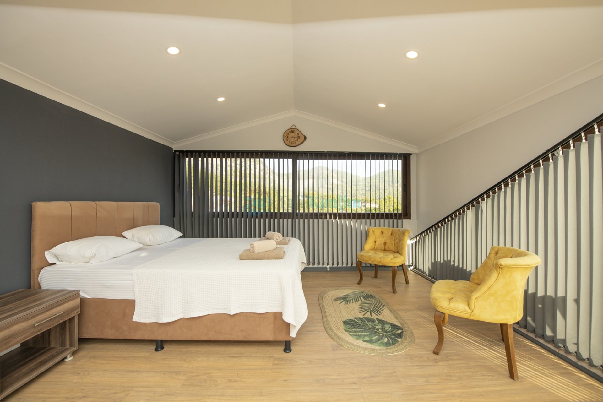 Villamızın bu odasında 1 adet çift kişilik yatak , klima , elbise dolabı, komodin, makyaj masası, banyo ve tuvalet bulunmaktadır.