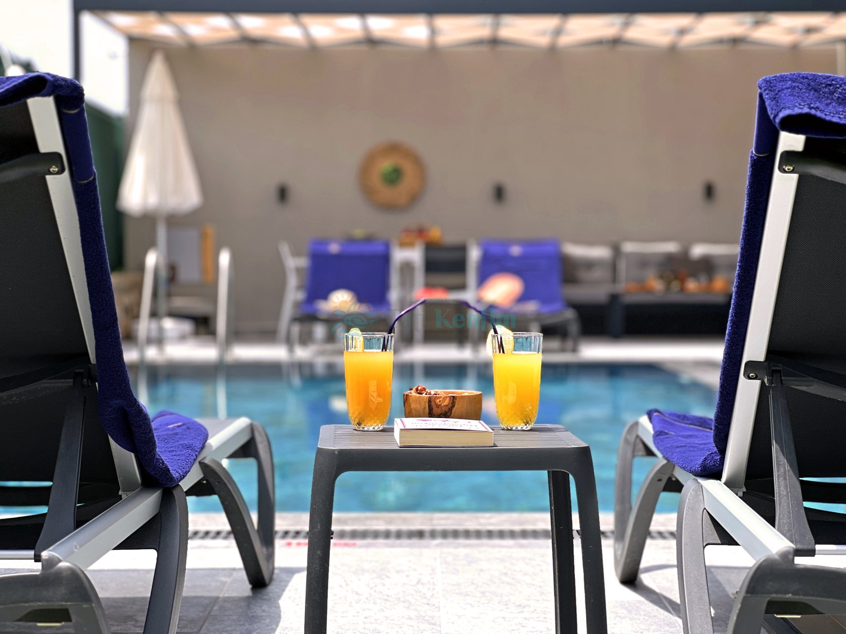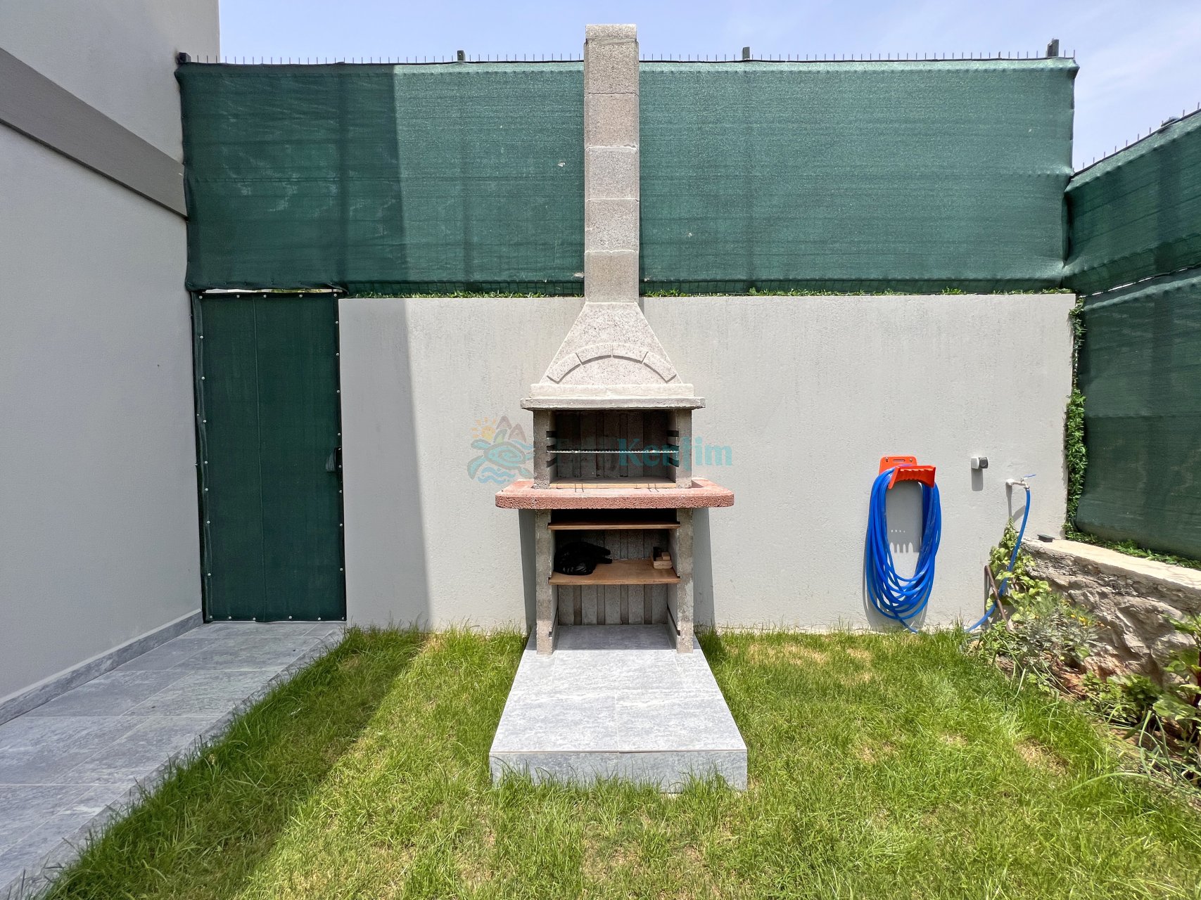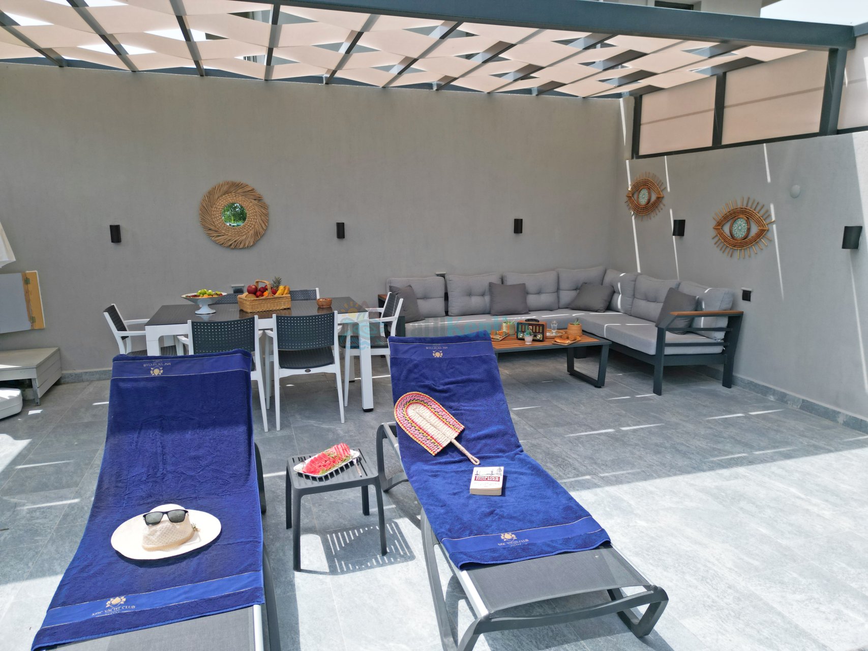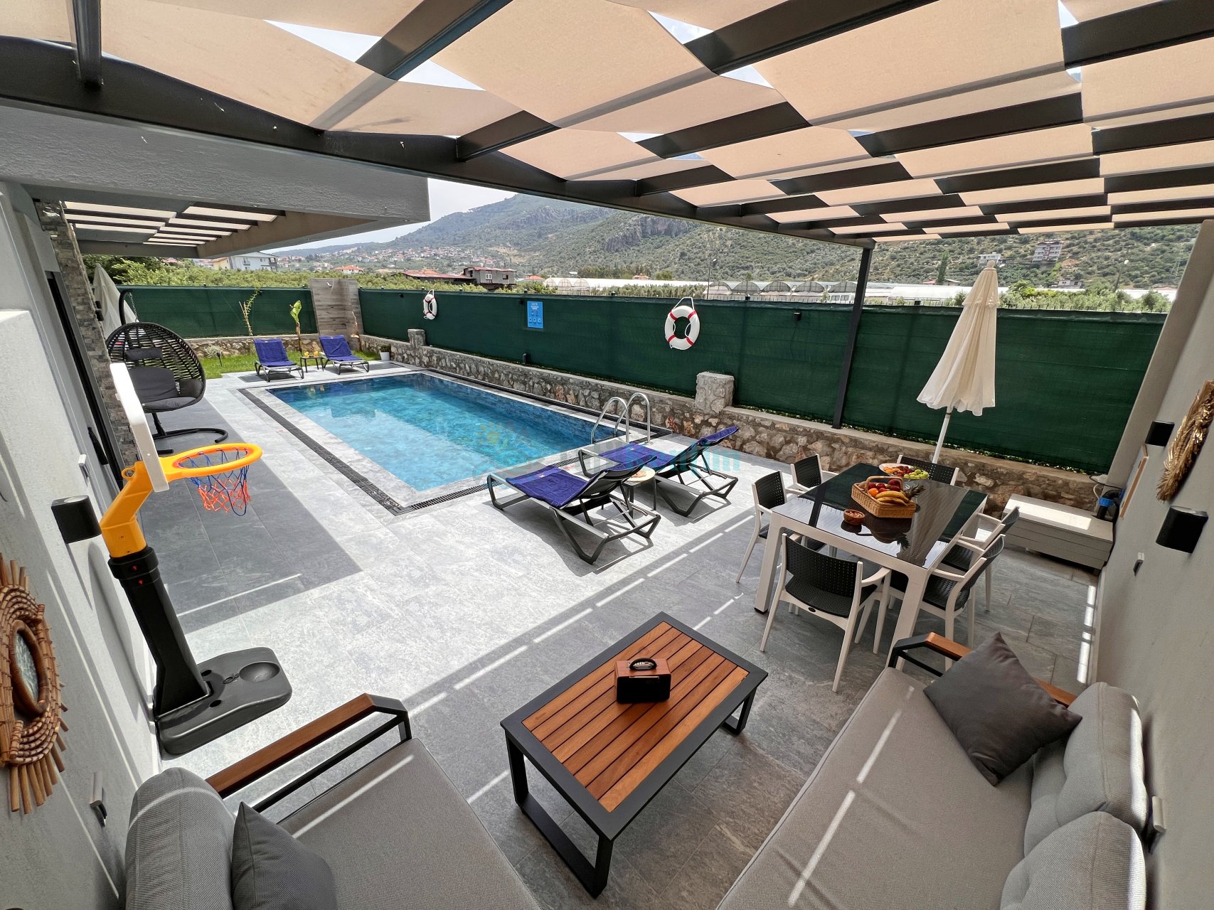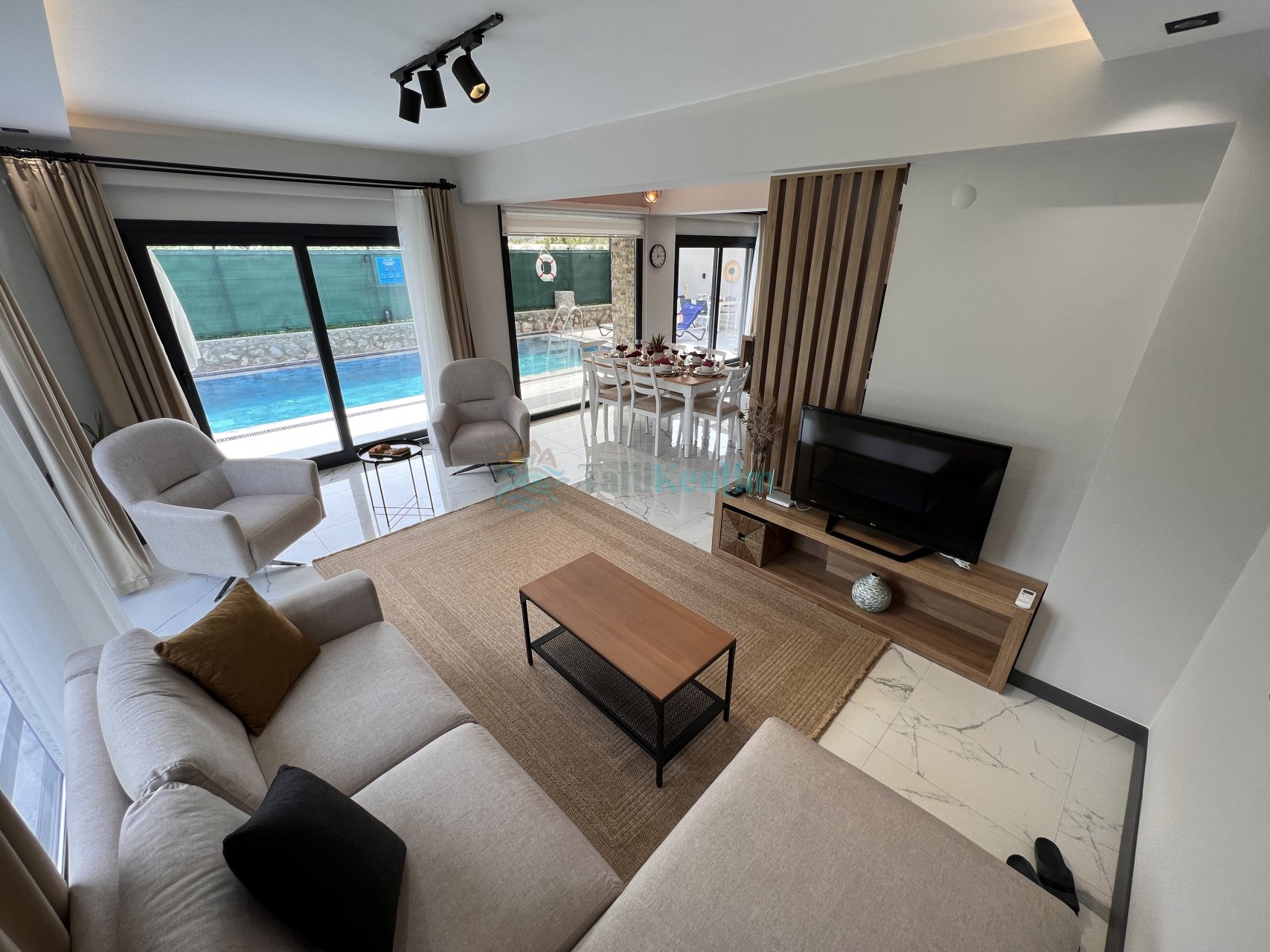 Salon: Villamızın geniş ve ferah salon katı içerisinde oturma grubu, LCD TV, yemek masası, kablosuz modem, uydu, sehpa, ütü, ütü masası, elektrik süpürgesi, klima, banyo ve tuvalet bulunmaktadır. Salondan havuz terasına direk çıkış yapılabilmektedir.