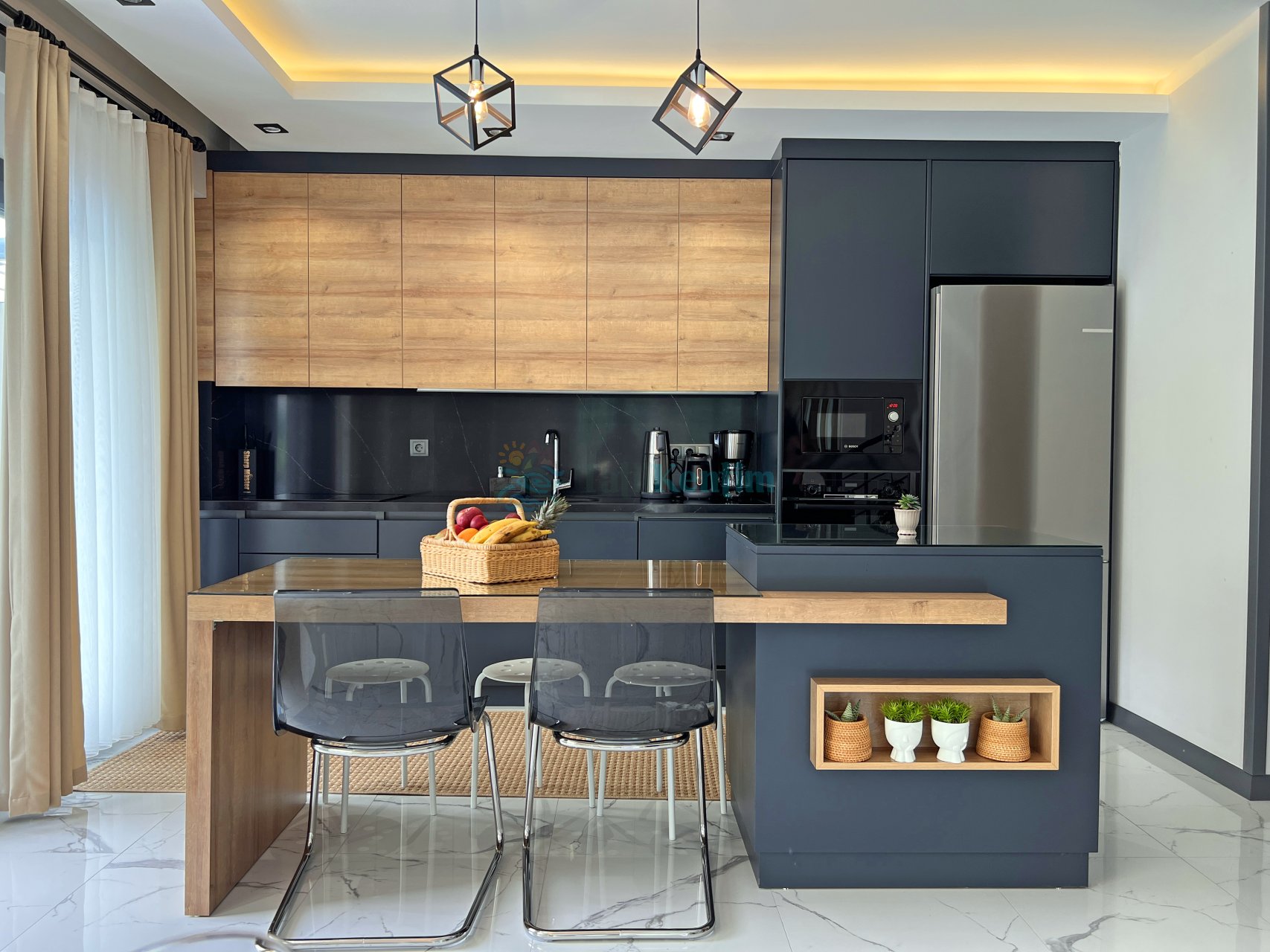 Mutfak: Modern Amerikan mutfak içerisinde ankastre 4lü ocak, ankastre fırın, mikrodalga fırın, yemek masası, tost makinesi, buzdolabı, bulaşık makinesi, ekmek kızartma makinesi, su ısıtıcısı, bardak takımı, yemek takımı, çatal-bıçak takımı, çamaşır makinesi, tavalar, tencereler ve diğer yemek pişirme ekipmanları bulunmaktadır.