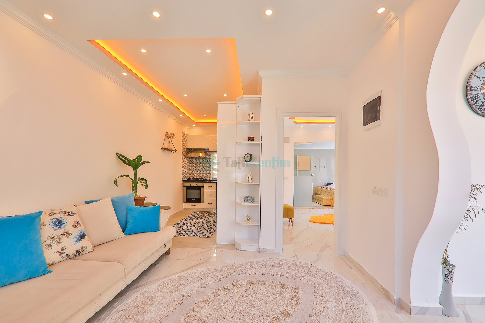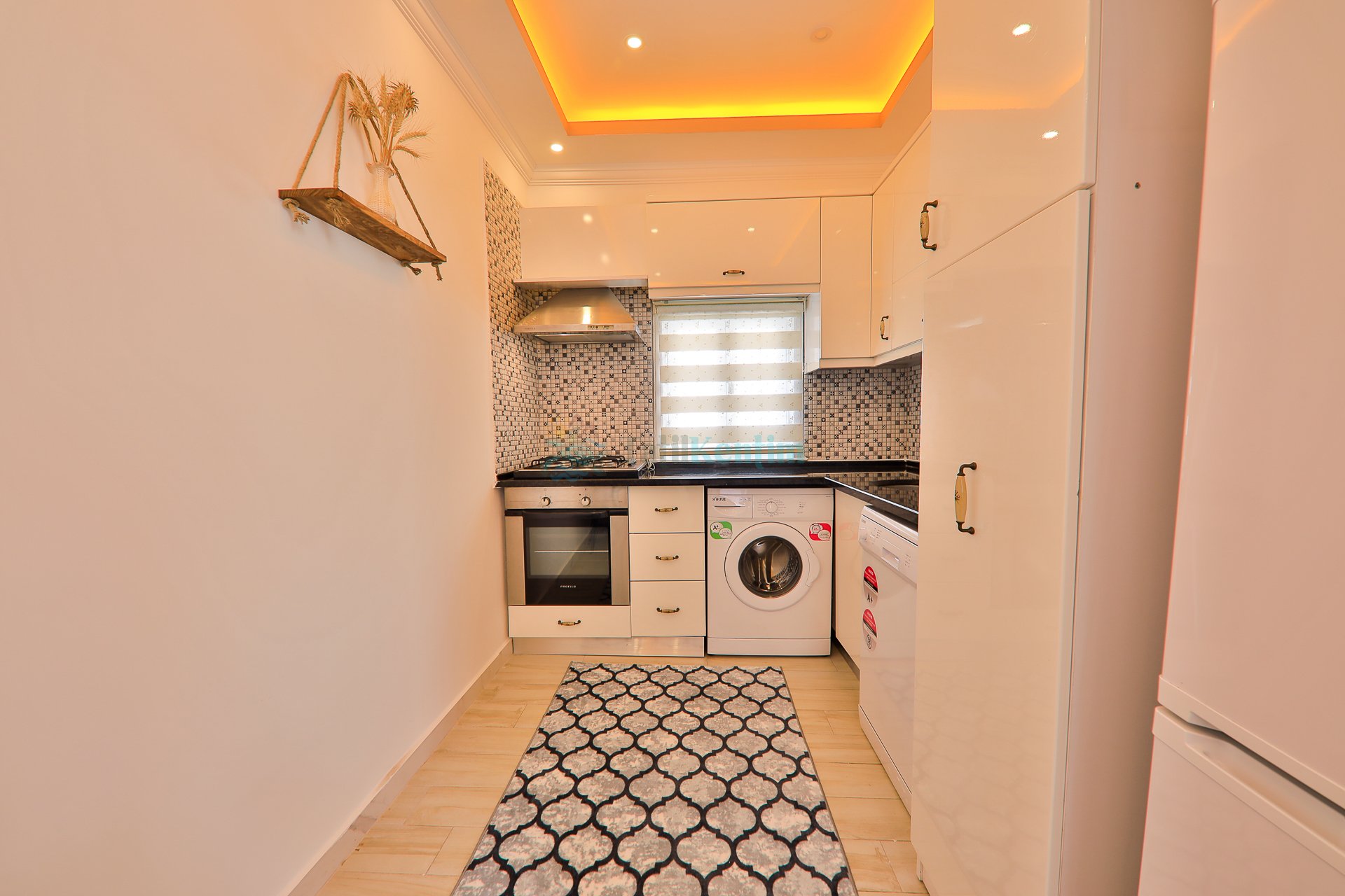 Amerikan mutfak içerisinde, buzdolabı, bulaşık makinası, çamaşır makinası, yemek masası, yemek takımı, ankastre fırın, tost makinası, ankastre ocak, çaydanlık, su ısıtıcısı, tava, tencere takımı ve gerekli olan tüm mutfak gereçleri yer almaktadır.