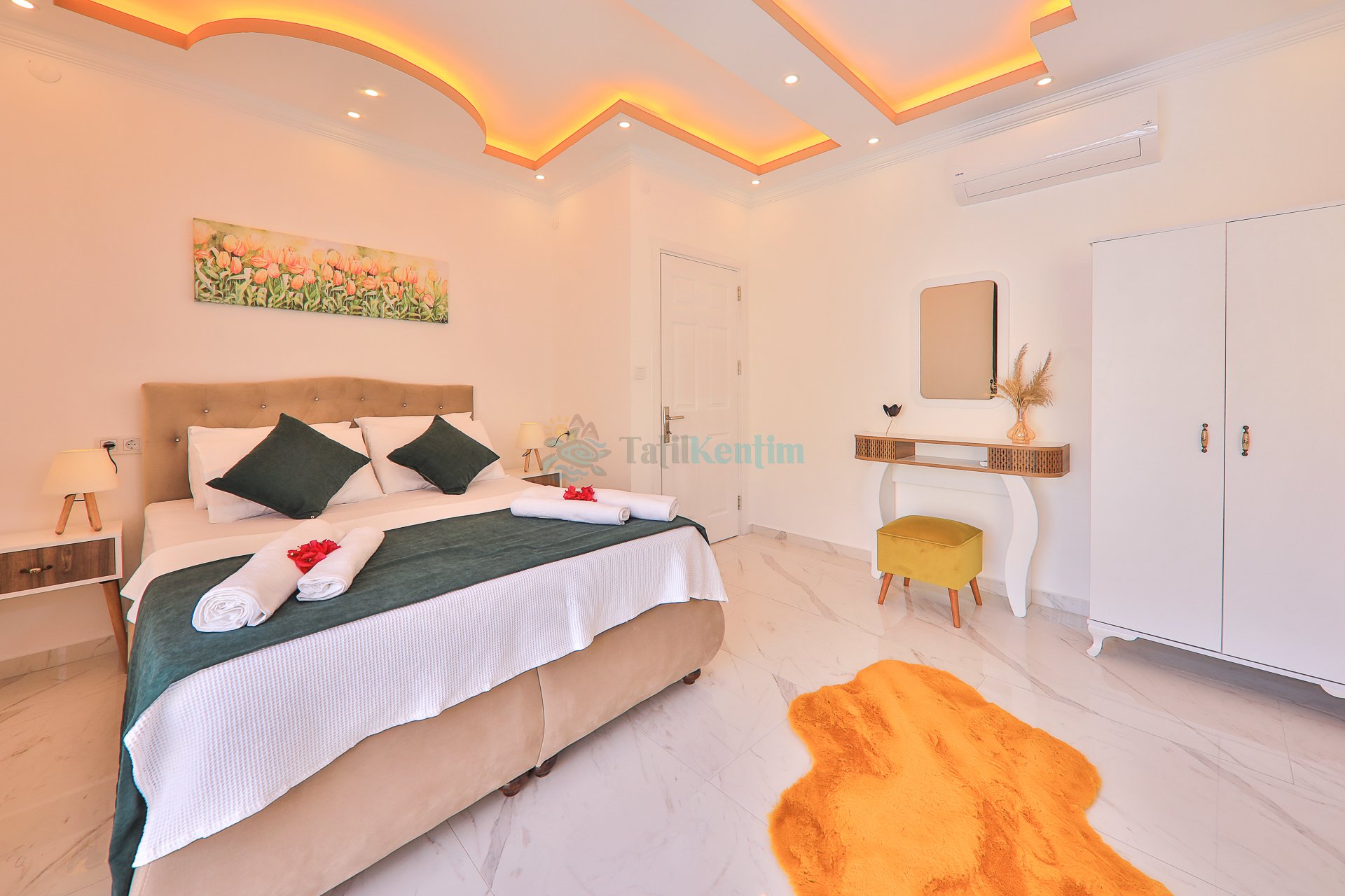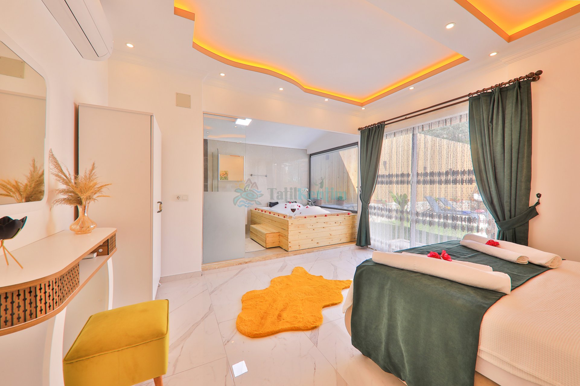 Yatak odası içerisinde, 1 adet çift kişilik yatak, klima, elbise dolabı, komodin, makyaj masası, jakuzi, banyo ve tuvalet yer almaktadır.