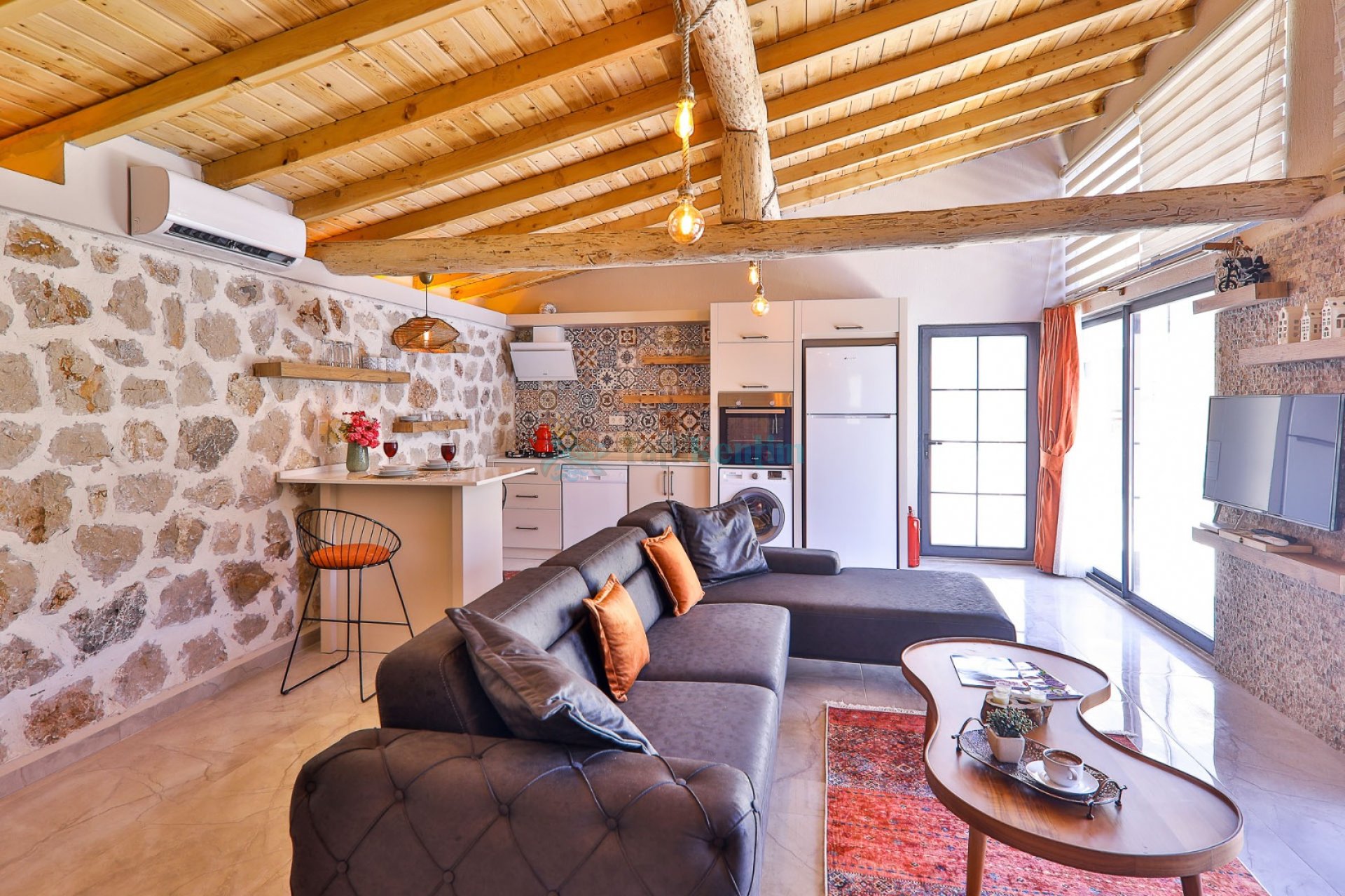 Villamızın salonu içerisinde, koltuk takımı, orta sehpa, TV, TV ünitesi, klima, uydu alıcısı yer almaktadır.